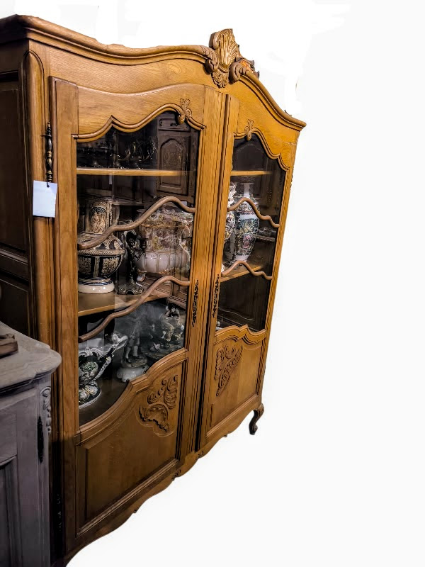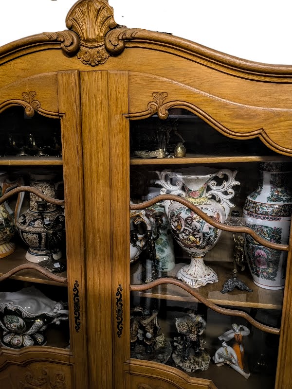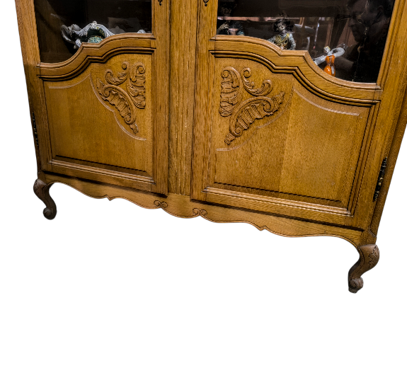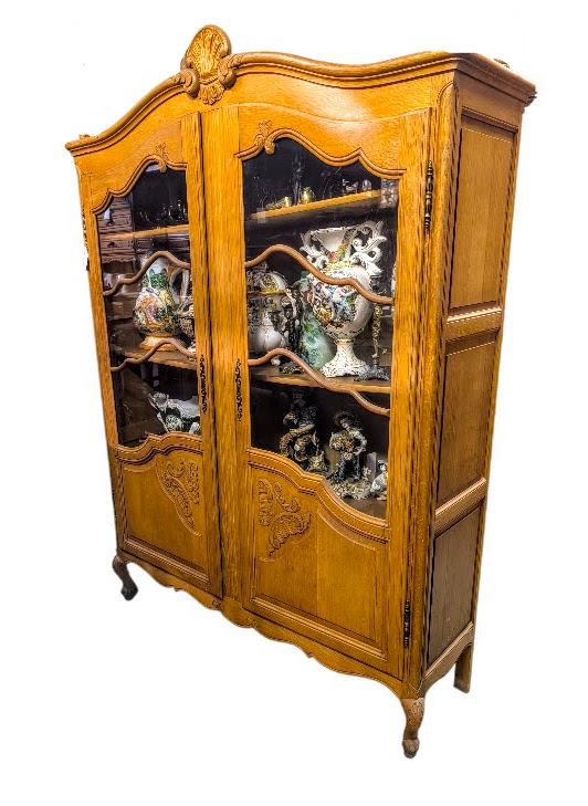 Eladó egy neobarokk stílusú vitrin vagy könyvszekrény szép állapotban. Kecses ívelt lábakkal, díszes betétekkel az ajtókon, üvegen fa betéttel. Tetejét csúcsdísz ékesíti,.Belül több polc is található melyek 3 cm-es osztásonként állíthatóak.