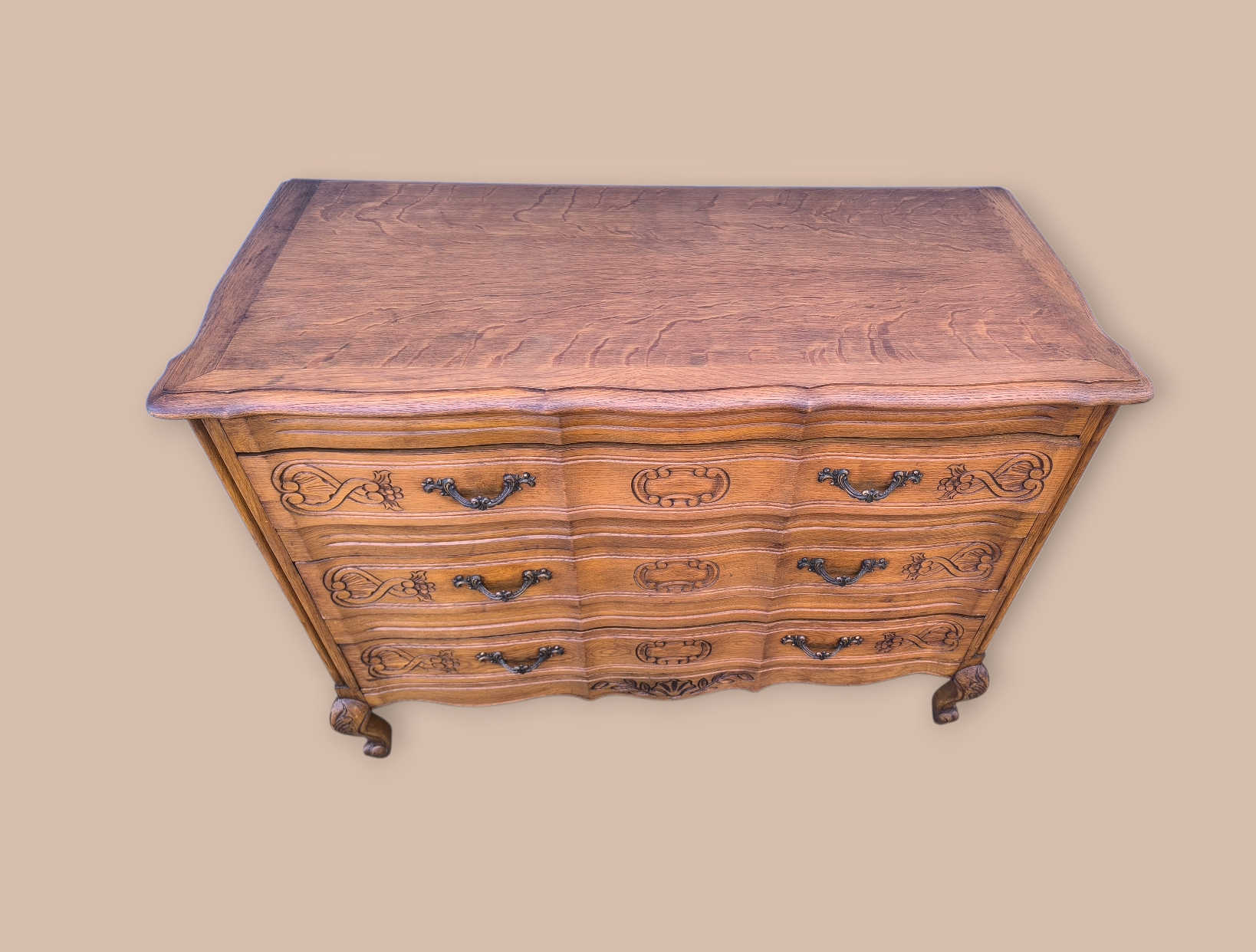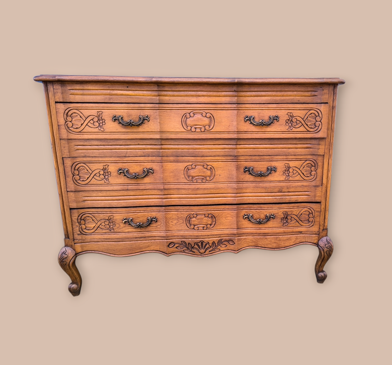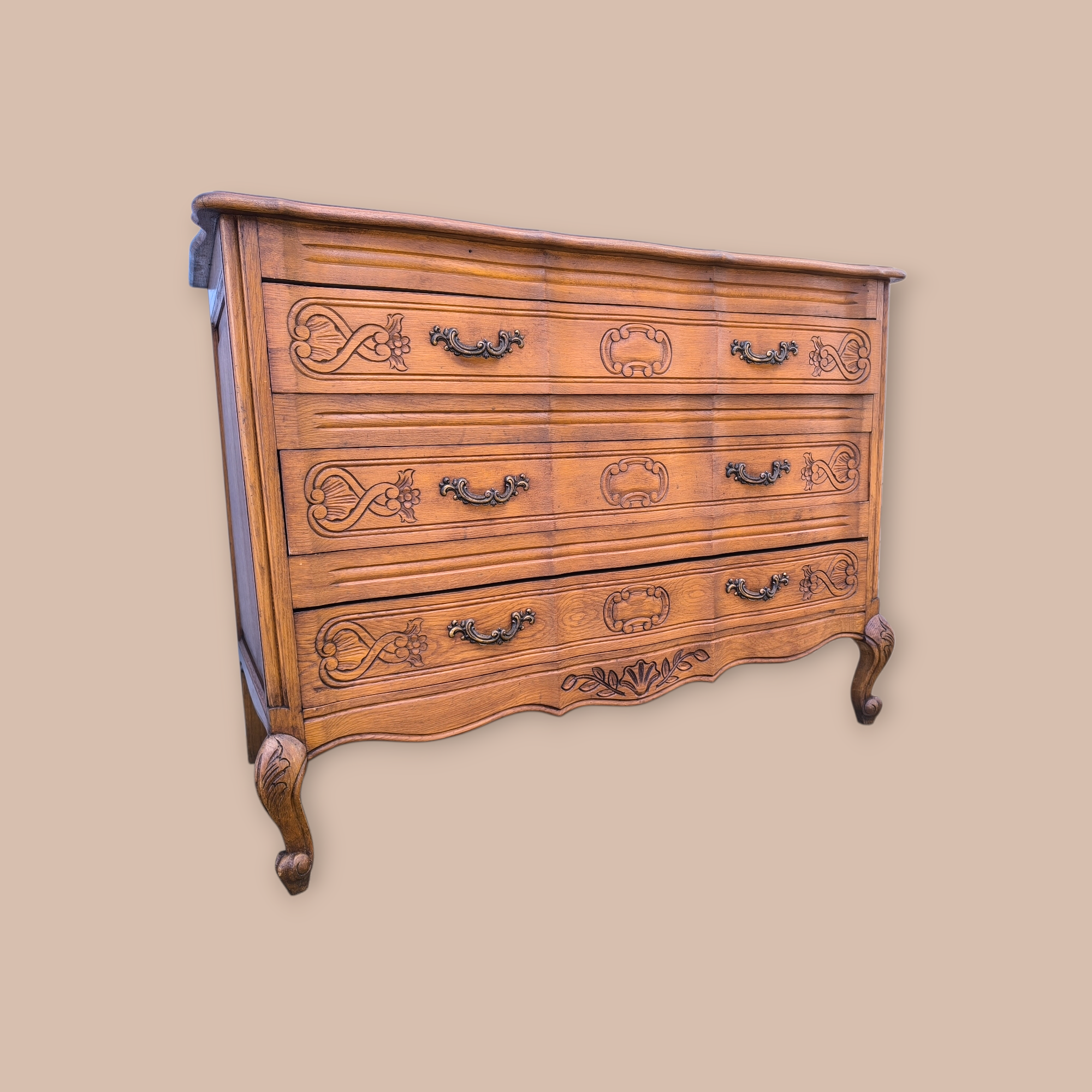 Eladó neobarokk három fiókos komód szép állapotban. Díszes fiókokkal, magasabb, kecses lábakkal rendelkezik.