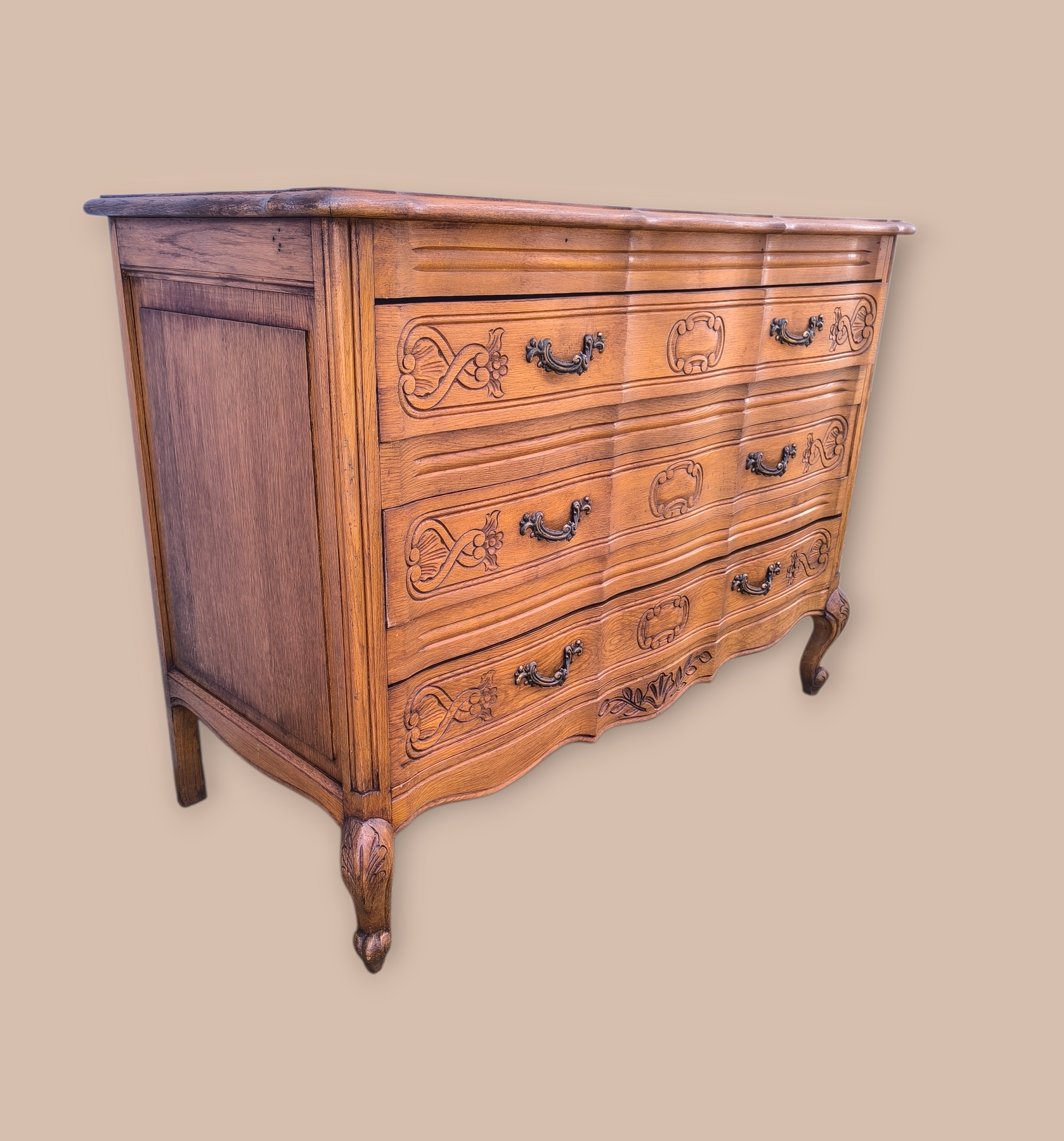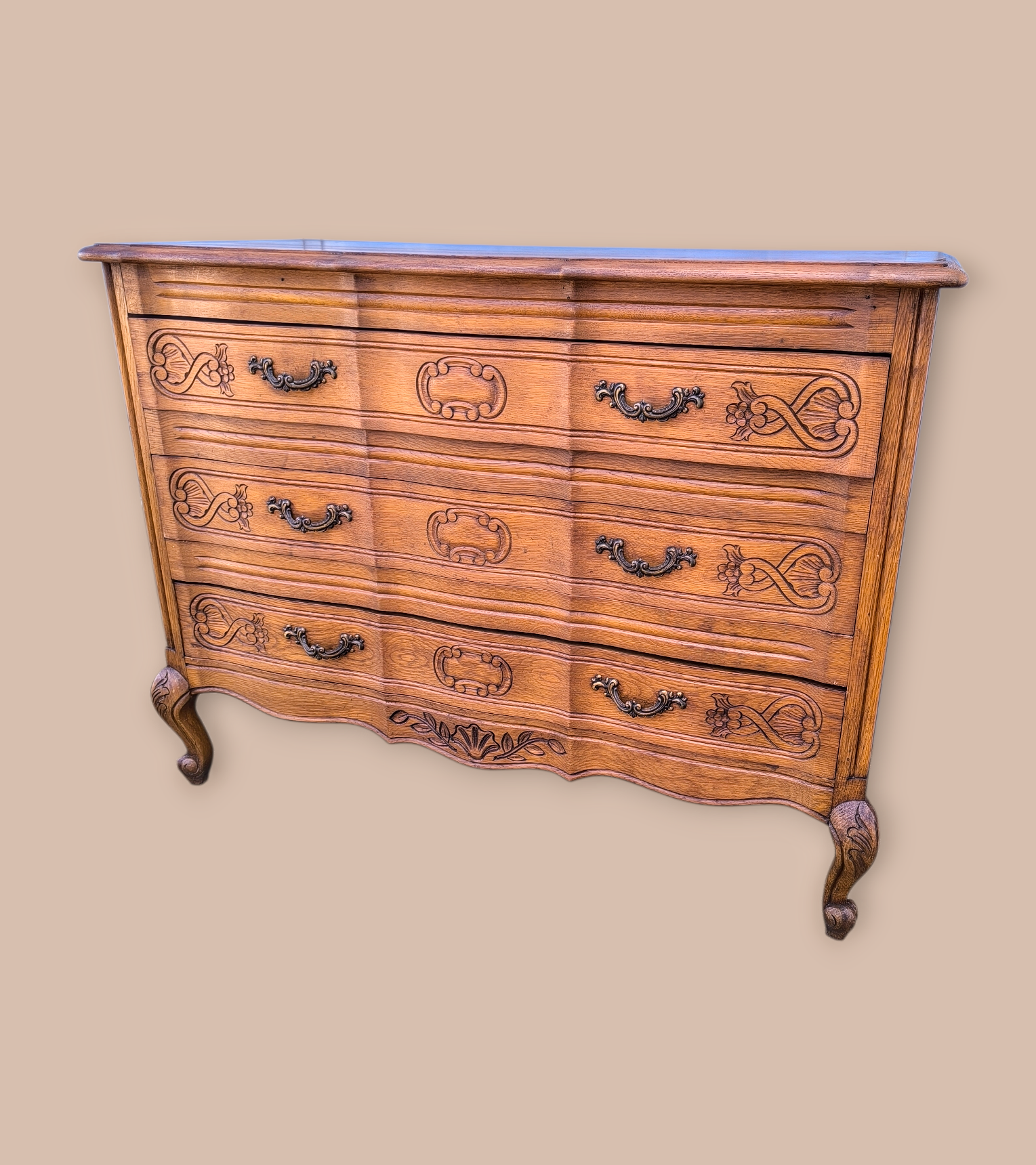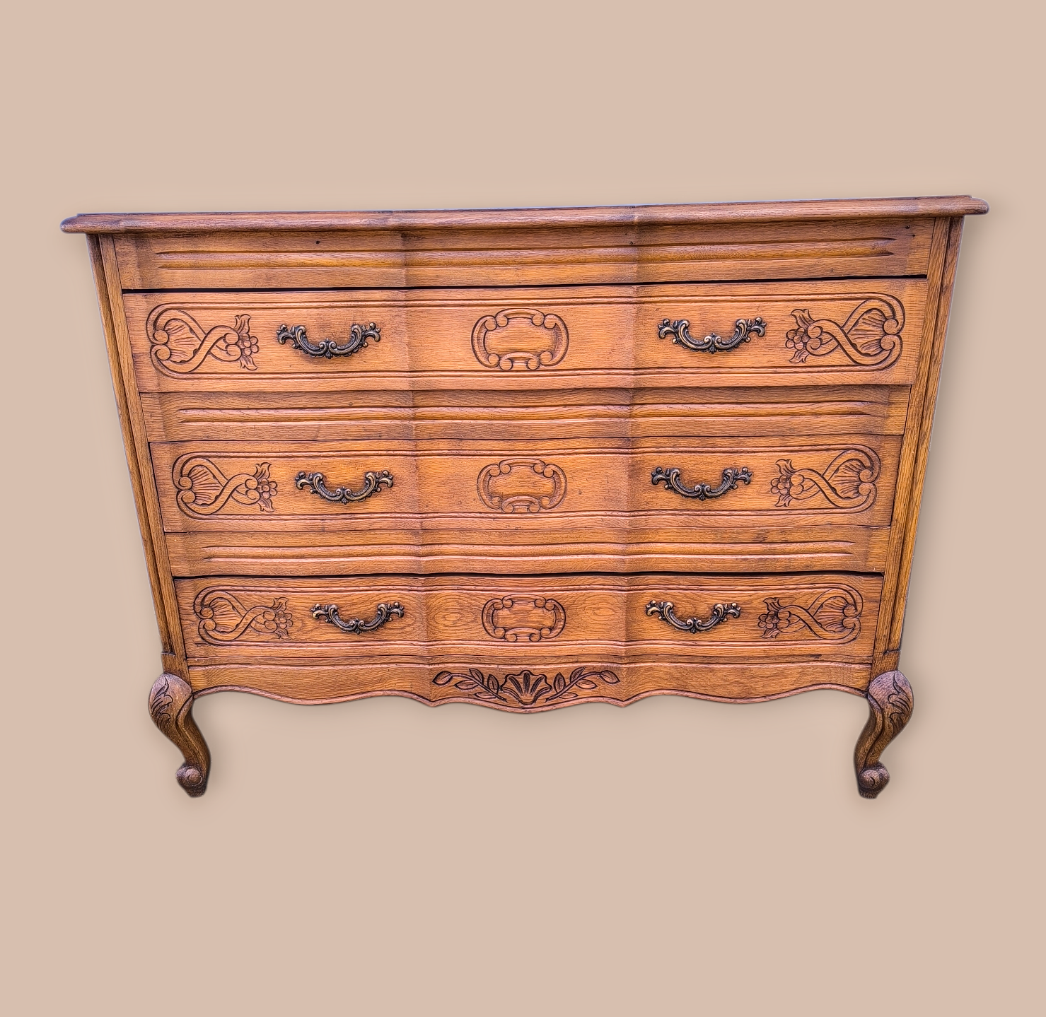Eladó neobarokk három fiókos komód szép állapotban. Díszes fiókokkal, magasabb, kecses lábakkal rendelkezik.