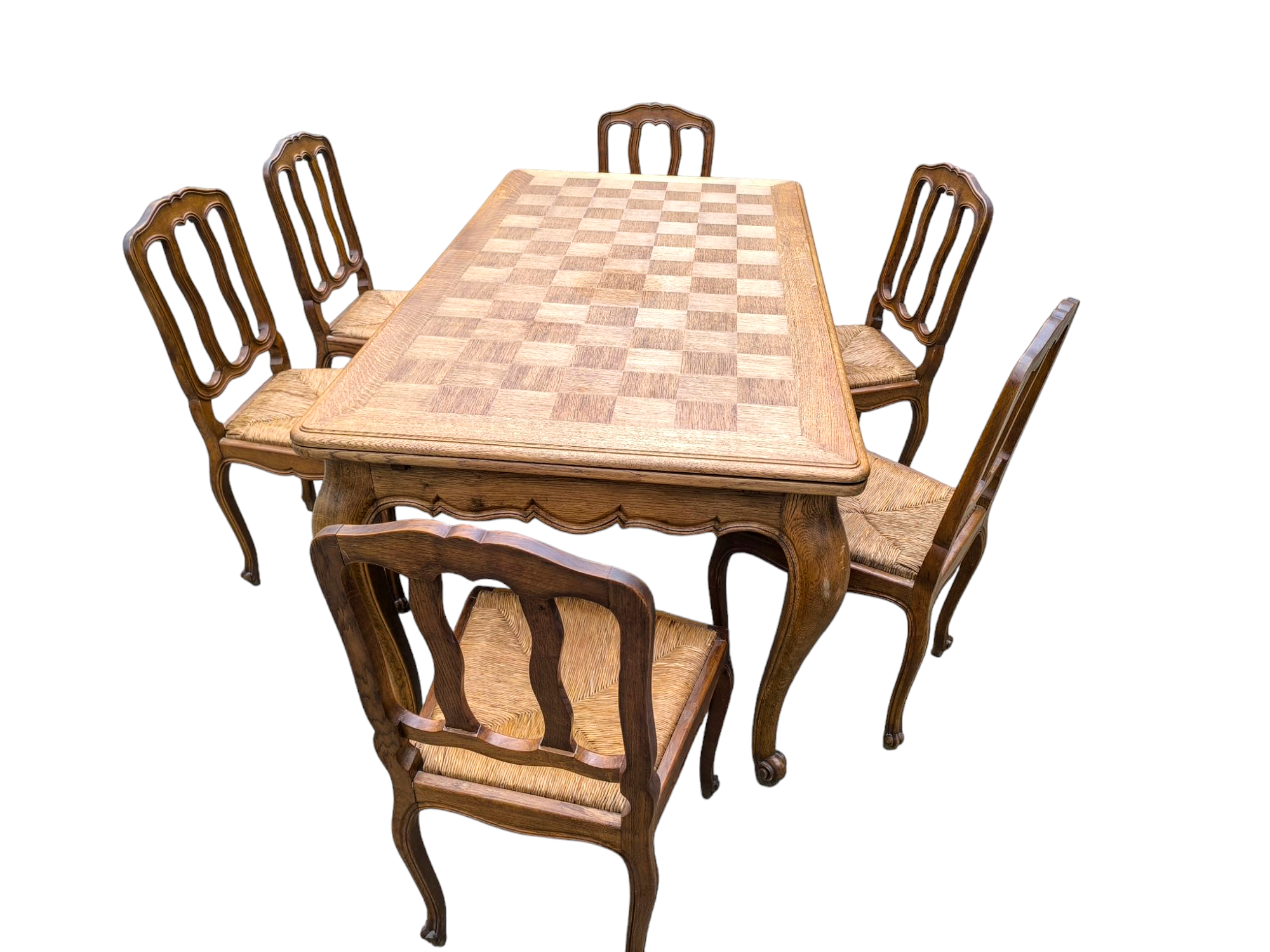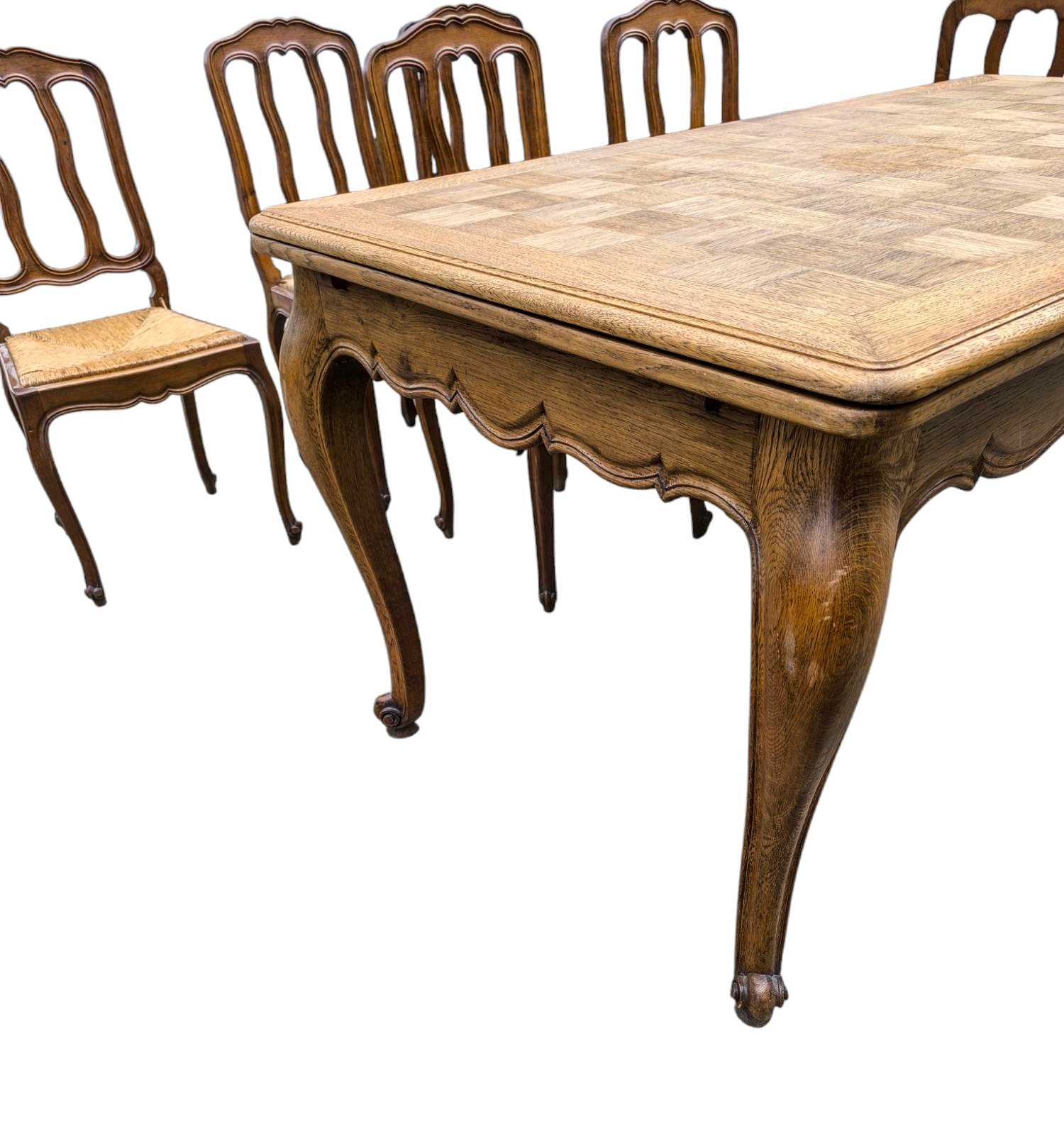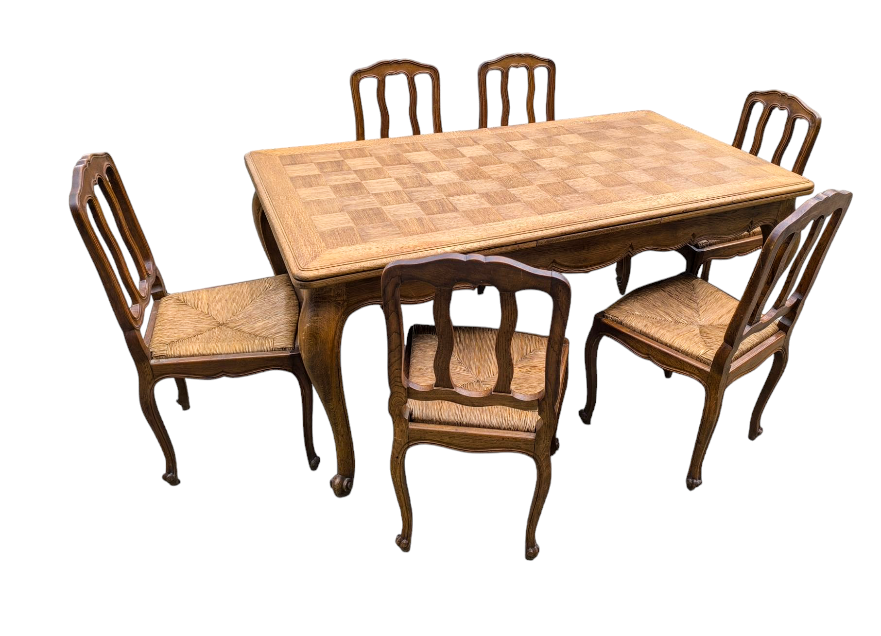 Eladó neobarokk étkező garnitúra szép állapotban. Kecses lábakkal, stabil szerkezettel, két oldalra hosszabbítható asztallappal. Hat darab kecses fa székkel,rattan ülőlappal amely kivehető így könnyen tisztítható. Teljes egészében fából készült. A termékeink között hozzá illő vitrin,tálaló és egyéb bútorok is találhatóak.