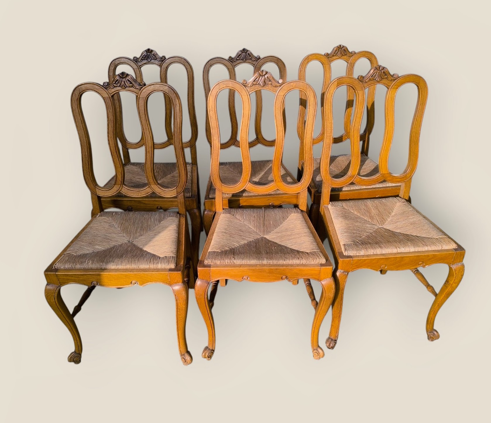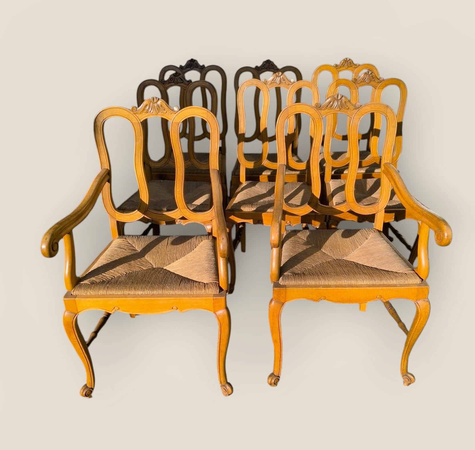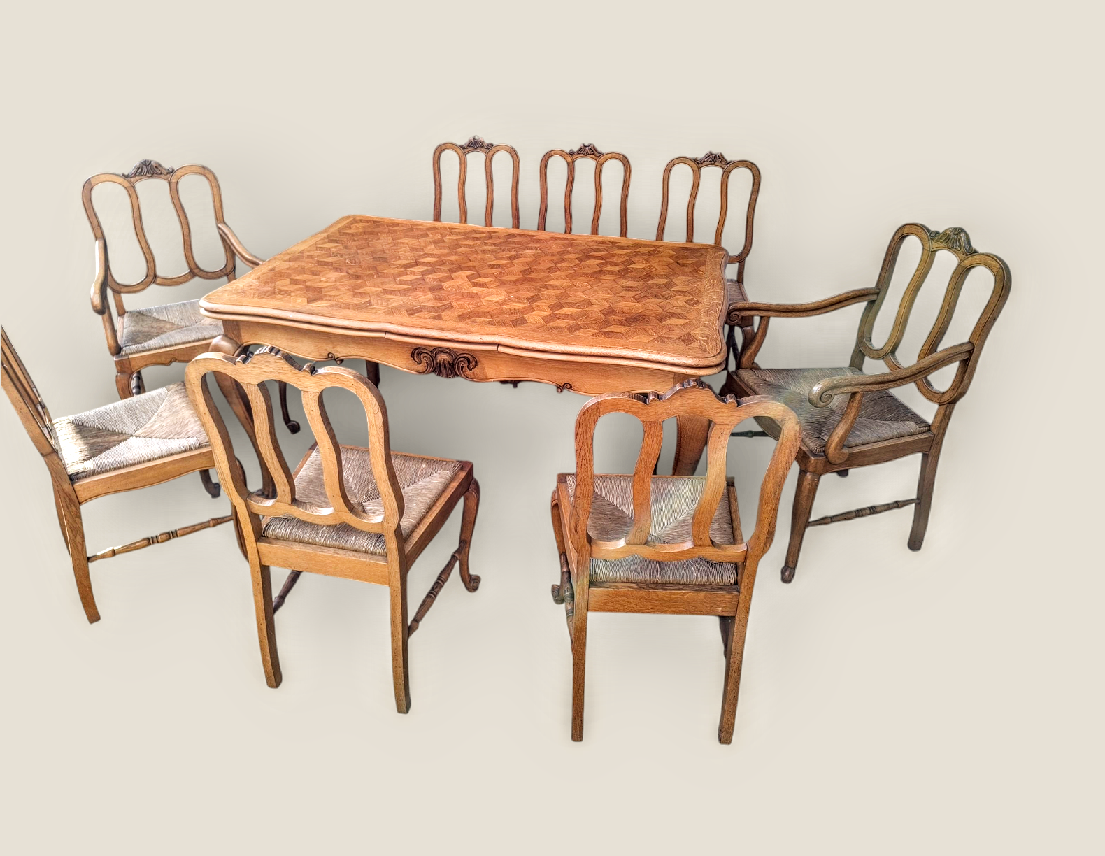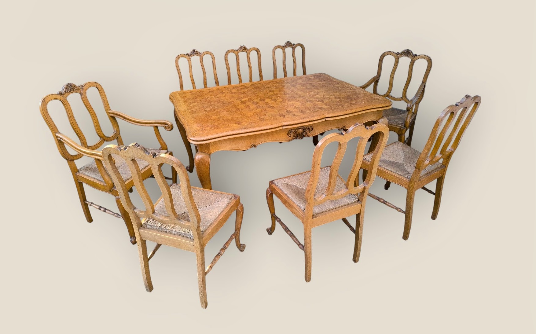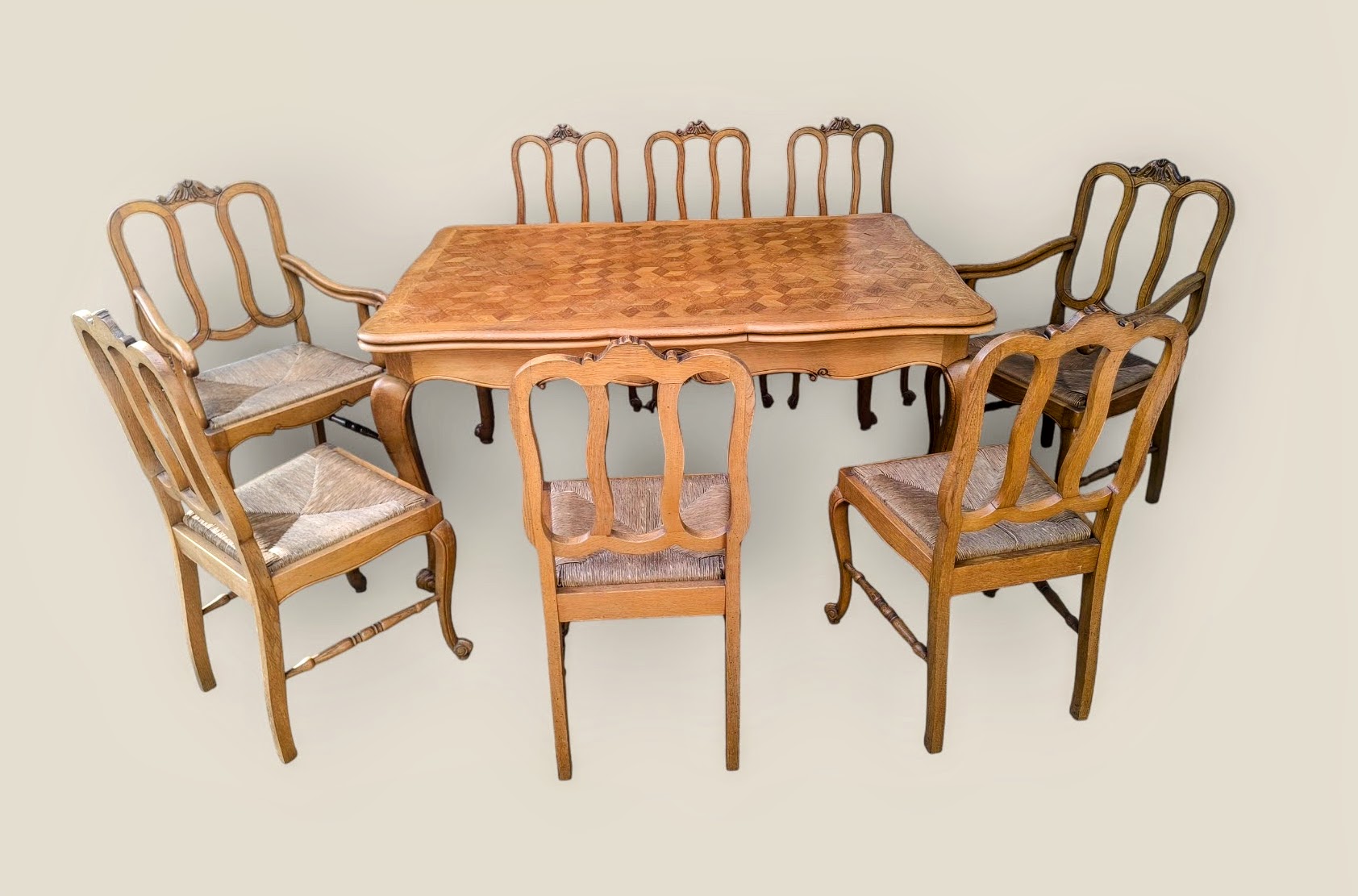 Eladó neobarokk étkező garnitúra szép állapotban. Nyolc szék tartozok a szetthez, amelyből kettő karosszék. Statikailag mindegyik kiváló, teljes egészében fából készült minden eleme. Az asztal lapja esztétikus, rombusz mintázatú intarzia berakásokkal, továbbá két oldalra hosszabbítható 2x54 cm-rel. A székek ülőlapja rattan borításúak.