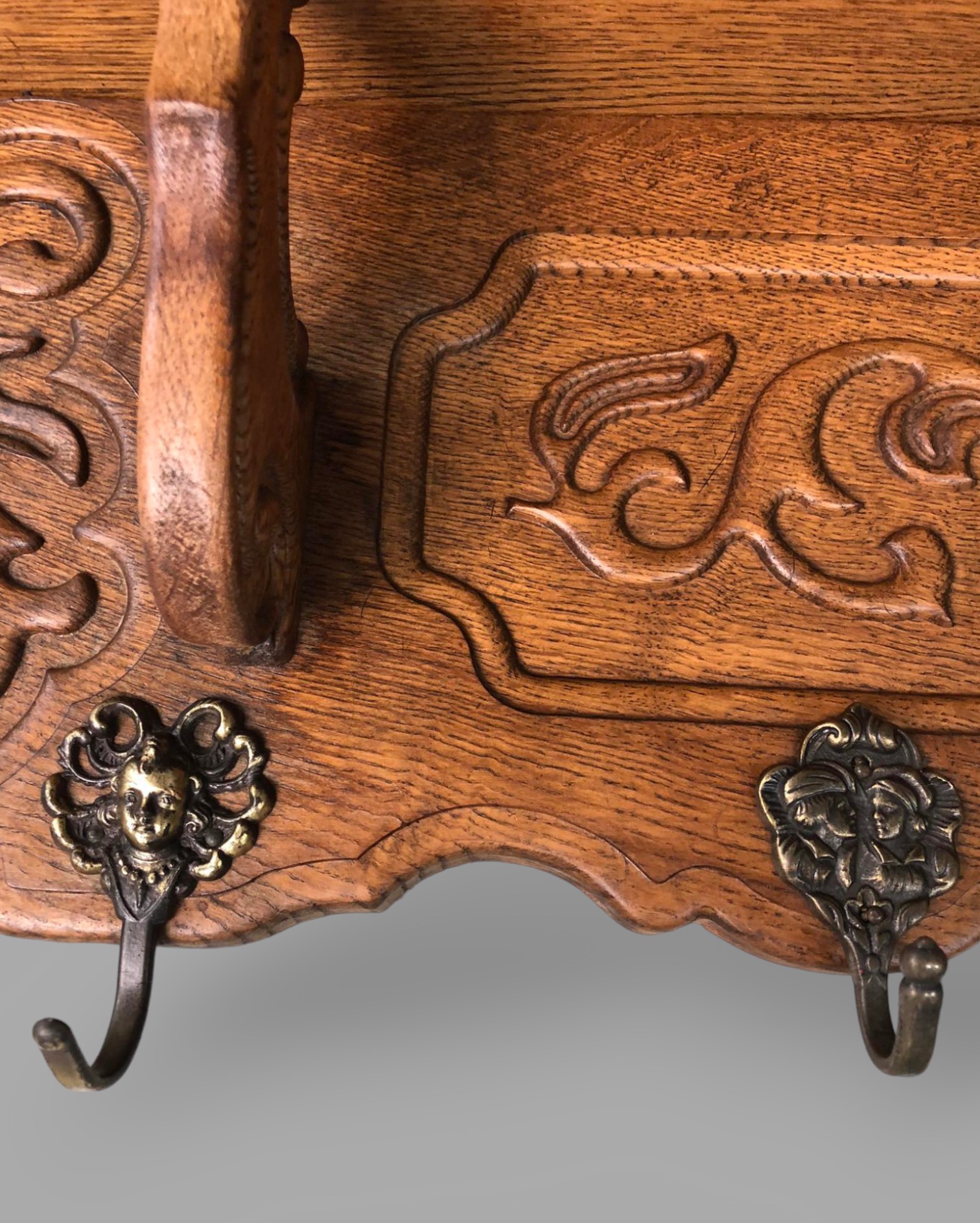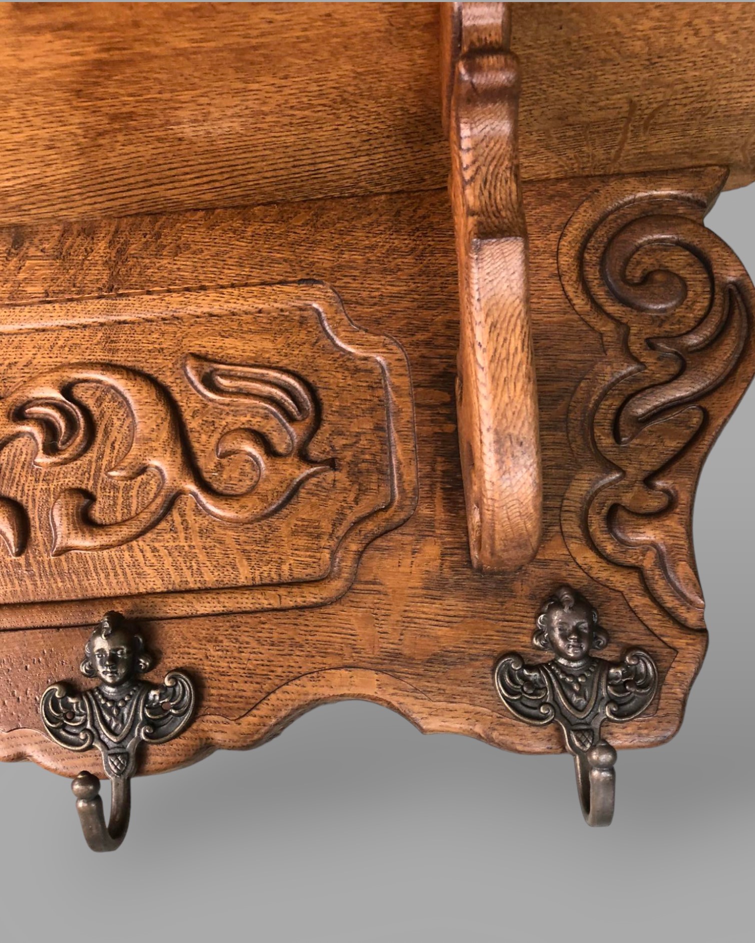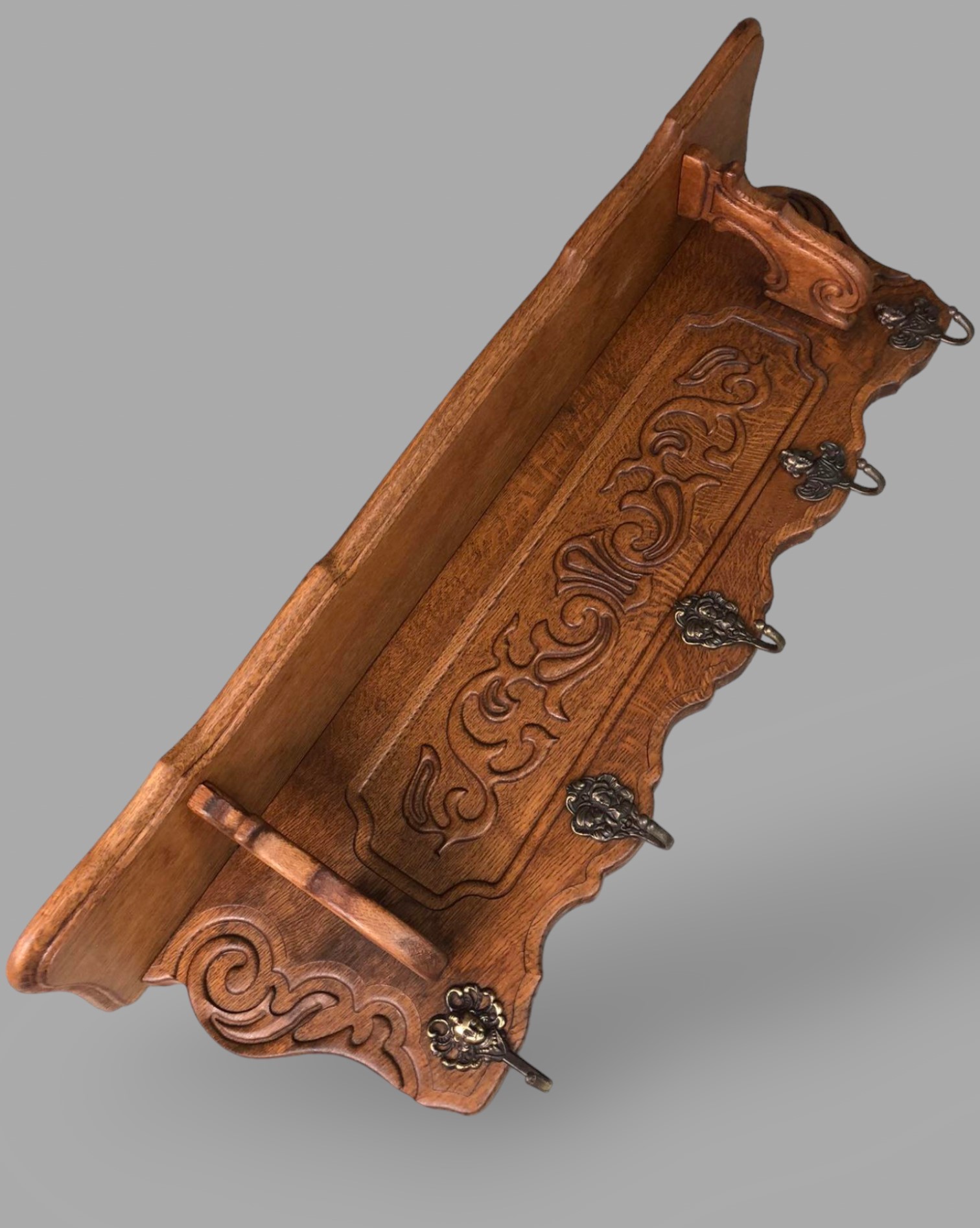 Eladó neobarokk akasztó, fogas szép állapotban. Díszes faragásokkal, öt darab fém akasztóval. Teljes hosszúság 85 cm.