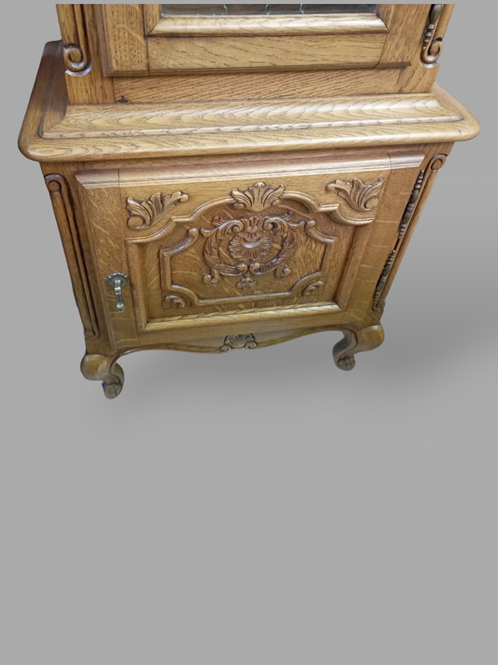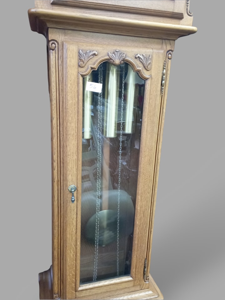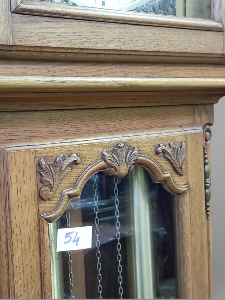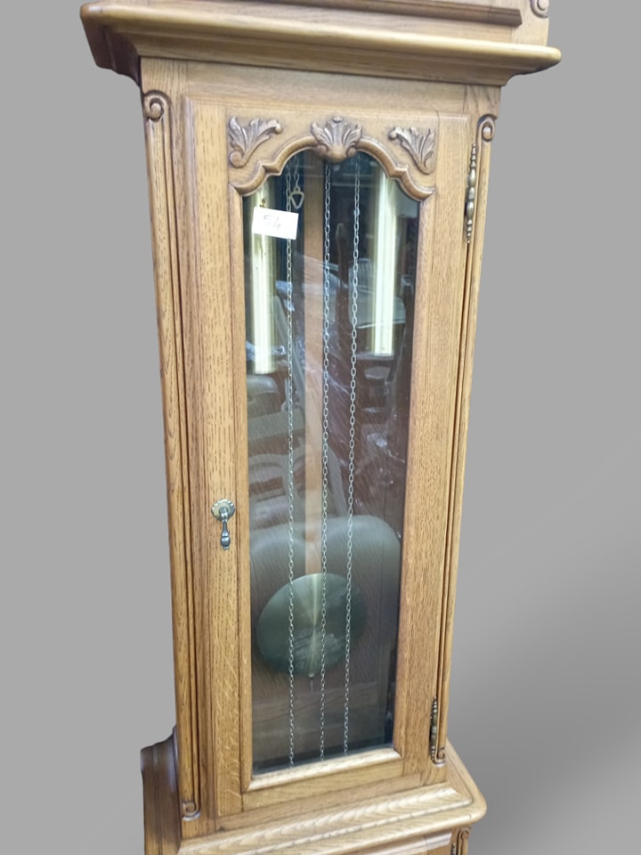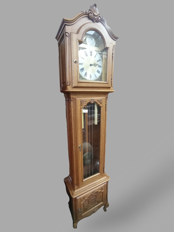 Eladó neobarokk allóóra szép állapotban. Sötétebb tónusú fa tokban, kecses lábakkal, szolidabb díszítésekkel. Három súlyos fém szerkezettel szerelt, amely negyed óránként dallamot játszik, illletve üti az órák számát (kikapcsolható). Számlapja díszesebb, egyedi darabka lehet a szobának. Az óra leszervizelt állapotban kerül átadásra, teljes magassága 203 cm.