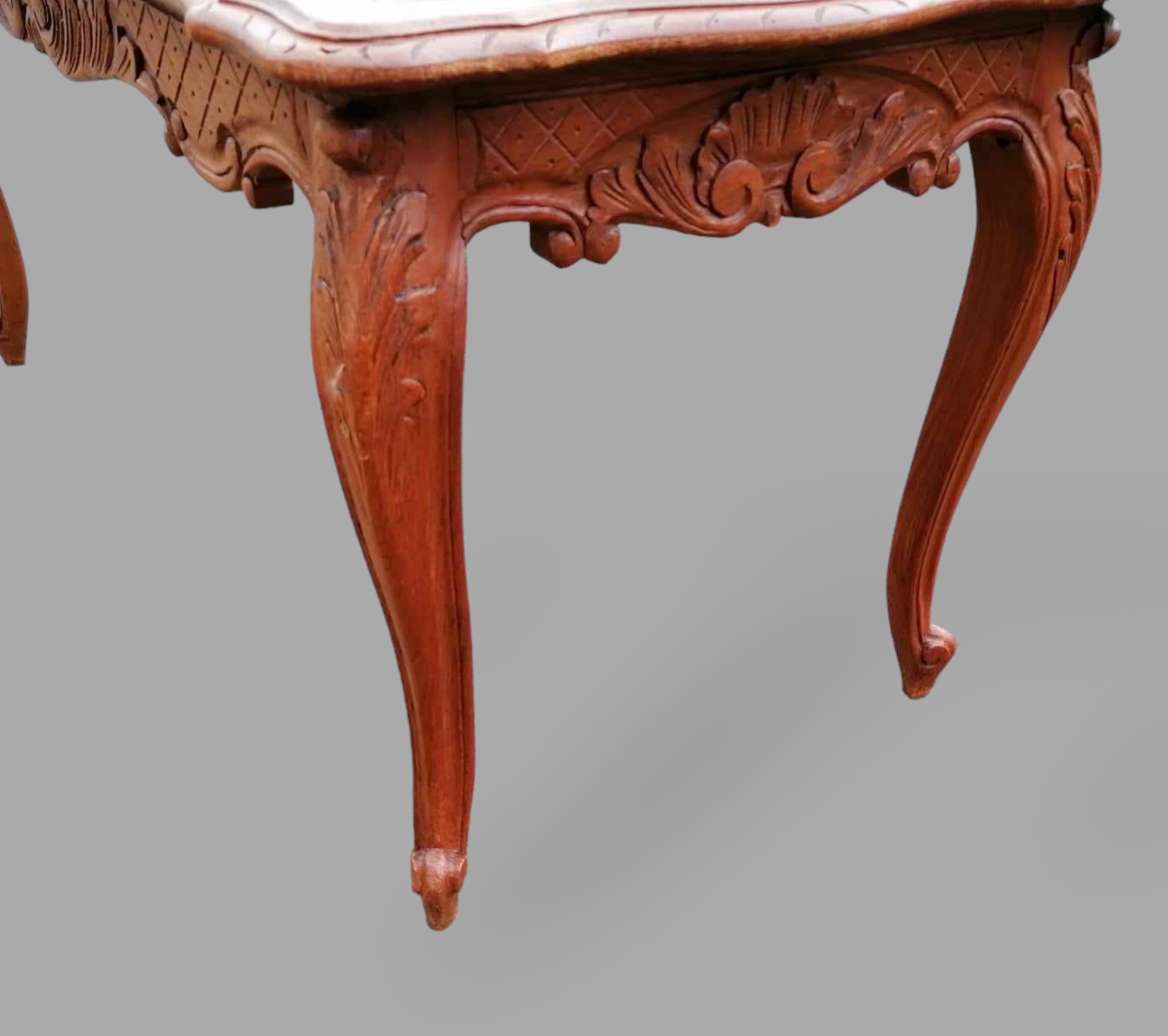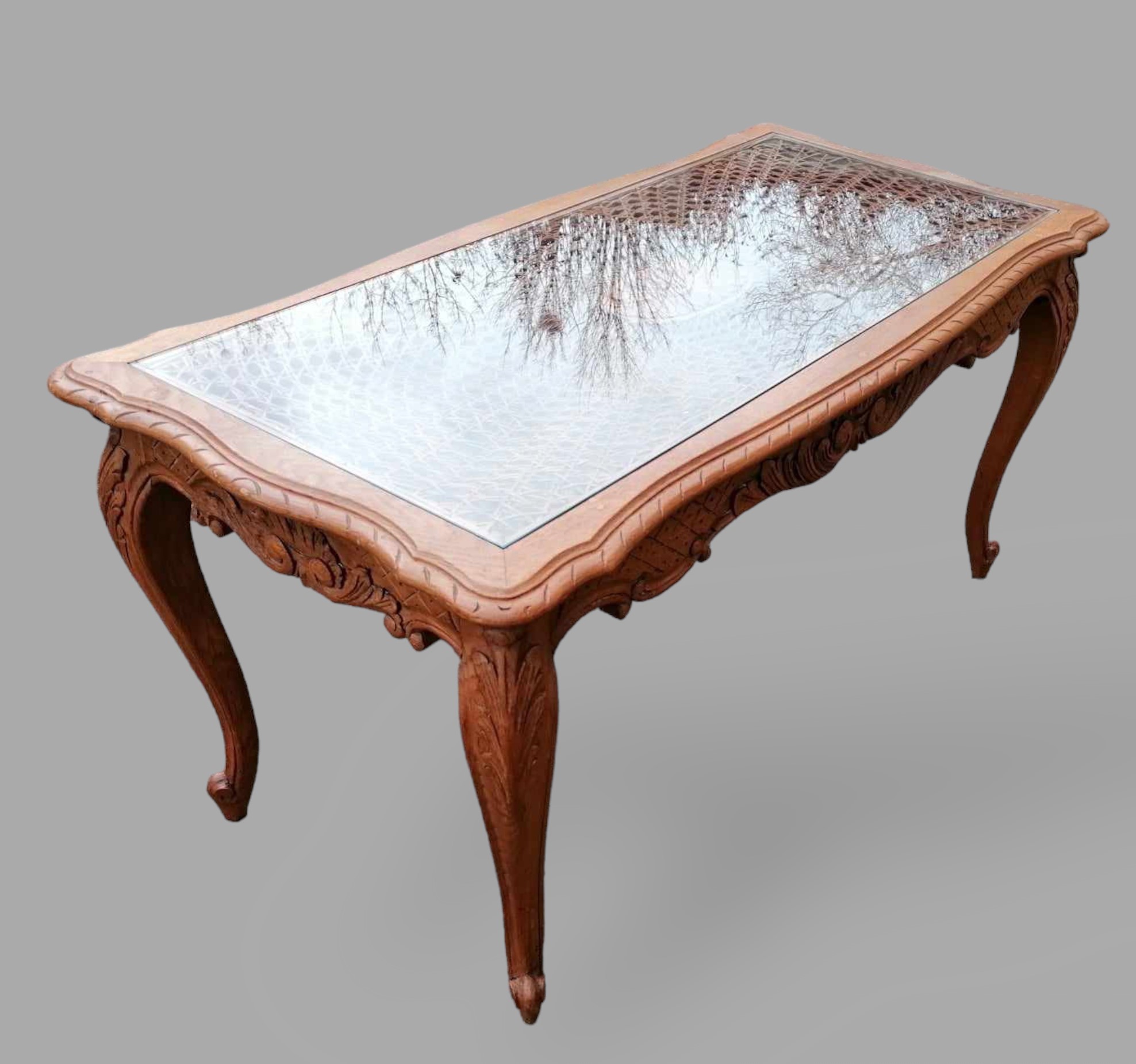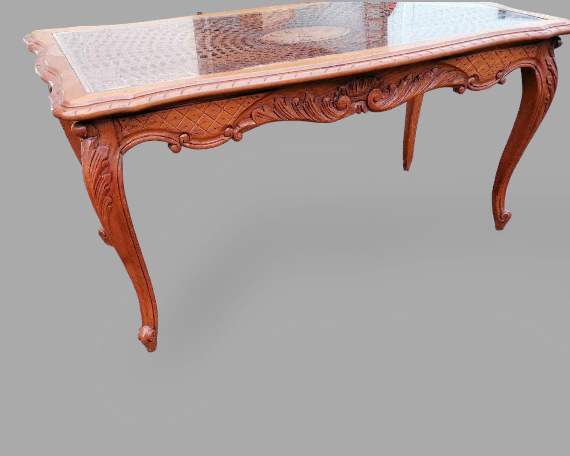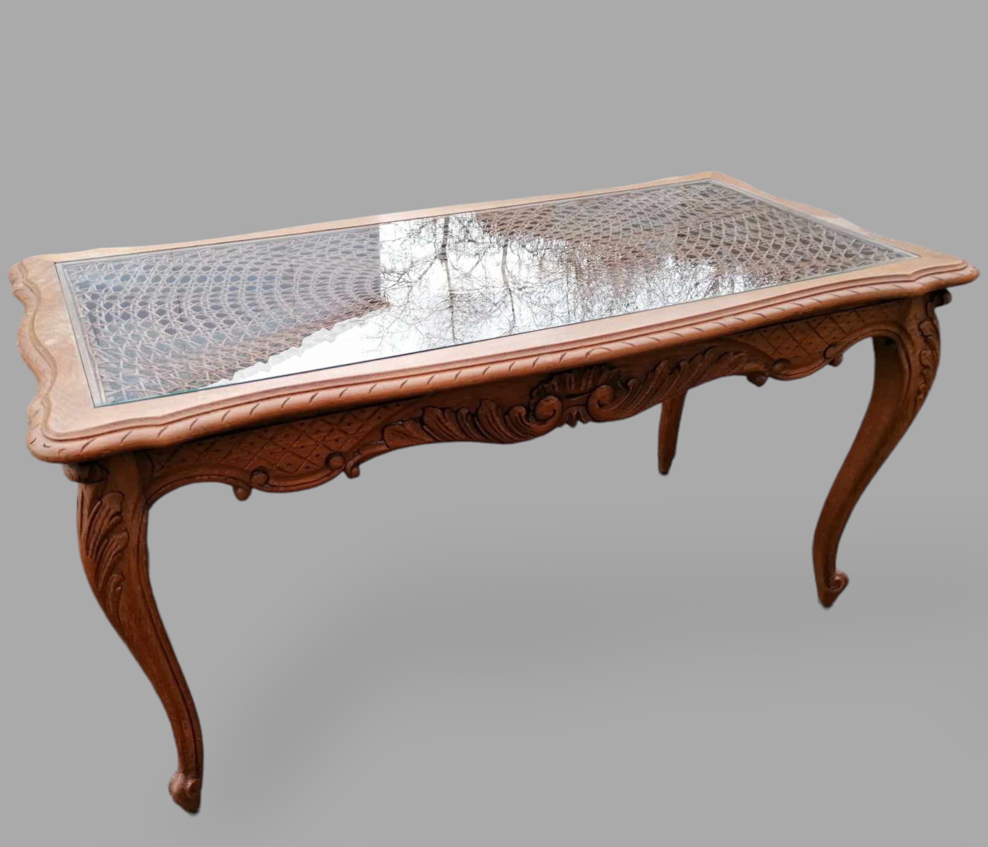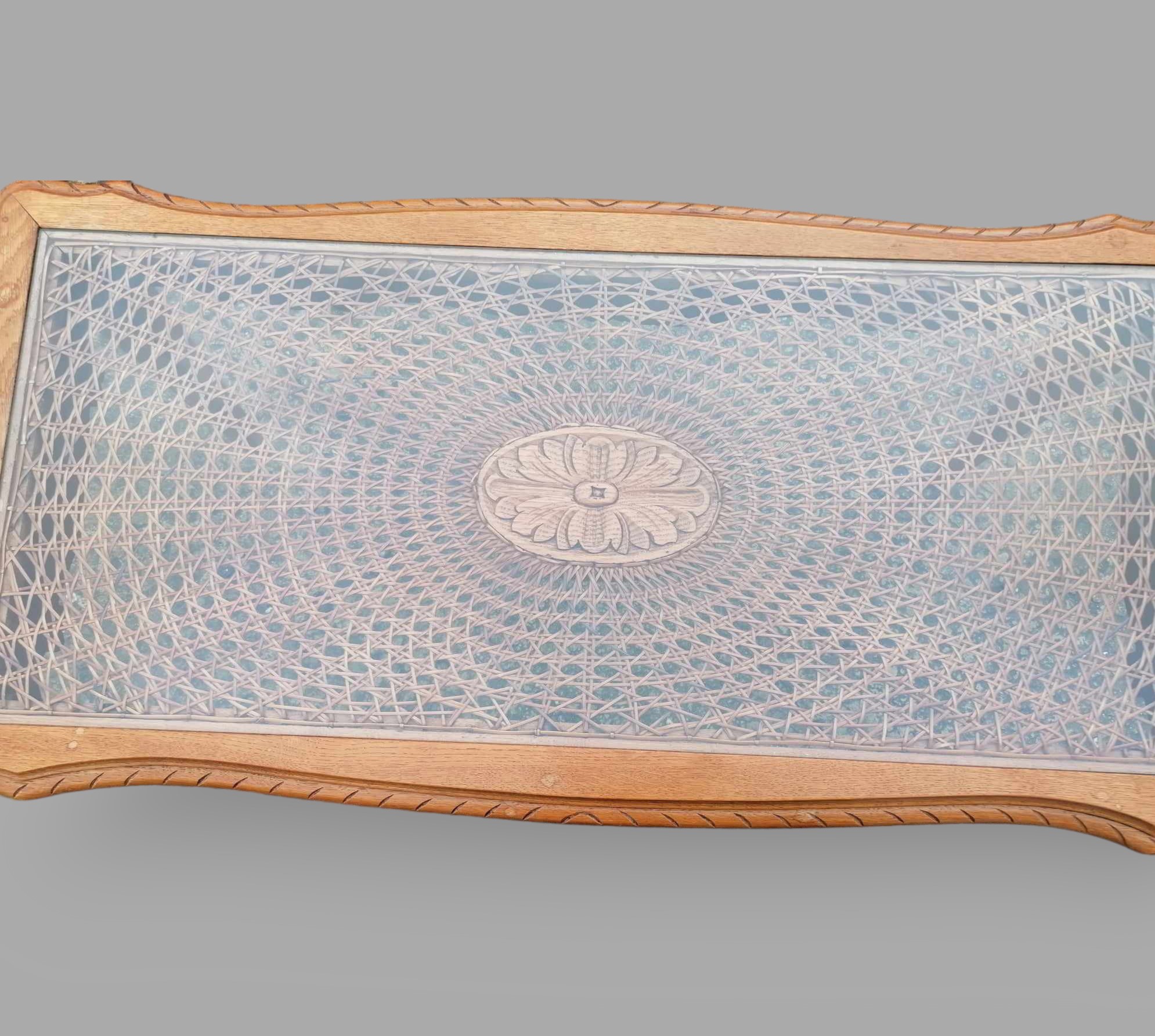Eladó neobarokk dohányzóasztal szép állapotban. Kecses, ívelt lábakon áll, körben gazdagon díszített szoknya résszel. Lapjának éle körben ívelt, teteje rattan díszítésű, üveglap fedéssel.