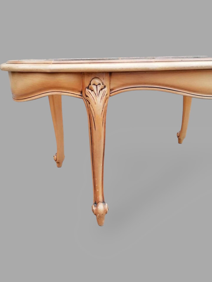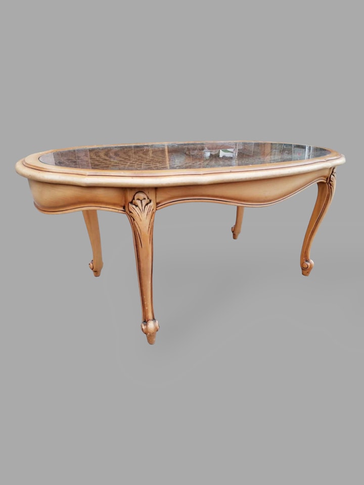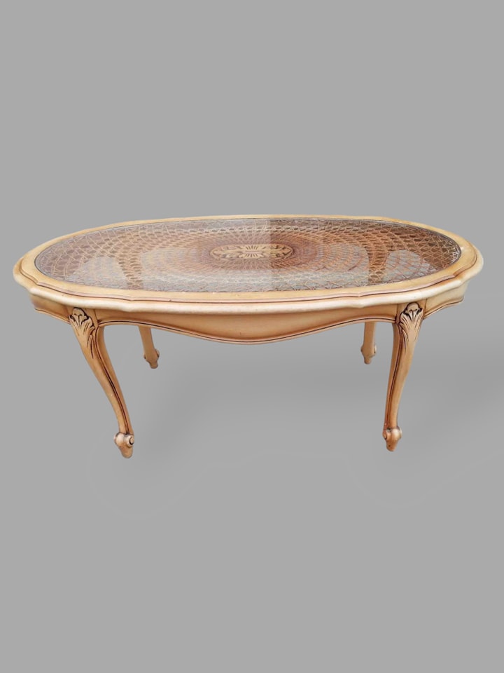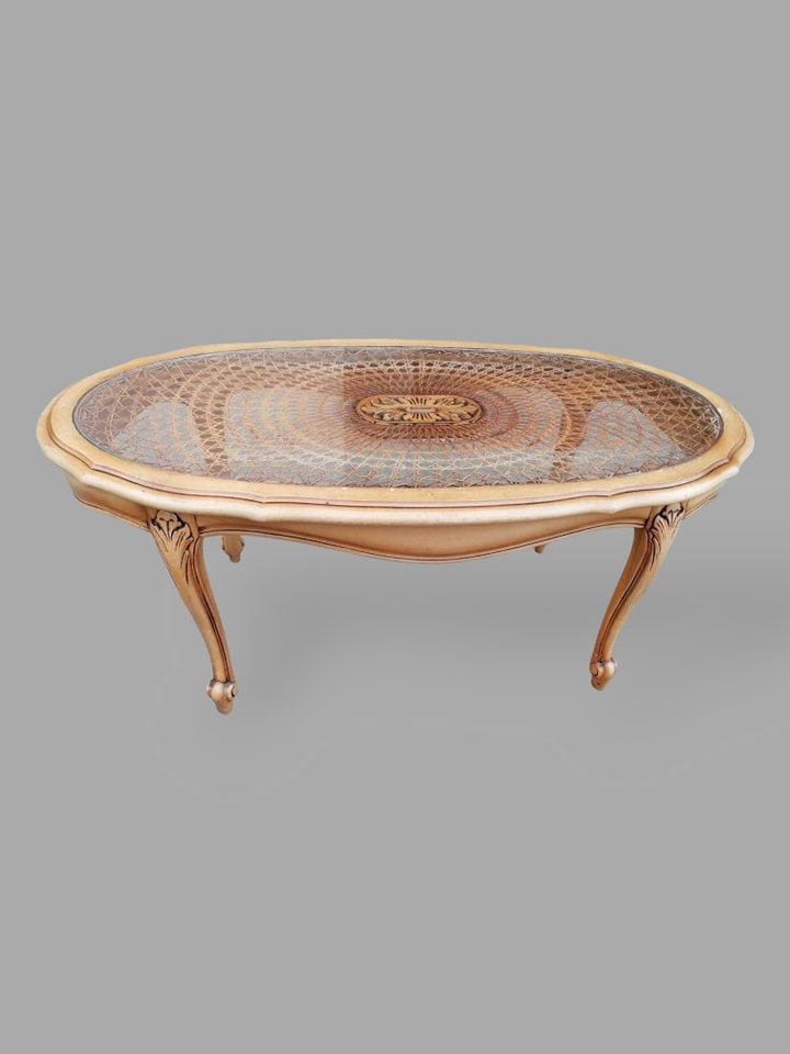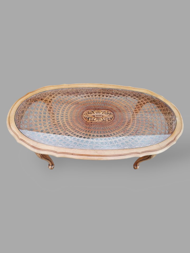 Eladó neobarokk dohányzóasztal szép állapotban. Kecses, ívelt lábakkal, körben hullámos szoknyával rendelkezik. Lapja rattan díszítésű, üveglap fedéssel, így nem csak esztétikus, de praktikus is.
