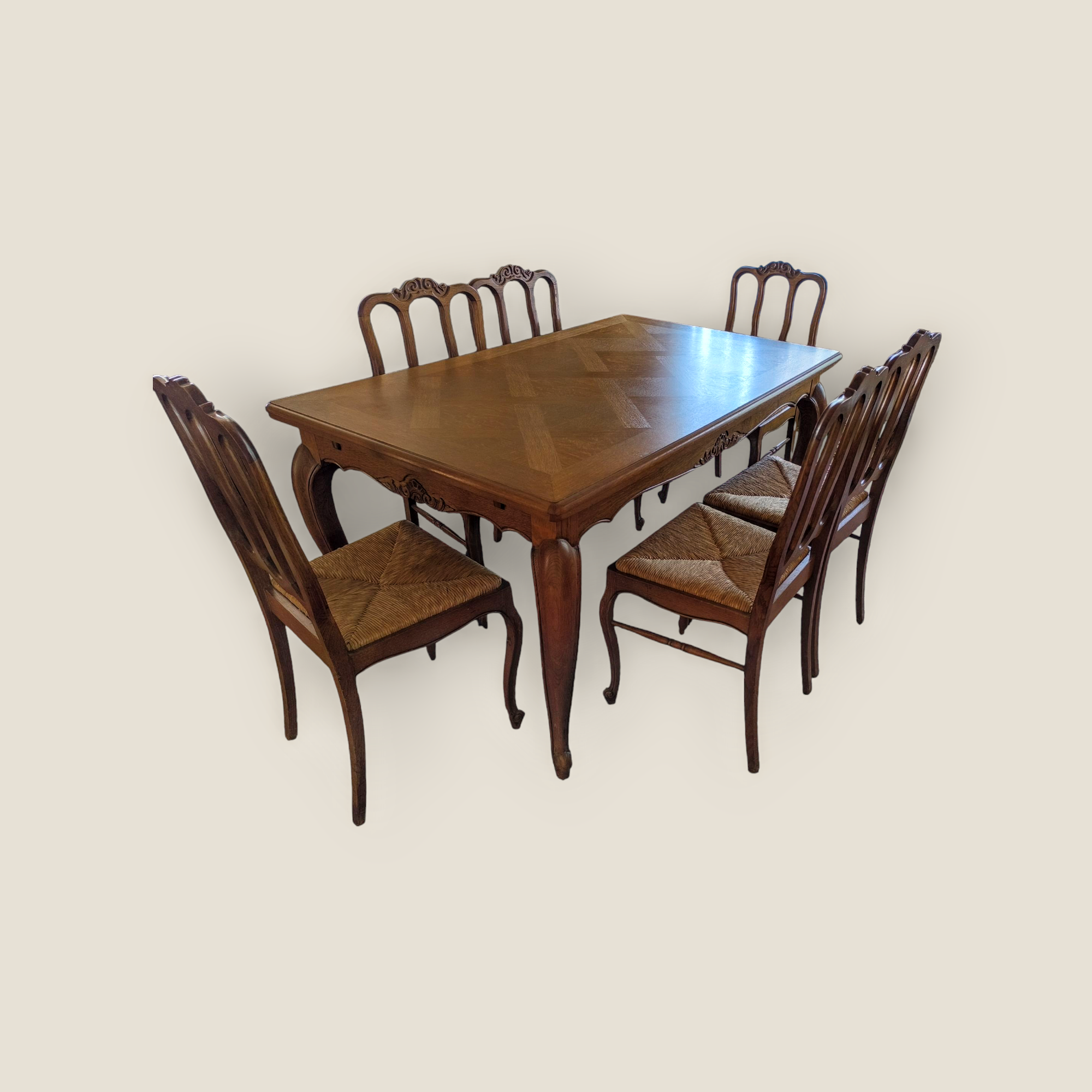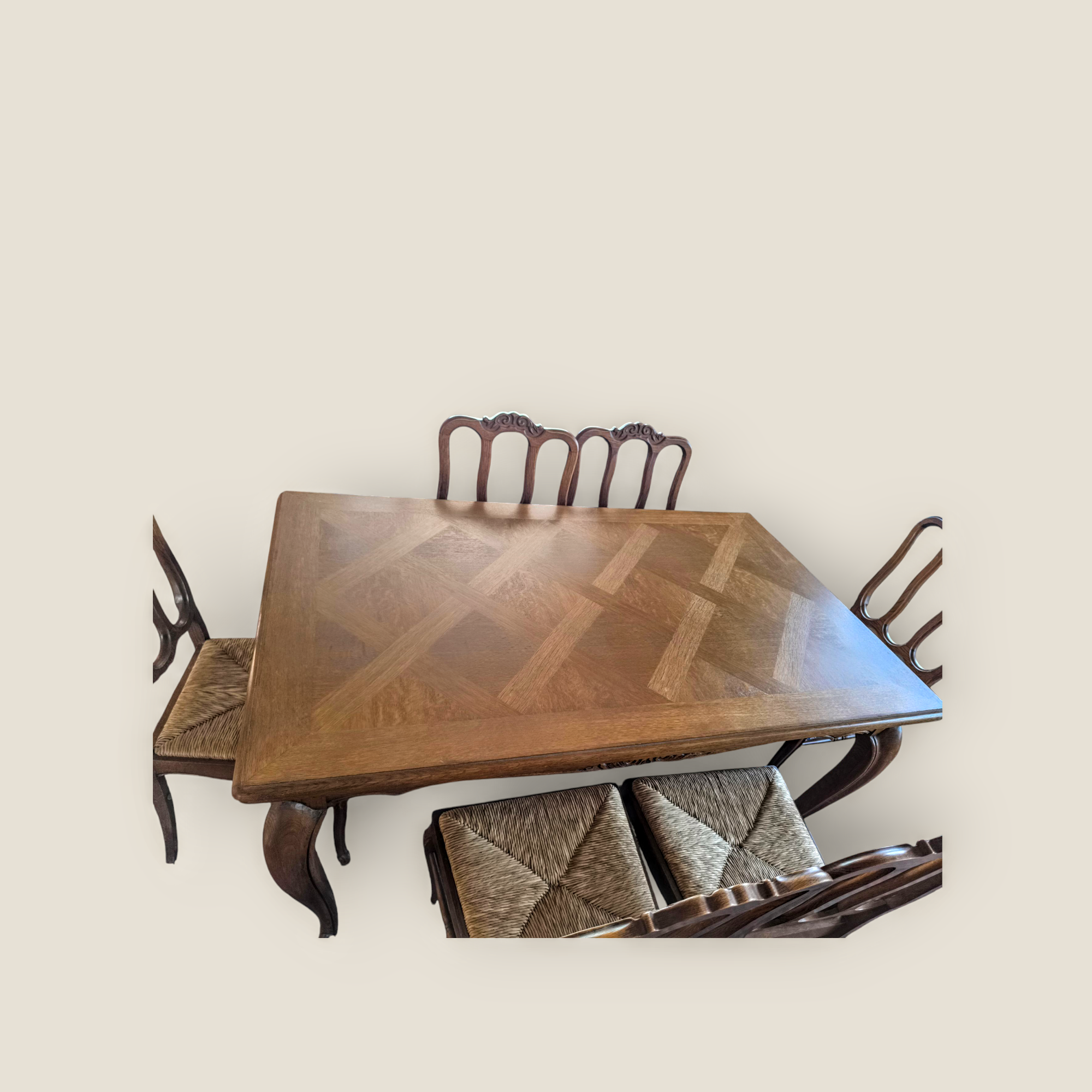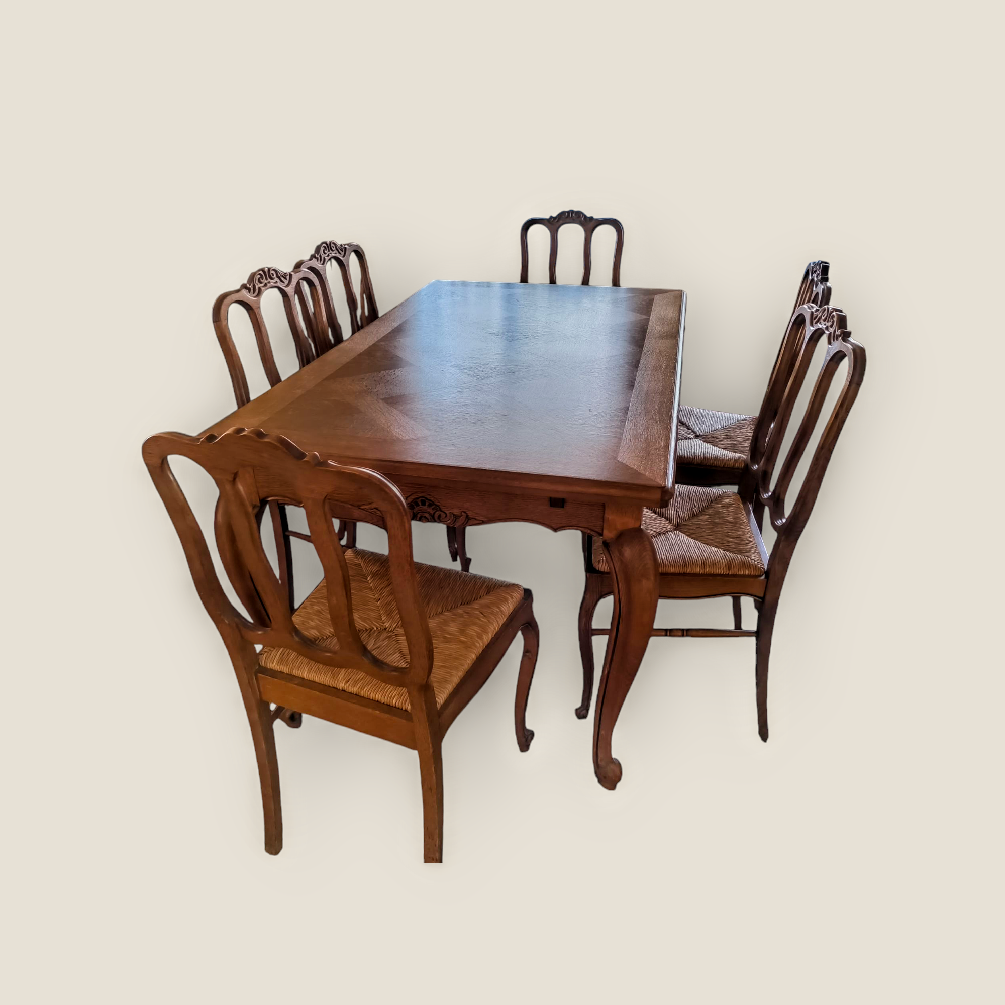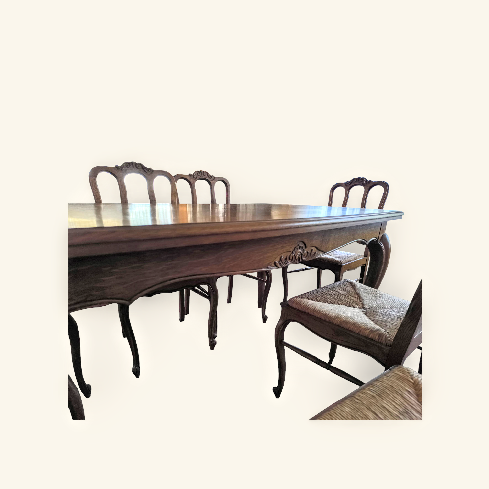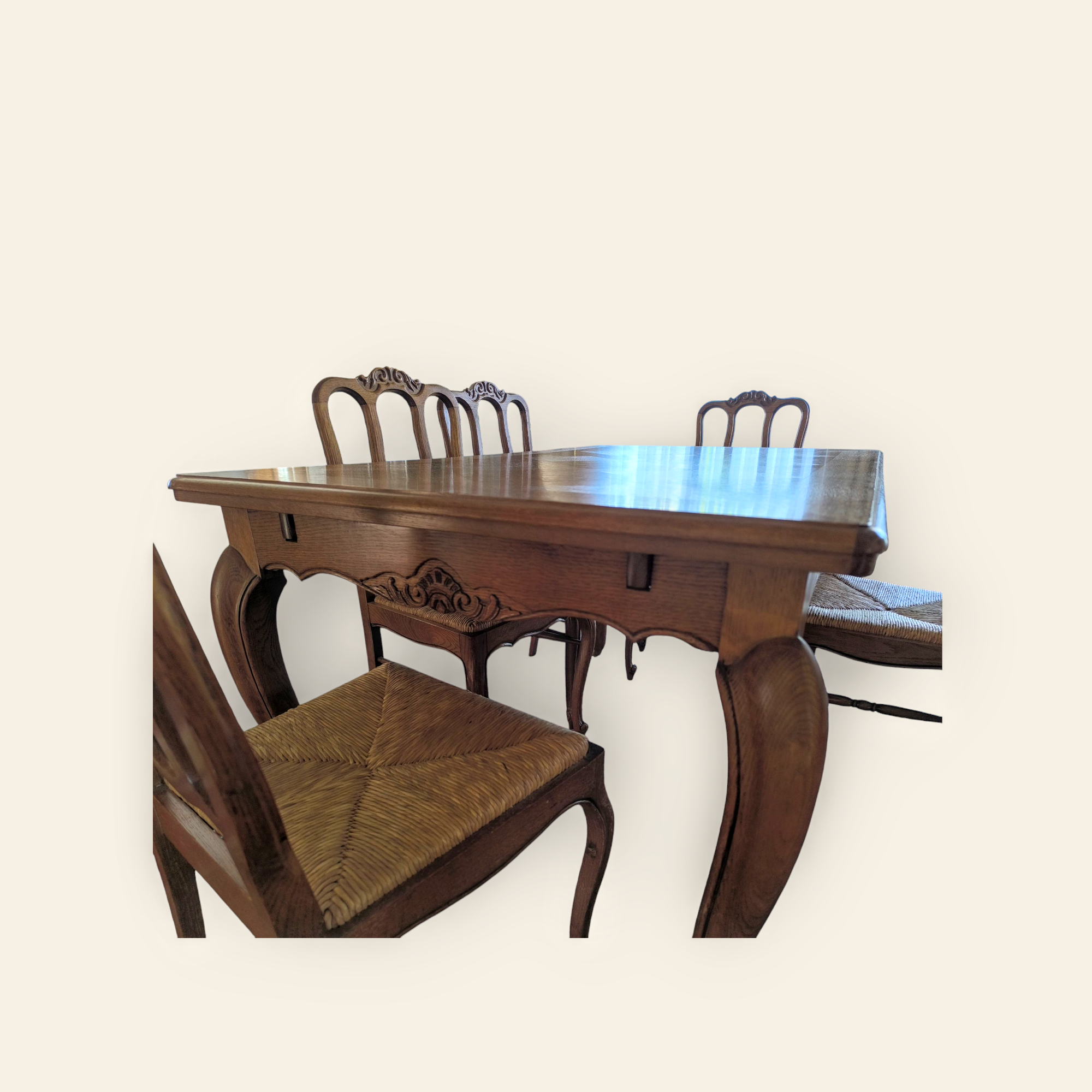 Eladó neobarokk étkező garnitúra szép állapotban. Kecses lábakkal, stabil szerkezettel, két oldalra hosszabbítható asztallappal. Hat darab kecses fa székkel, rattan ülőlappal, amely kivehető így könnyen tisztítható. Teljes egészében fából készült. A termékeink között megtalálható vitrin és tálaló is a garnitúrához tartozik, de külön megállapodás tárgyát képezi, külön is megvan hirdetve.