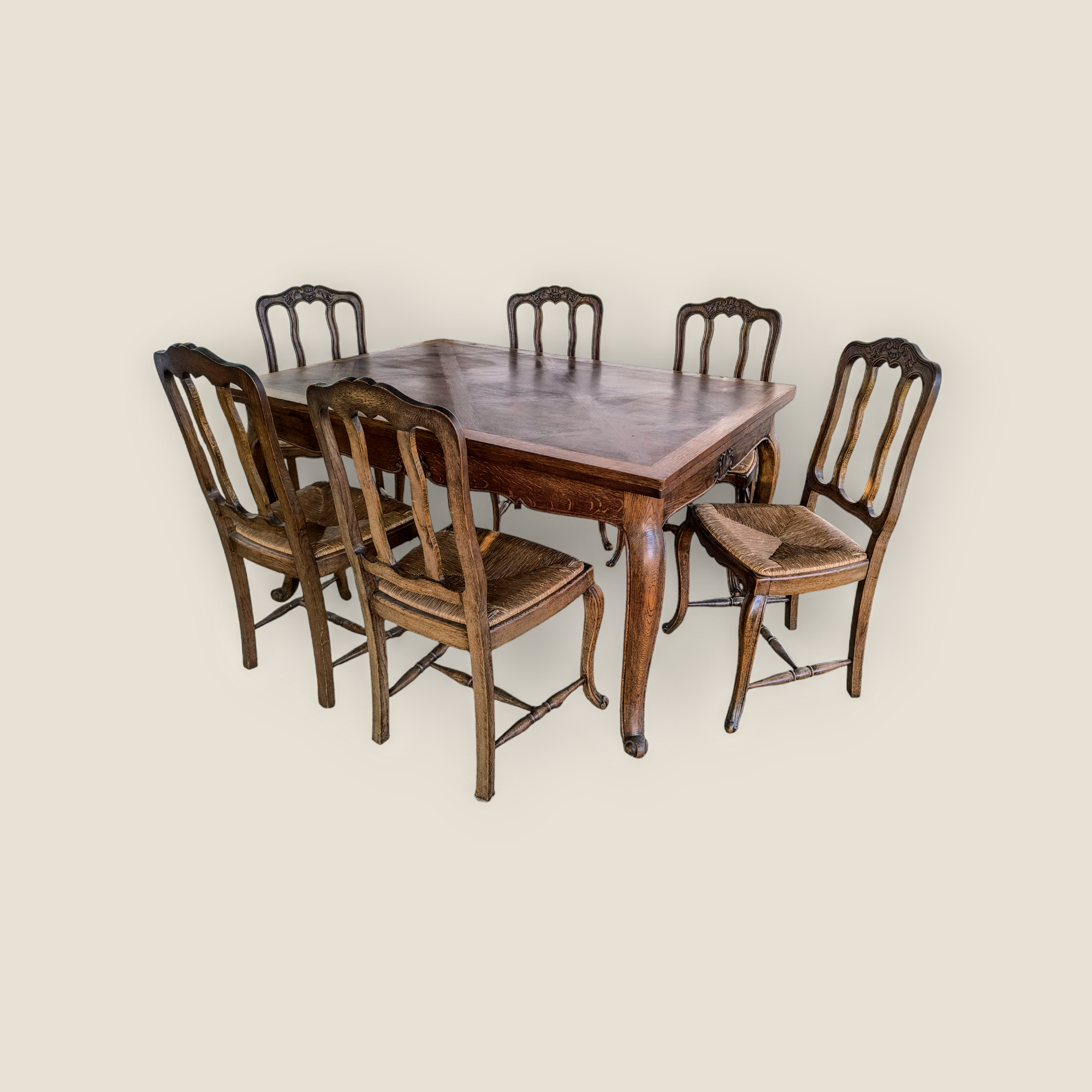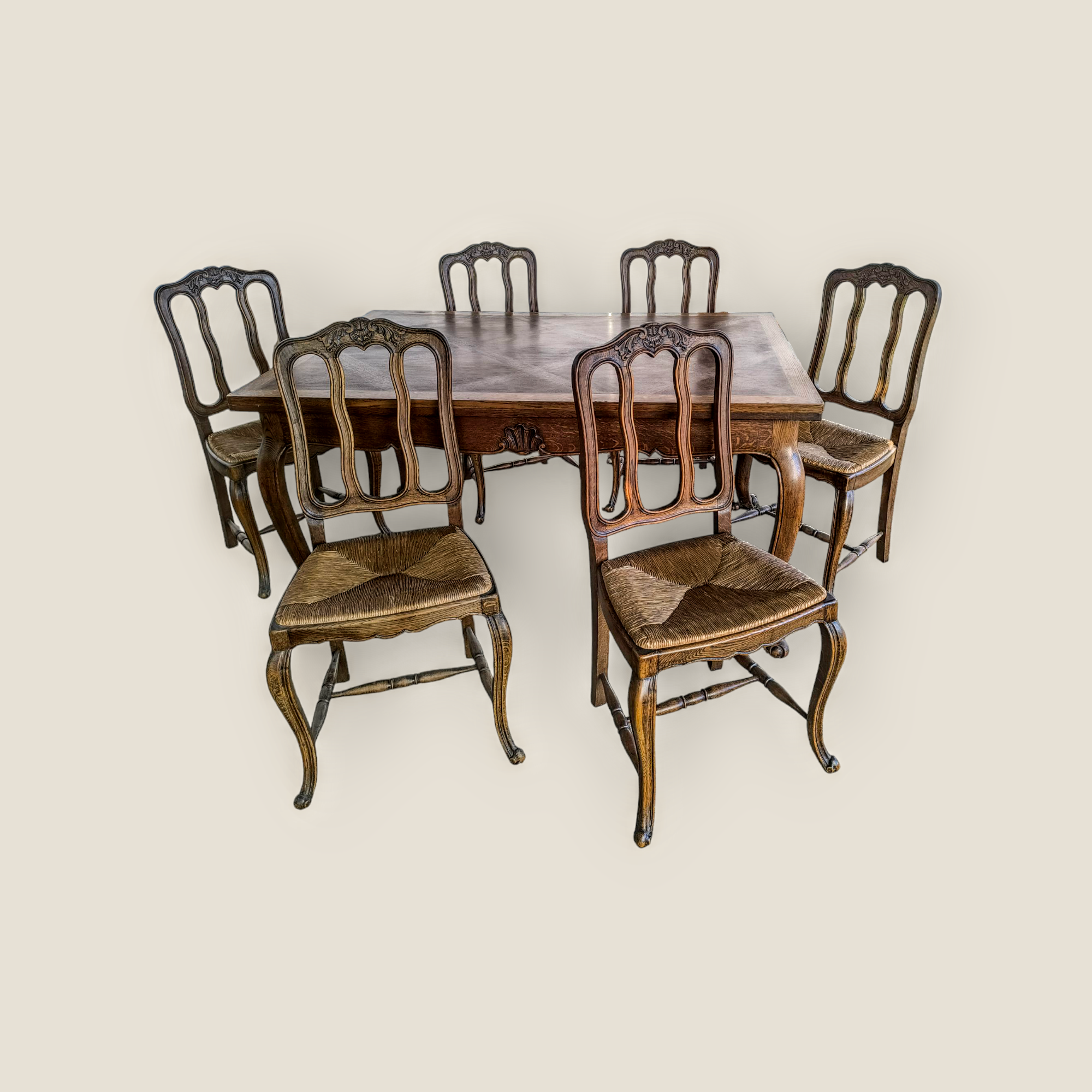 Eladó egy neobarokk étkező garnitúra szép állapotban. Kecses lábakkal, stabil szerkezettel, két oldalra hosszabbítható asztallappal. Hat darab kecses fa székkel, rattan ülőlappal, amely kivehető így könnyen tisztítható. Teljes egészében fából készült.