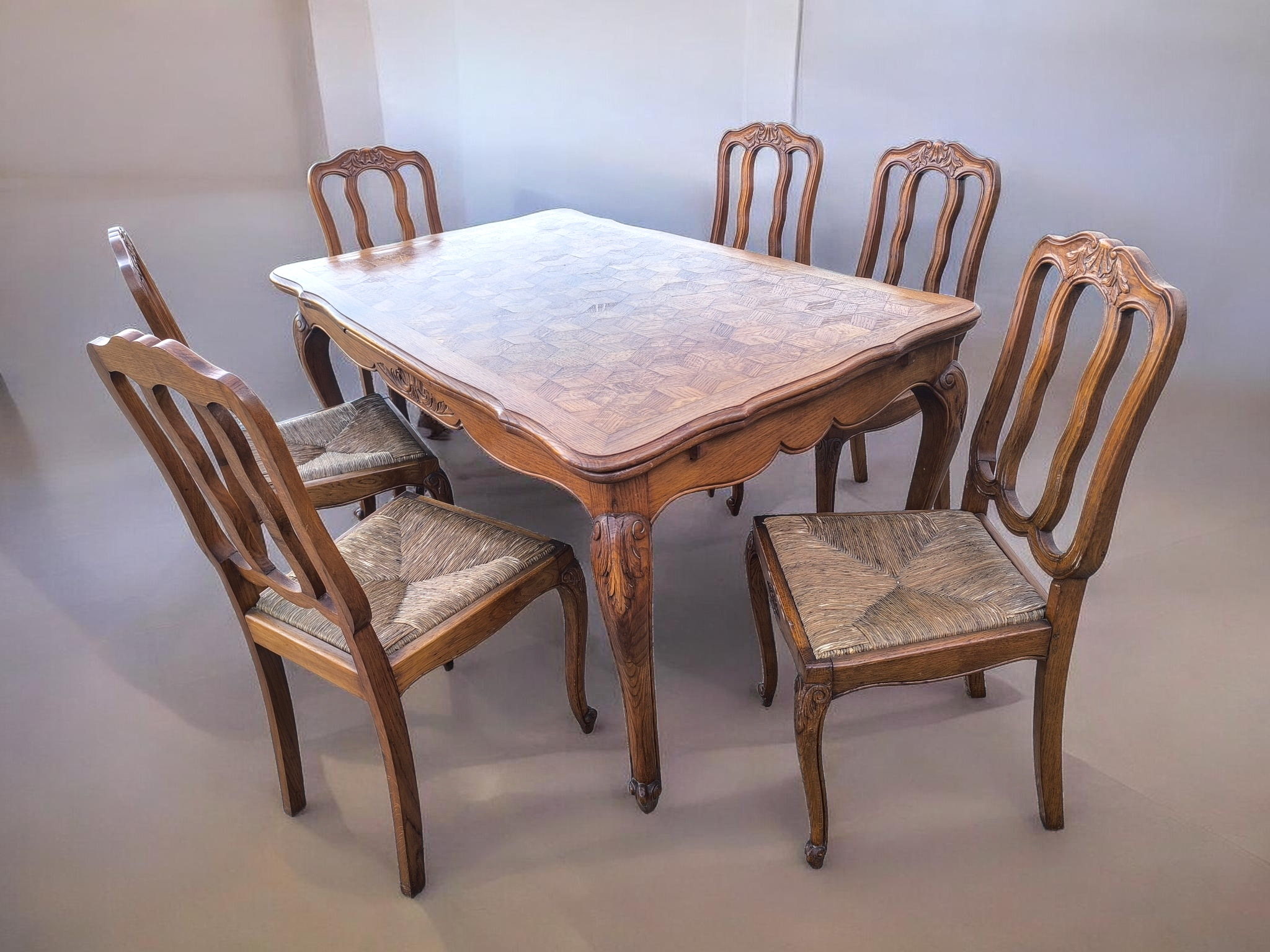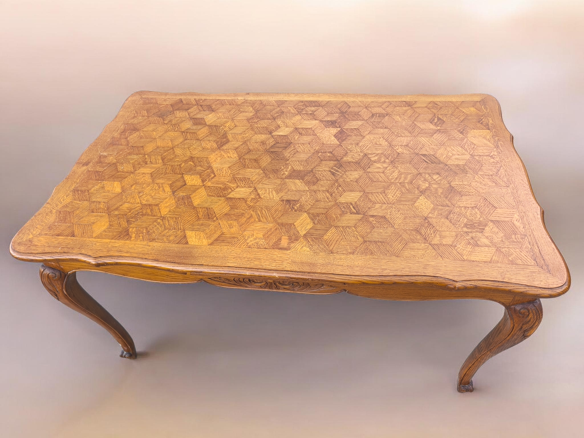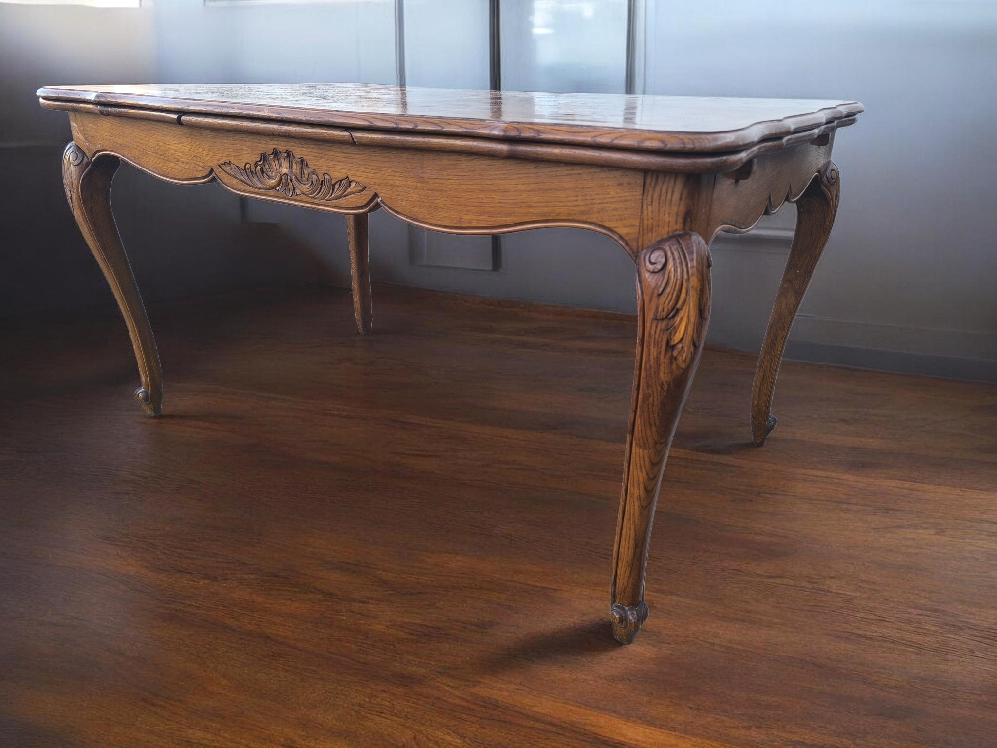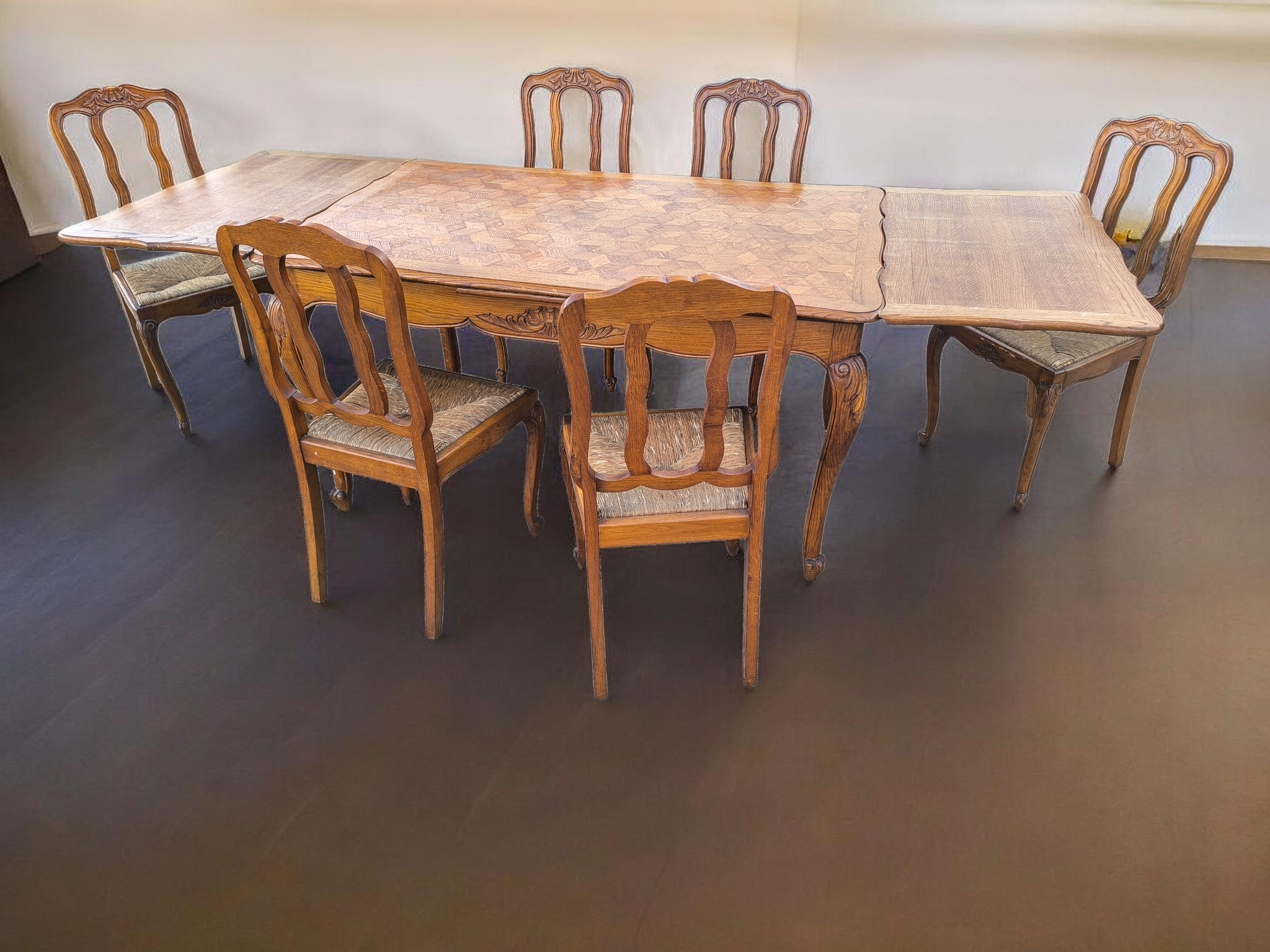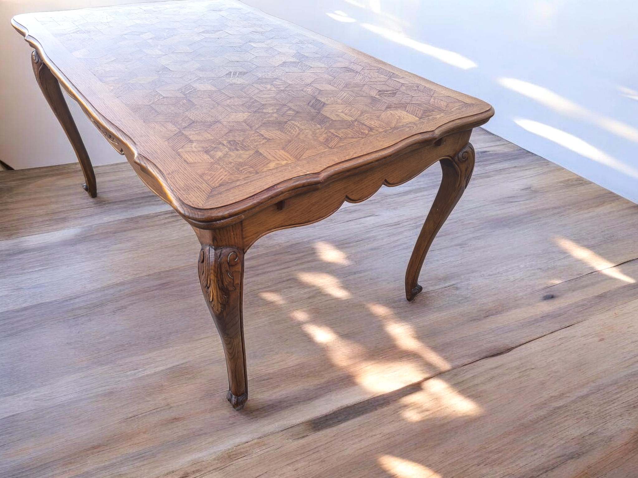 Kecses lábakkal, parkettás mintázatú lappal amely két oldalra hosszabbítható .