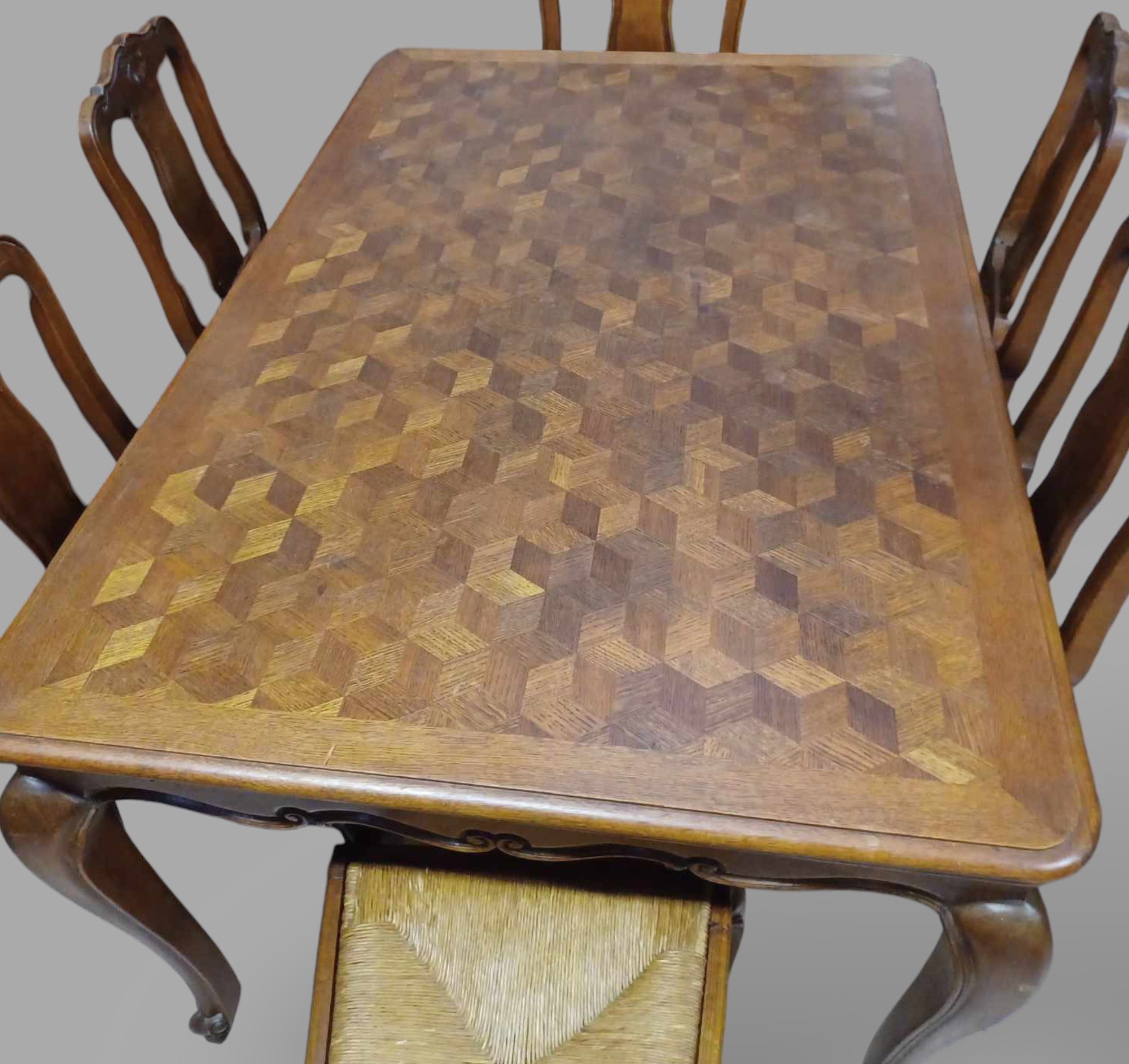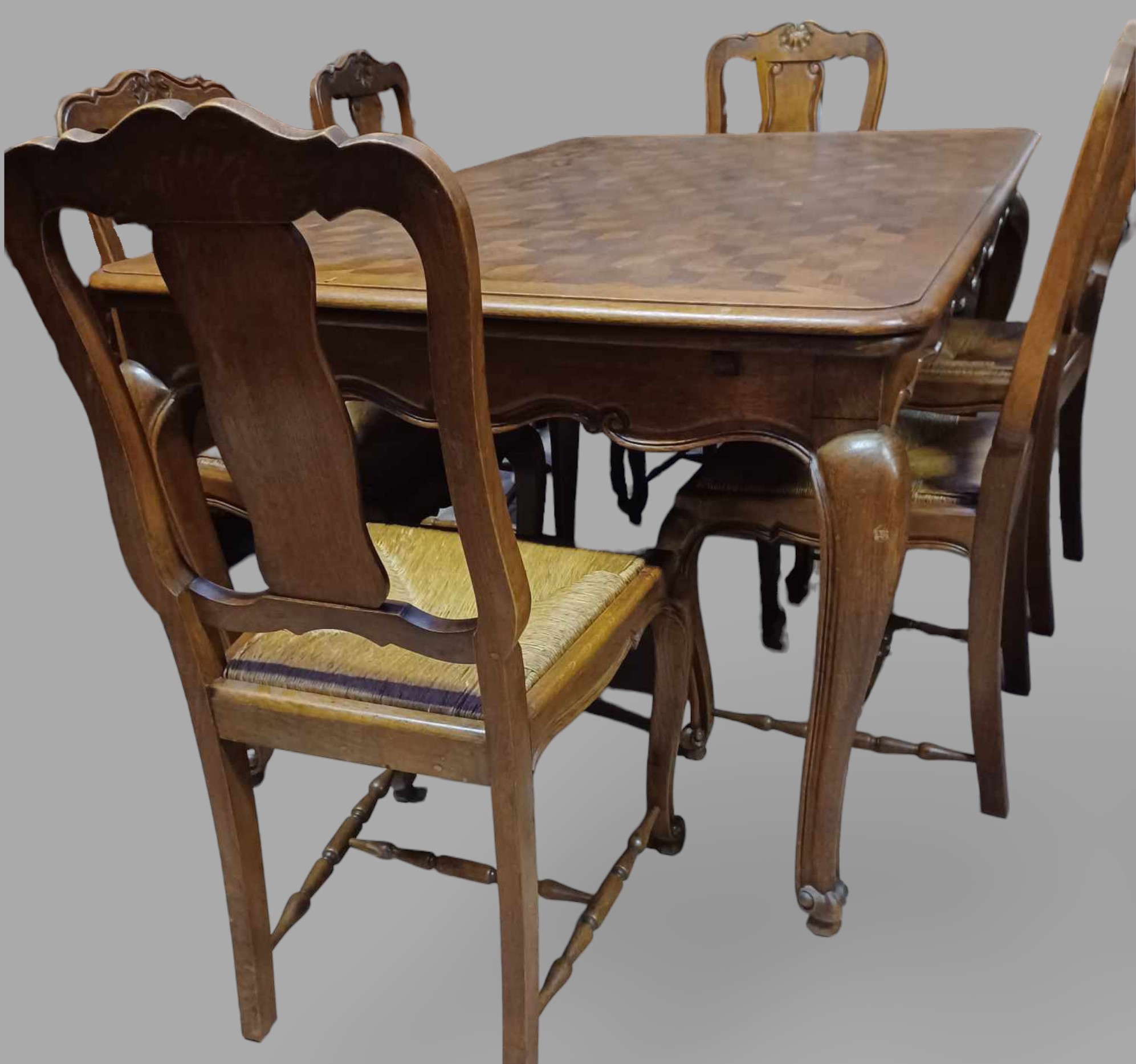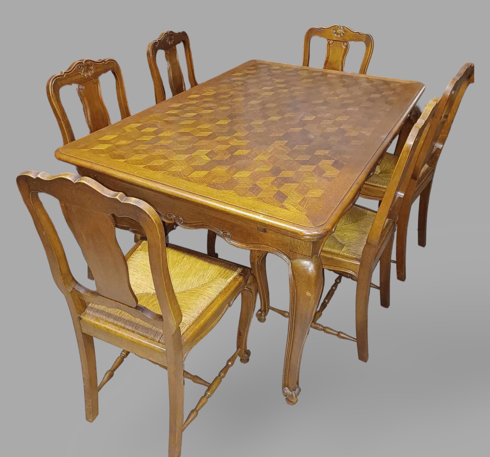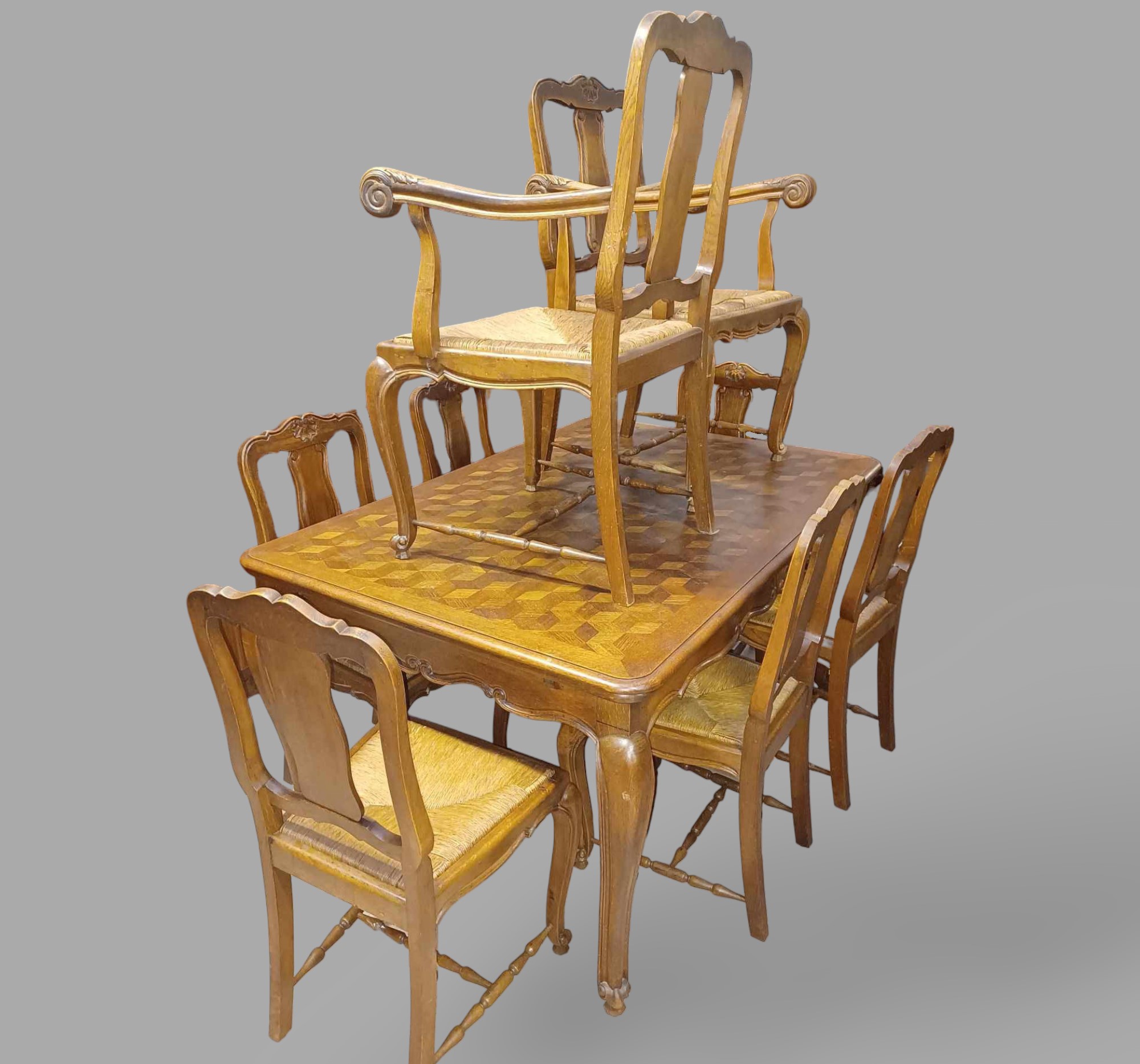 Eladó neobarokk étkező garnitúra szép állapotban. Nyolc szék tartozok a szetthez, amelyből kettő karos szék. Statikailag mindegyik kiváló, teljes egészében fából készült minden eleme. Az asztal lapja esztétikus, rombusz mintázatú intarzia berakásokkal, továbbá két oldalra hosszabbítható 2x54 cm-rel. Székek rattan borításúak, így akár folyó víz alatt is tisztítható. Igény esetén kárpitozásban tudunk segíteni.