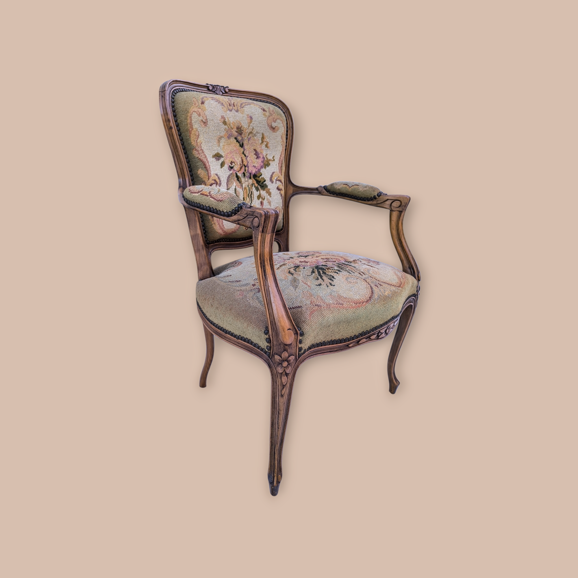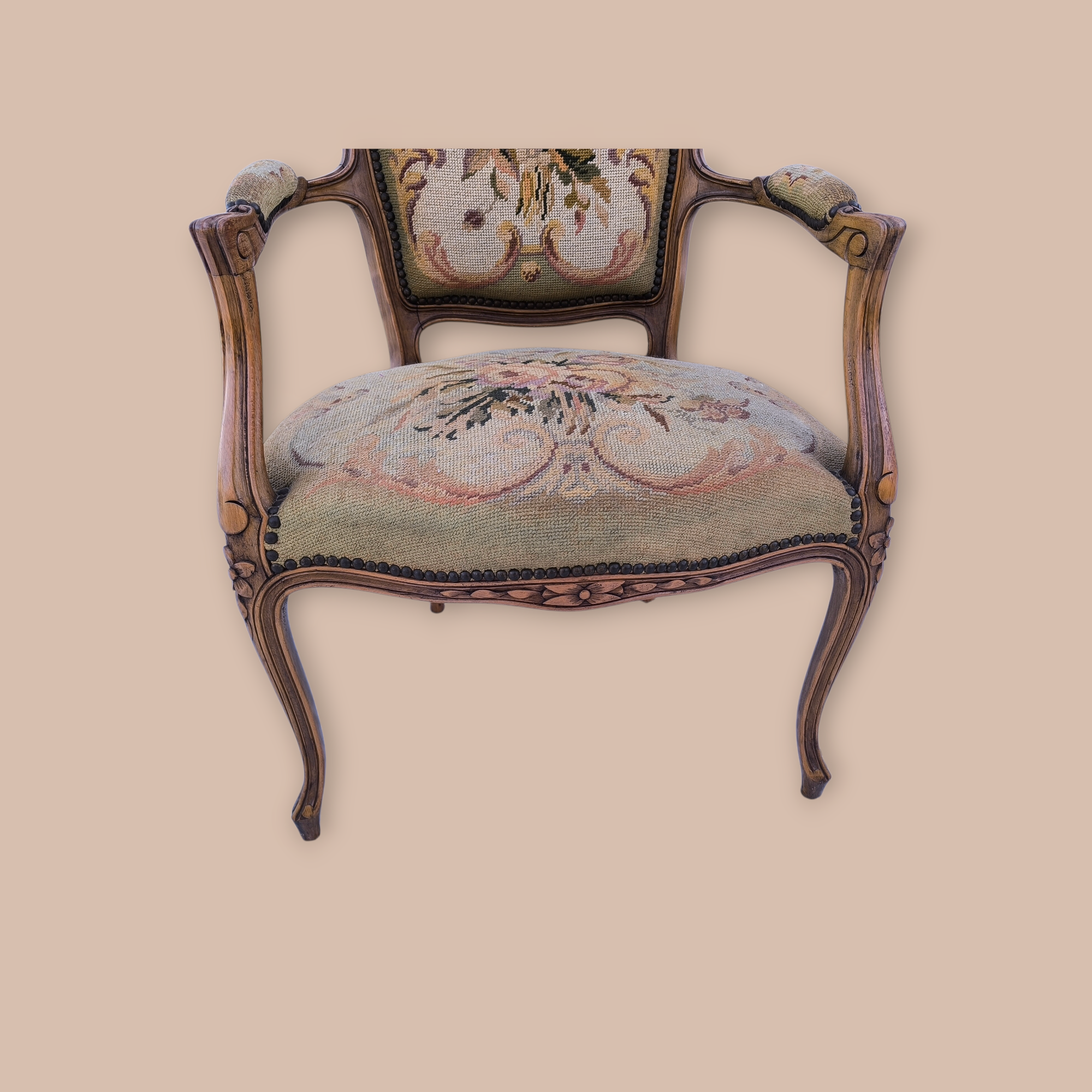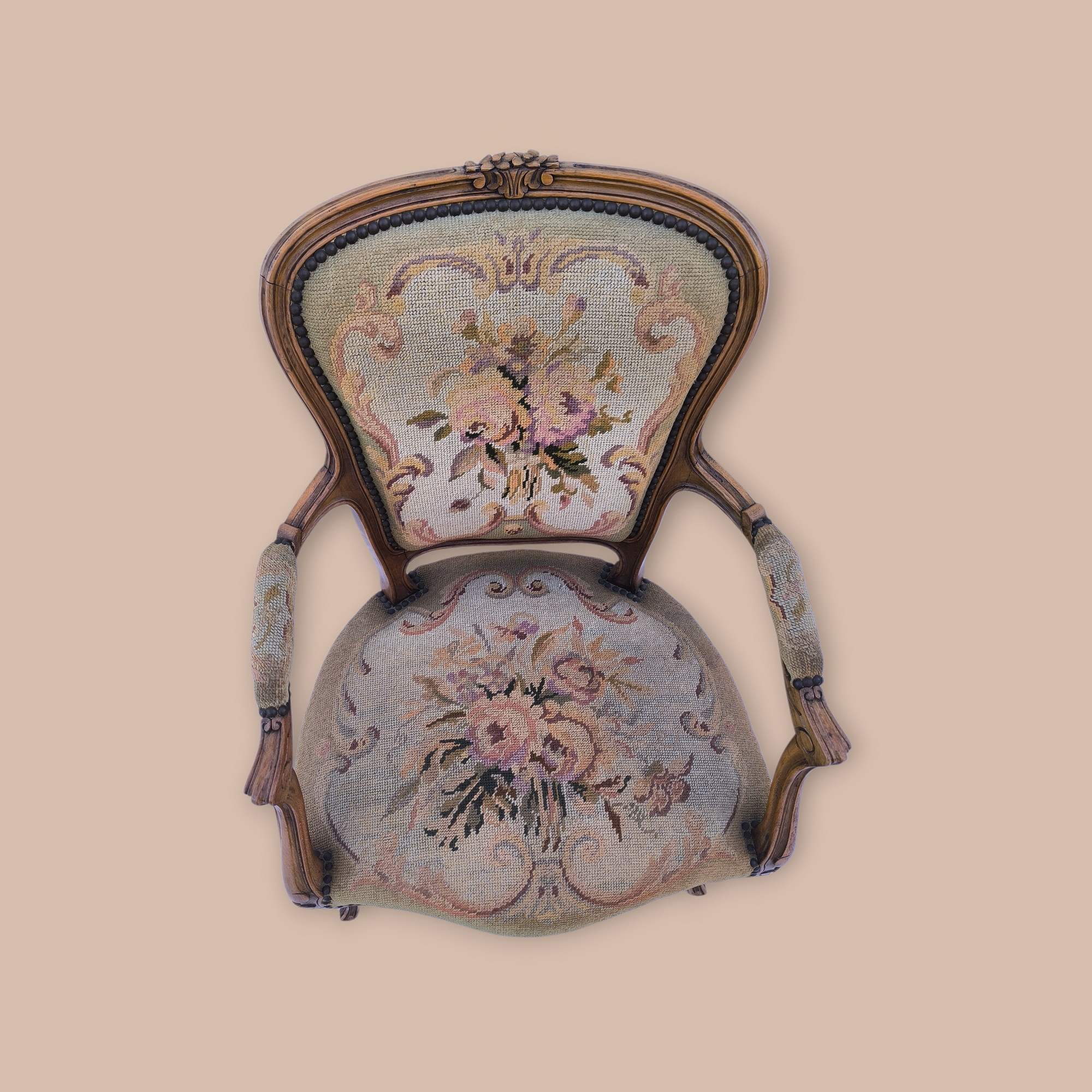Eladó egy neobarokk gobelines fotel,karosszék . Kecses ívelt fa részekkel, stabil de mégis kényelmes kivitel. Gazdagon díszített gobelin mintás kárpittal.