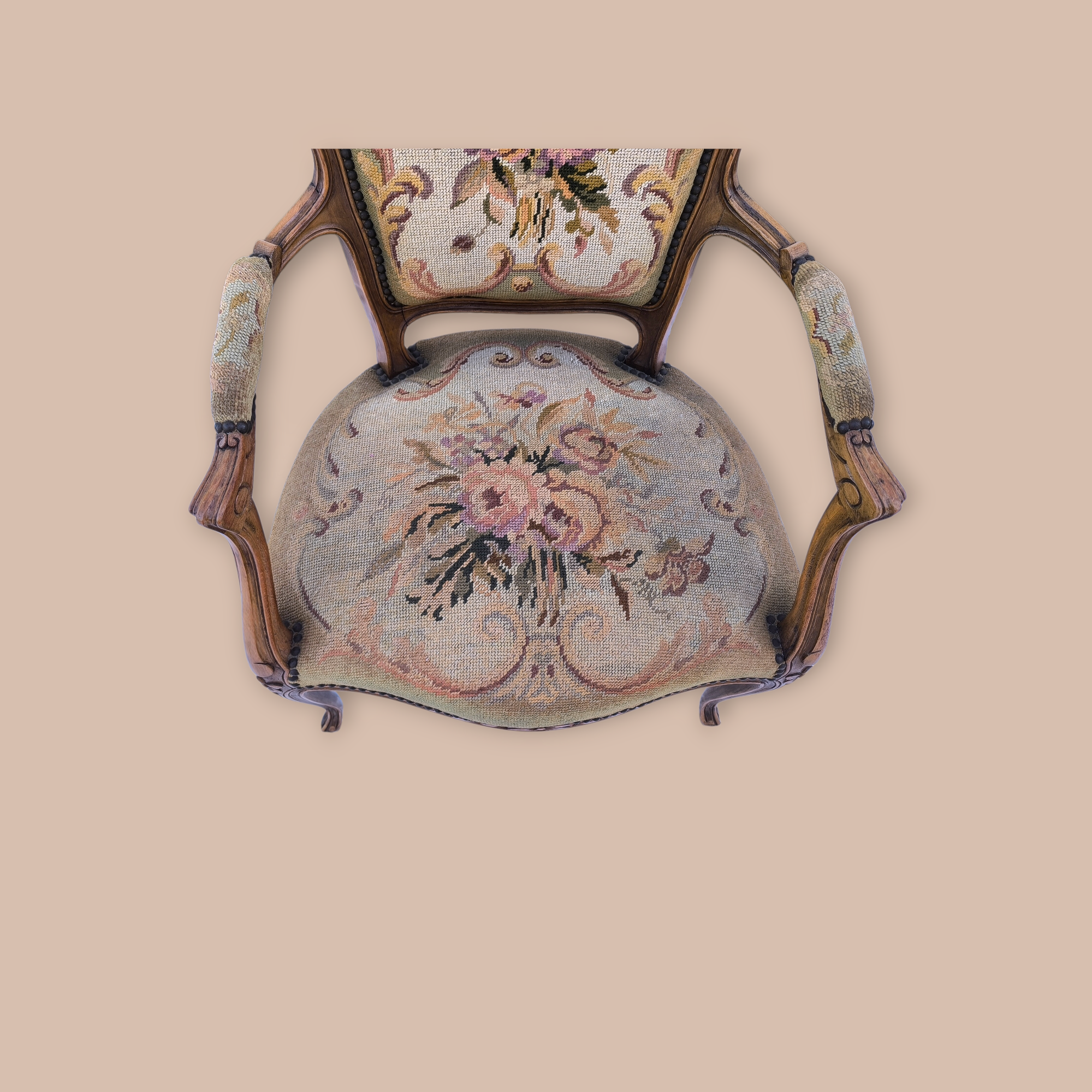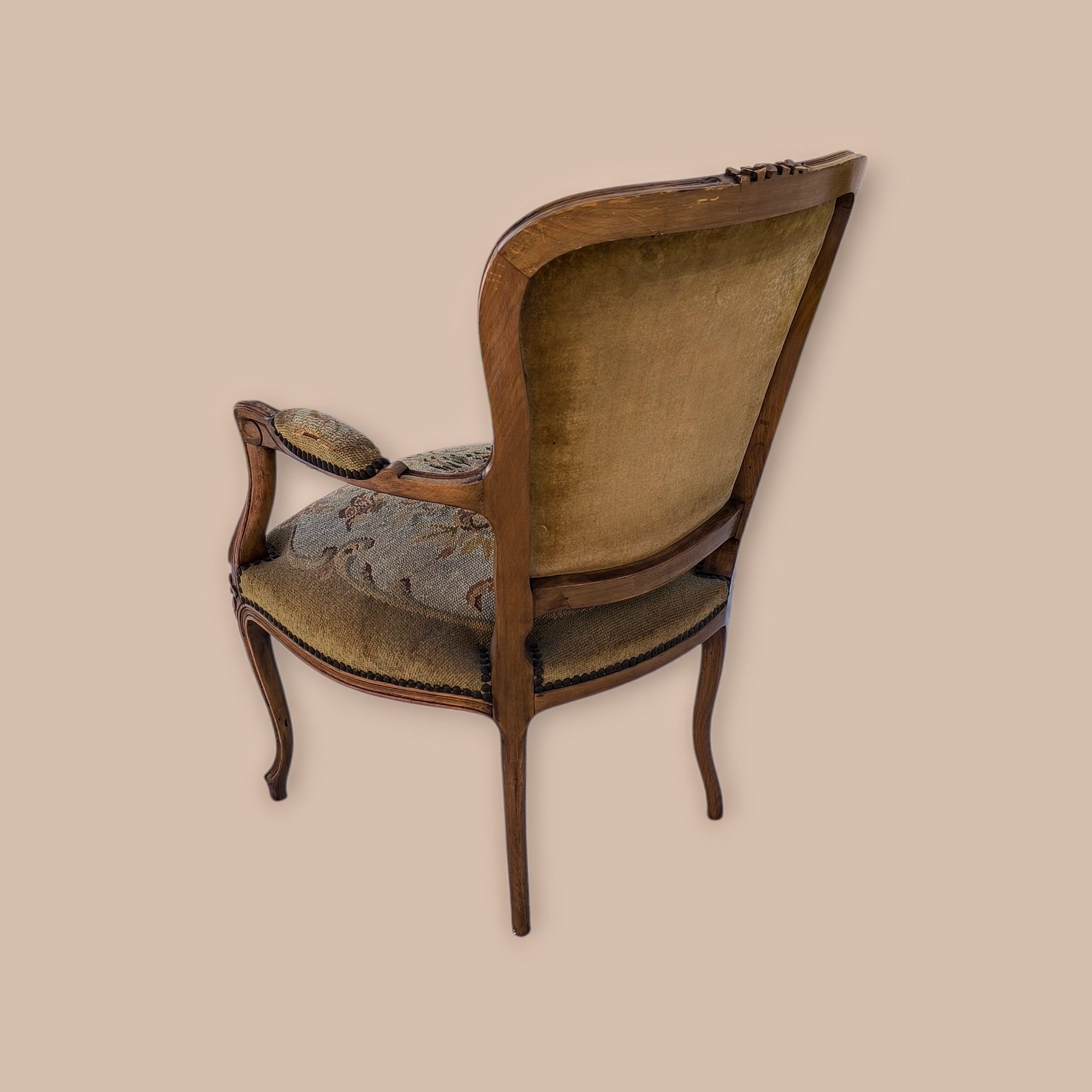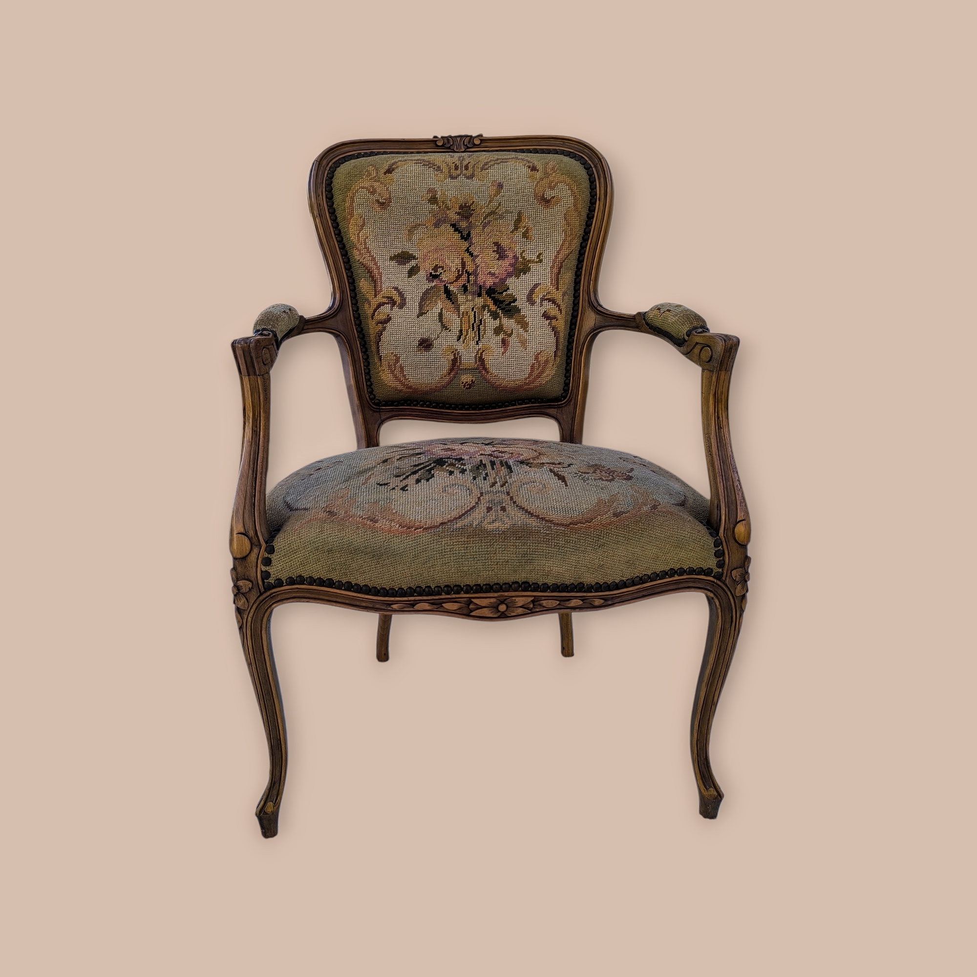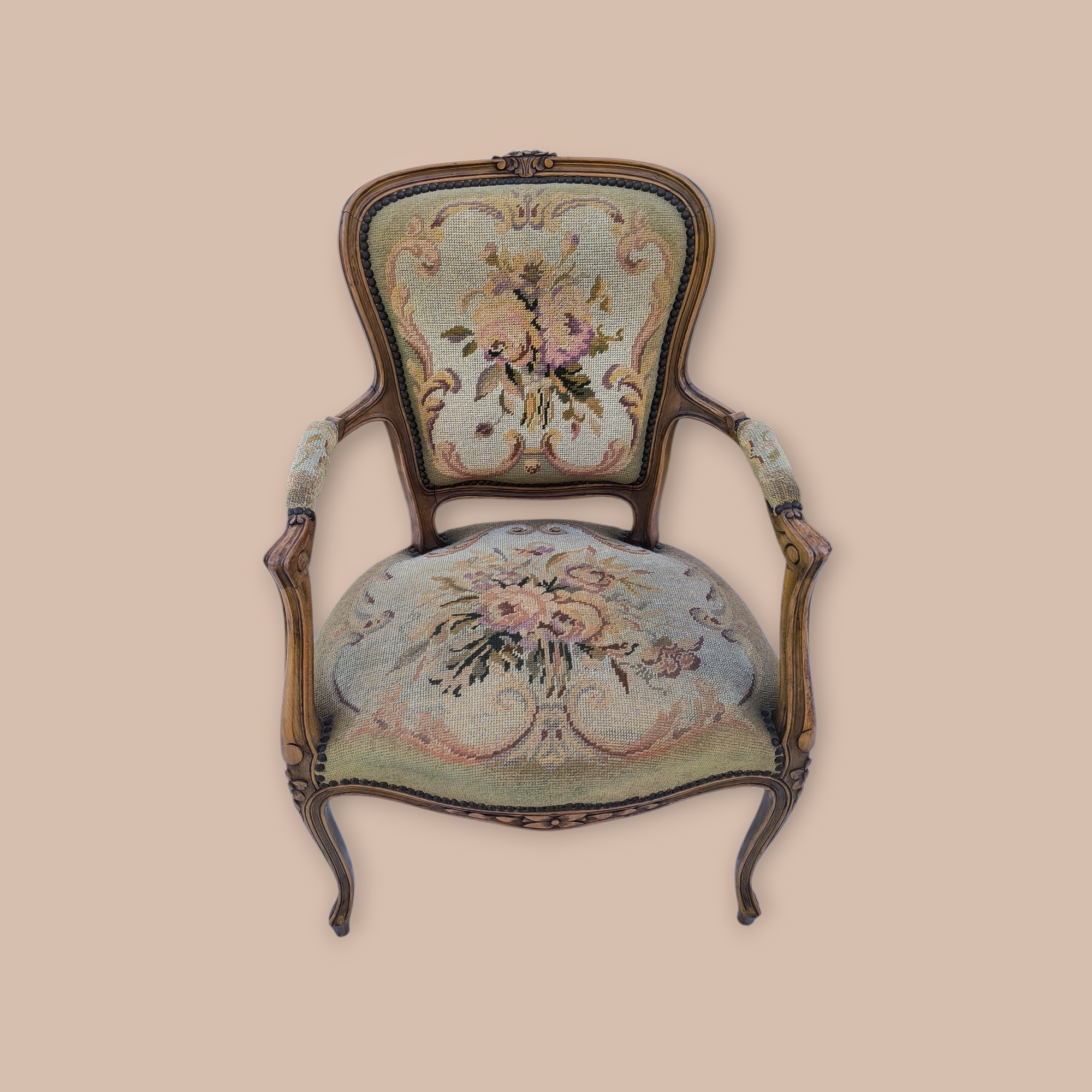 Eladó egy neobarokk gobelines fotel,karosszék . Kecses ívelt fa részekkel, stabil de mégis kényelmes kivitel. Gazdagon díszített gobelin mintás kárpittal.
