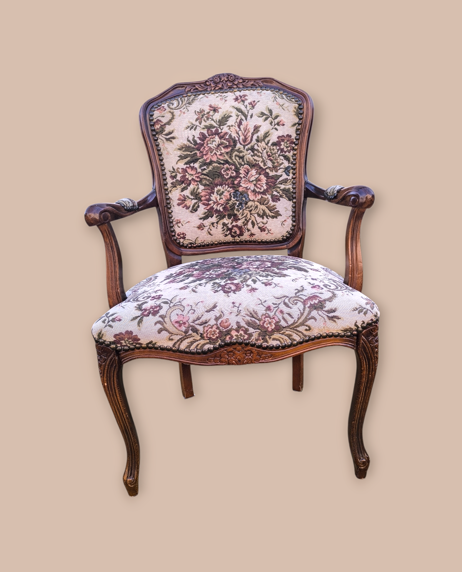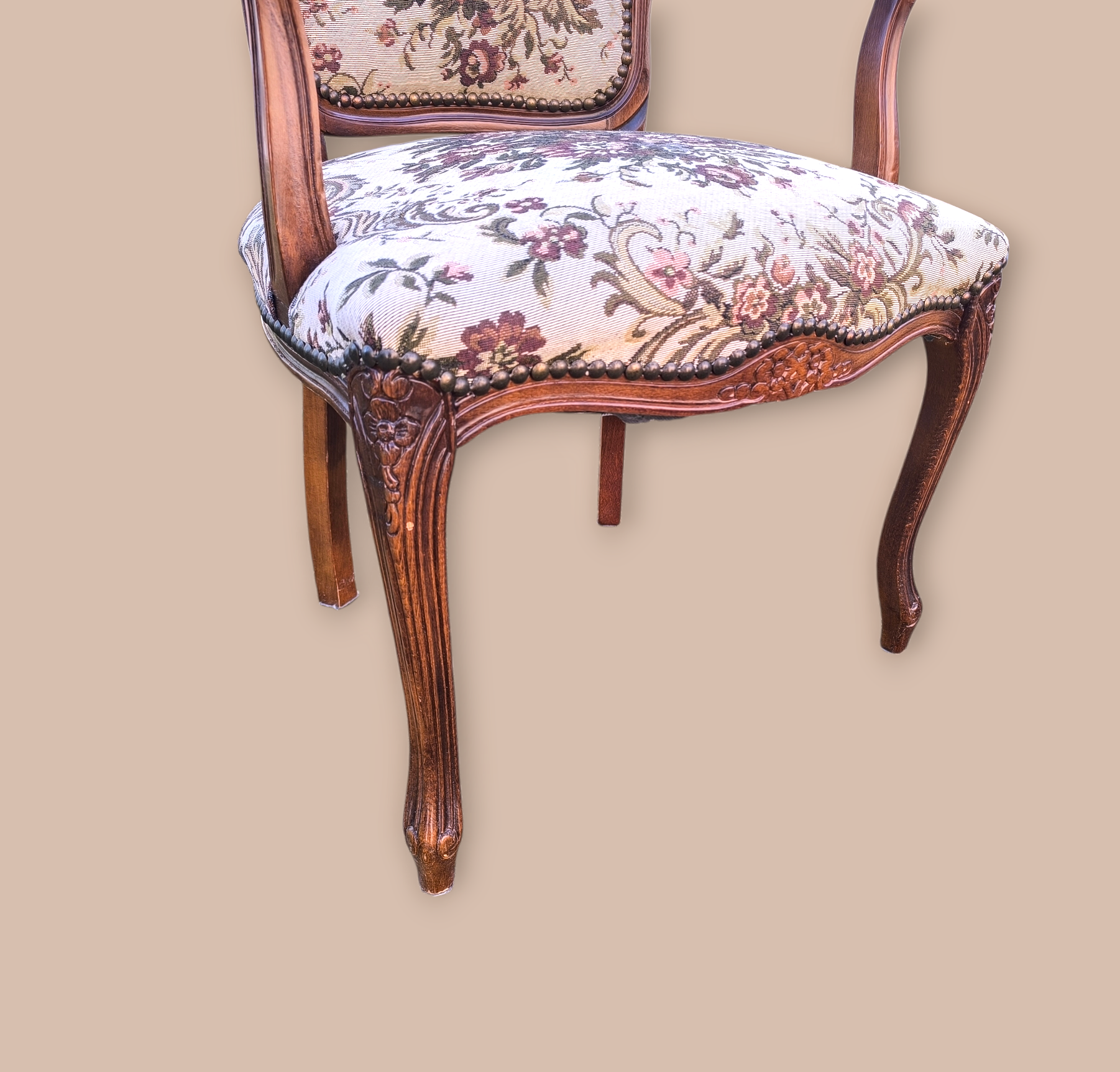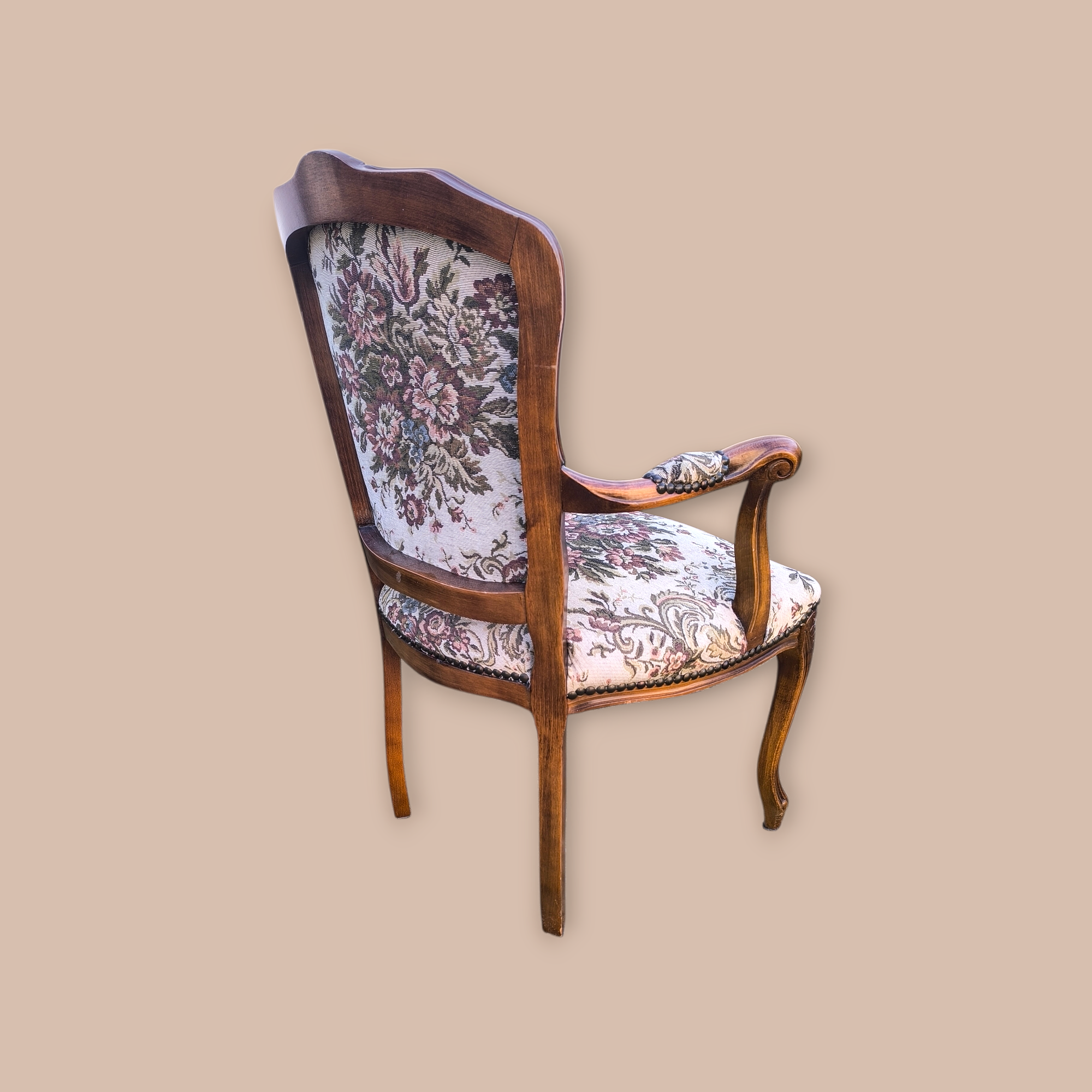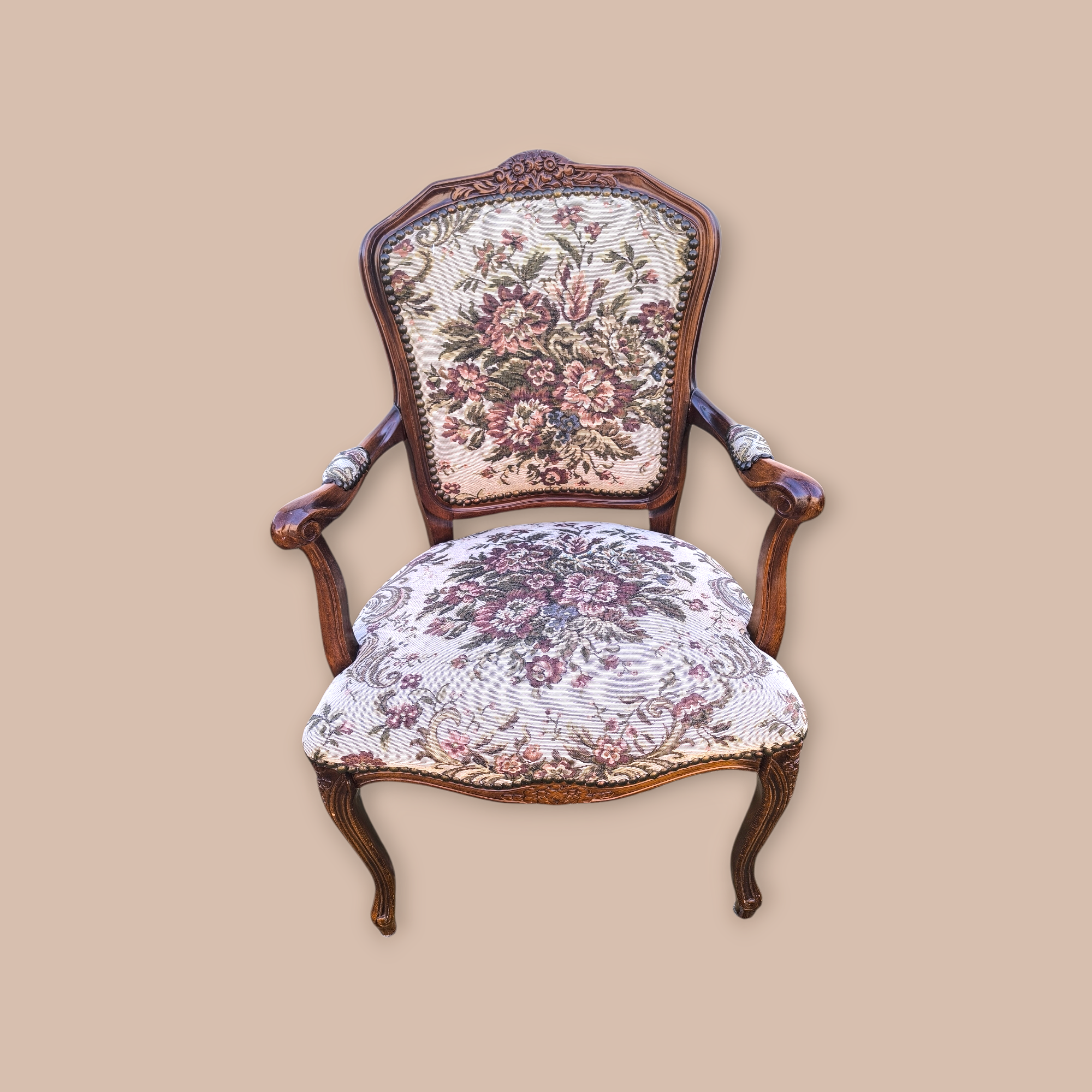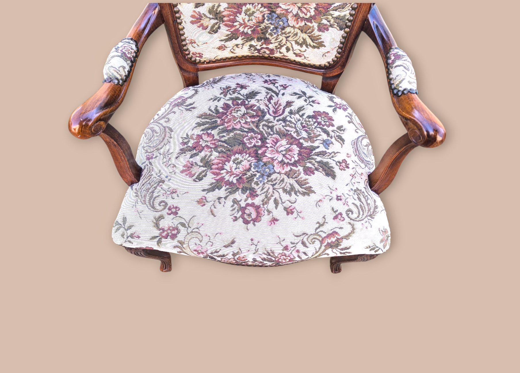 Eladó egy neobarokk gobelines fotel,karosszék . Kecses ívelt fa részekkel, stabil de mégis kényelmes kivitel. Gazdagon díszített gobelin mintás kárpittal.