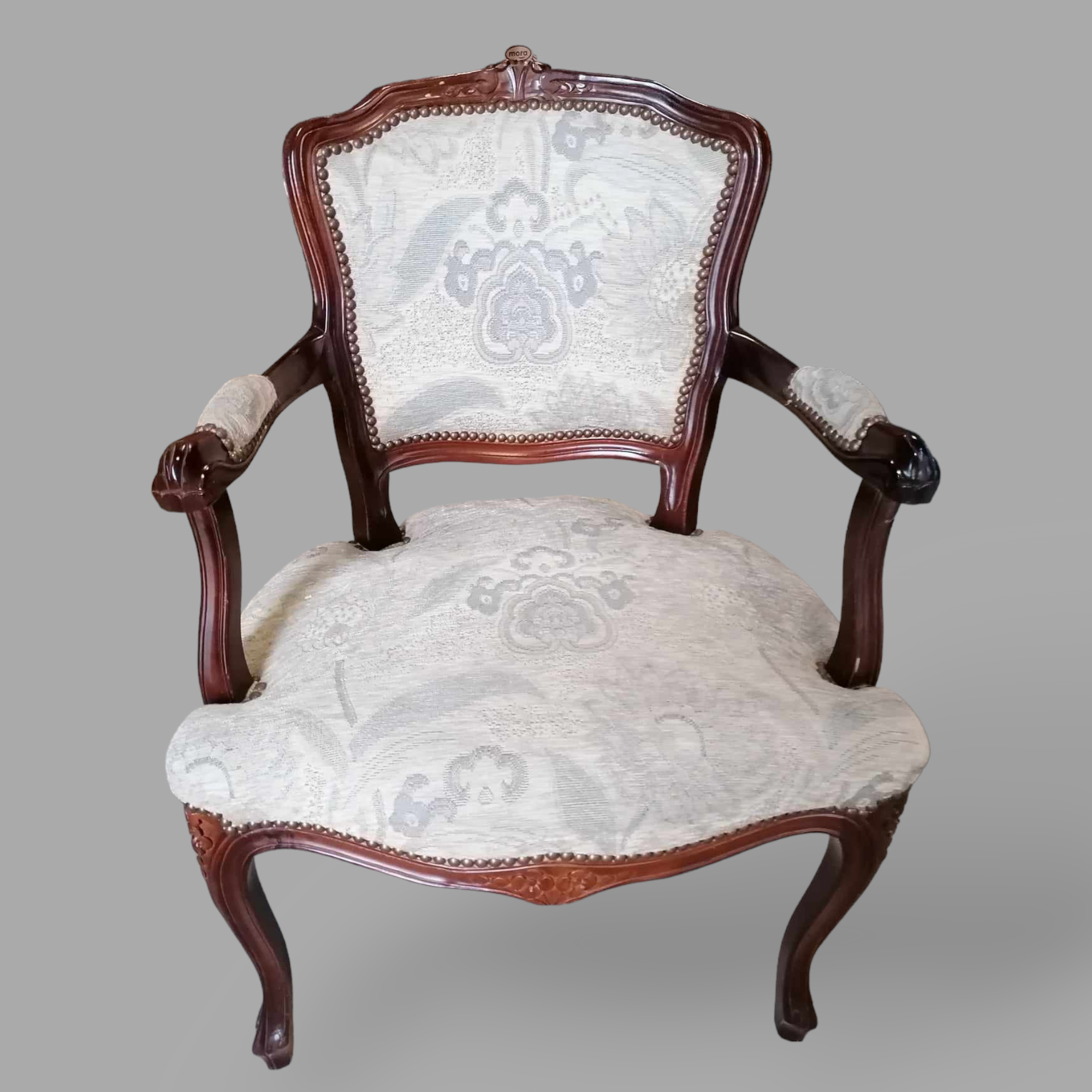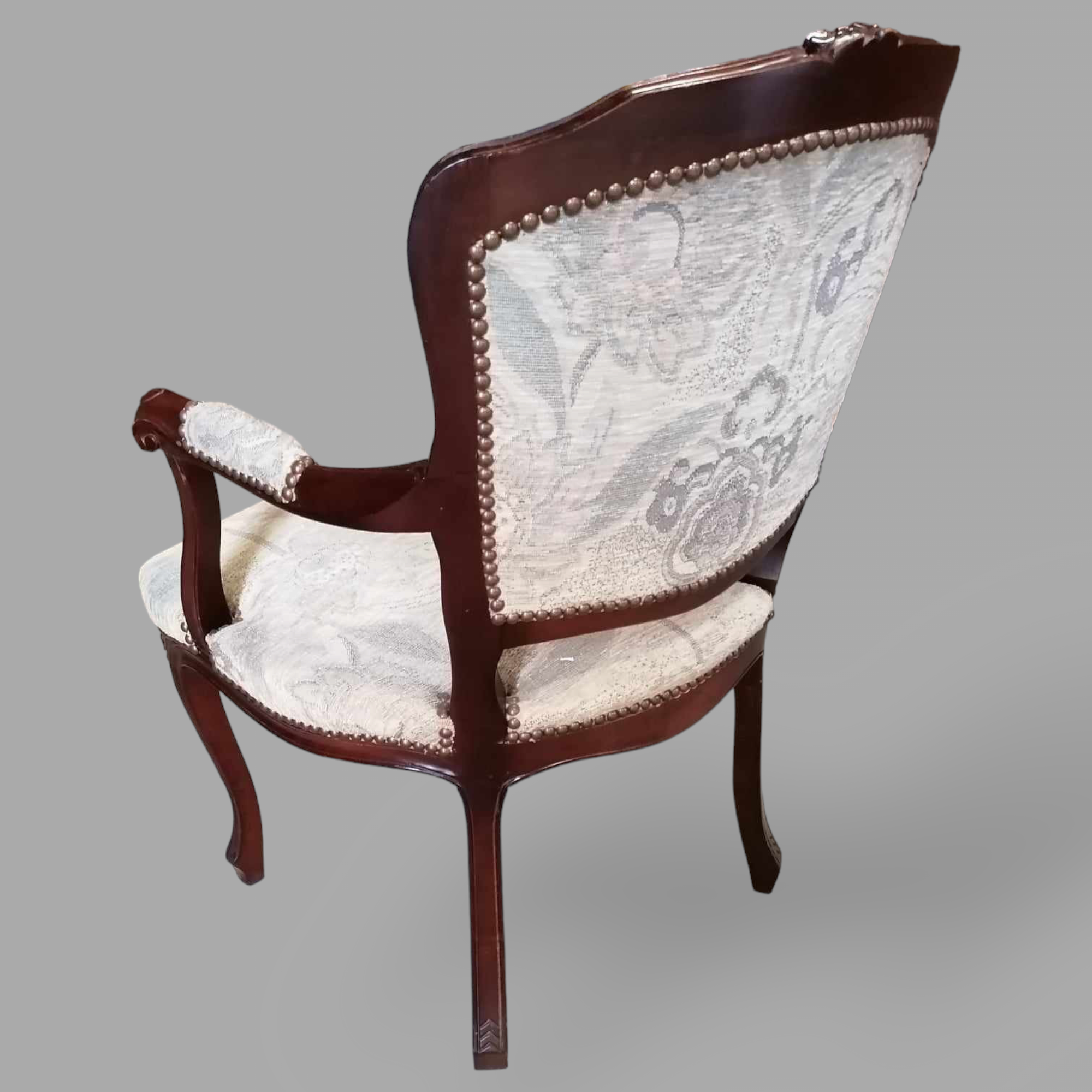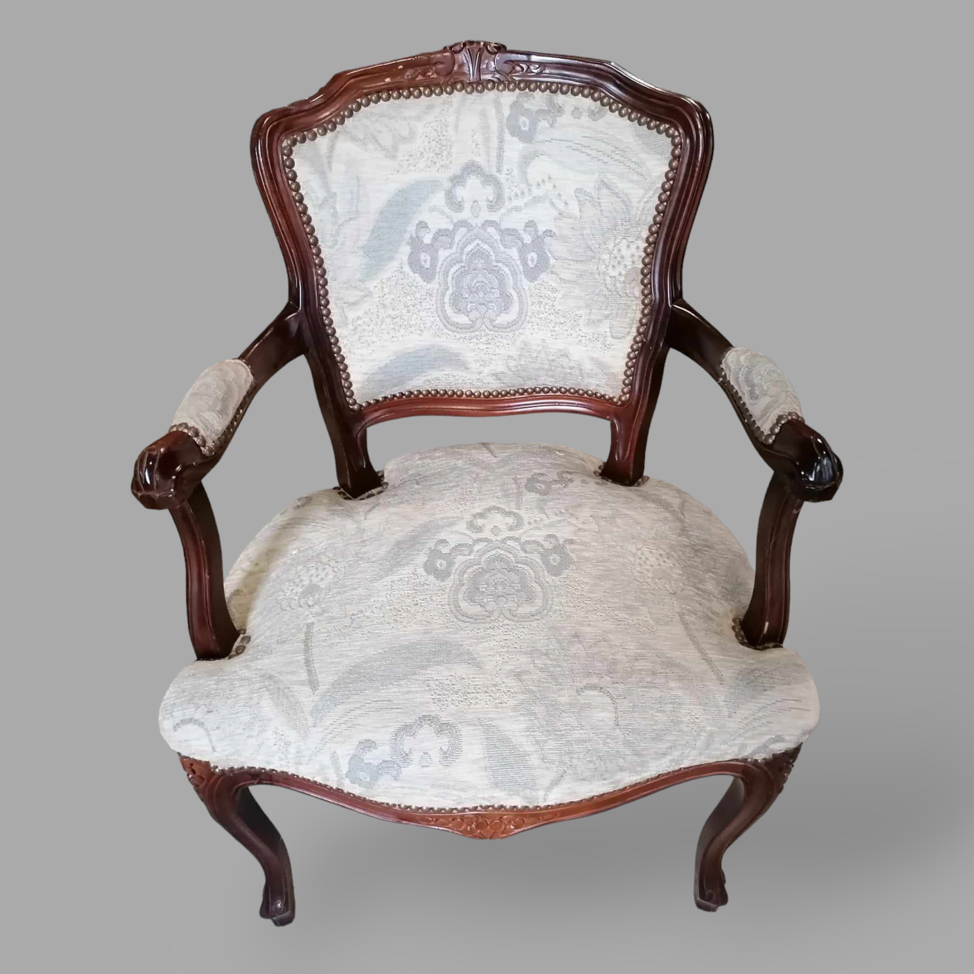 Eladó neobarokk karos szék szép állapotban. Kecses, ívelt lábakkal, stabil szerkezettel, hibátlan virág mintás, világos kárpittal. Karfák is kopásmentesek, igényes megjelenésű darab. Ajanlom dohányzóasztal mellé, előszobába, vagy akár teázó sarokba.