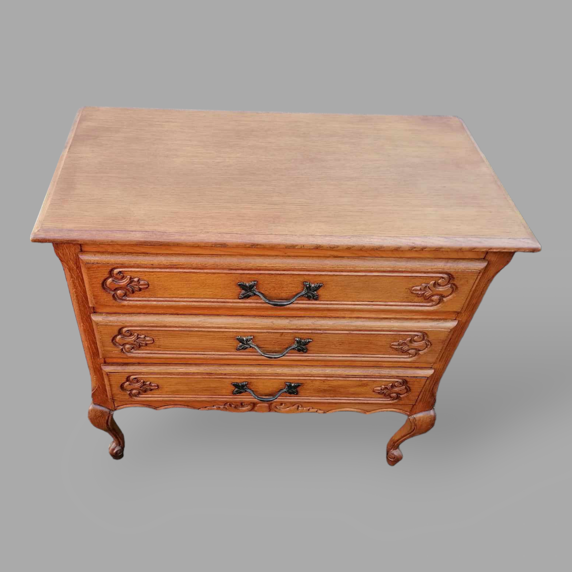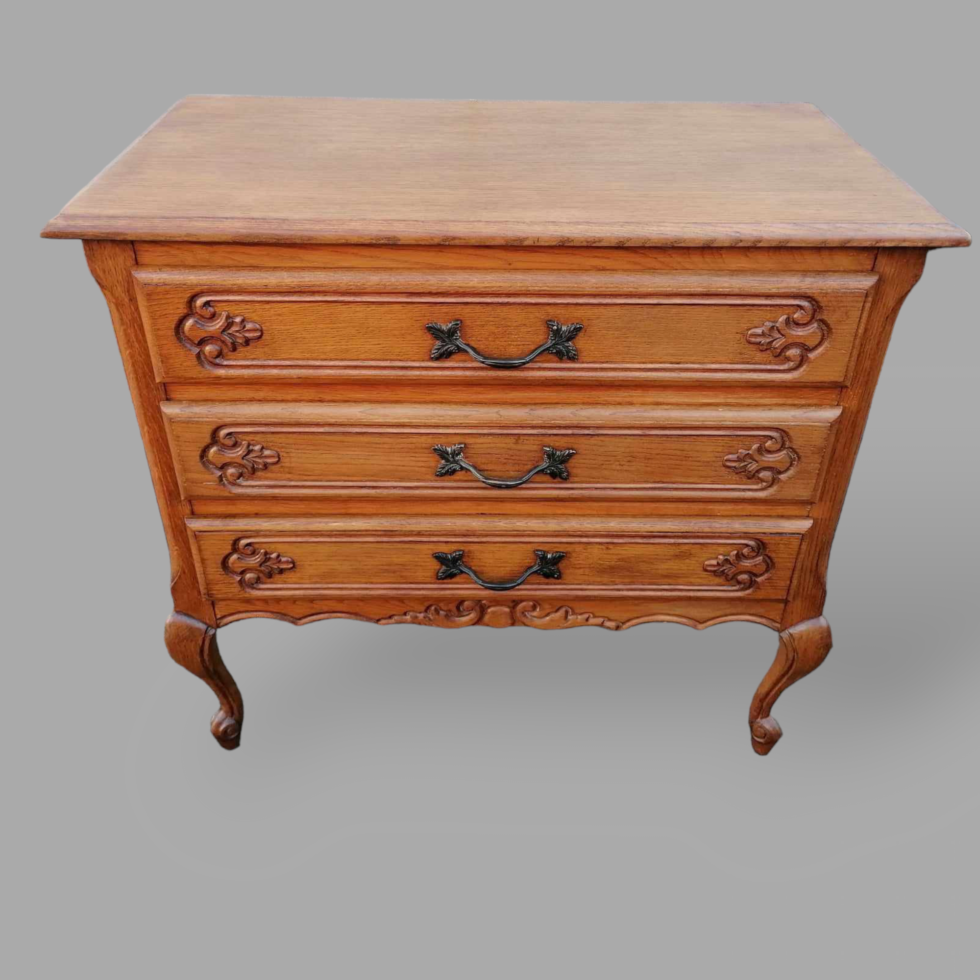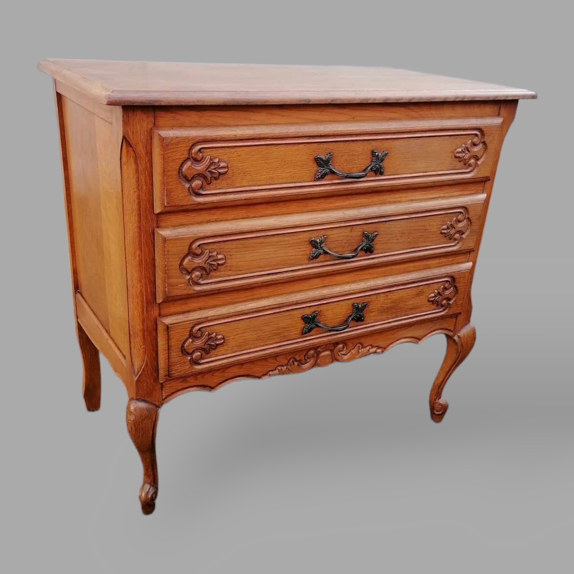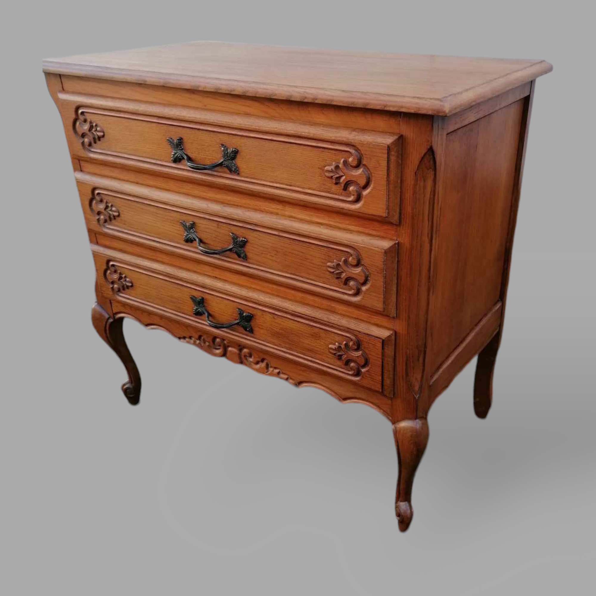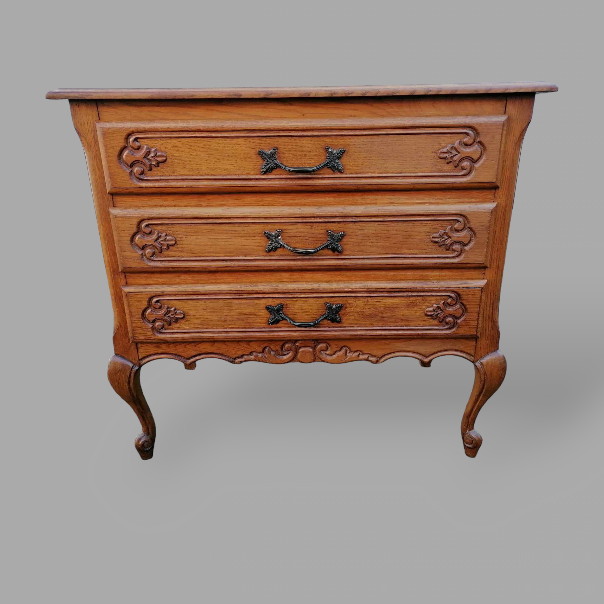 Eladó neobarokk fiókos komód szép állapotban. Három fiókos kivitel, kecses ívelt lábakkal, díszes első résszel. Fem fogantyúkkal szerelt, lapja esztétikus.