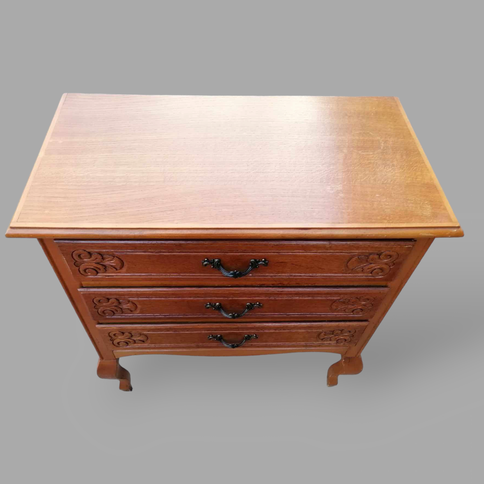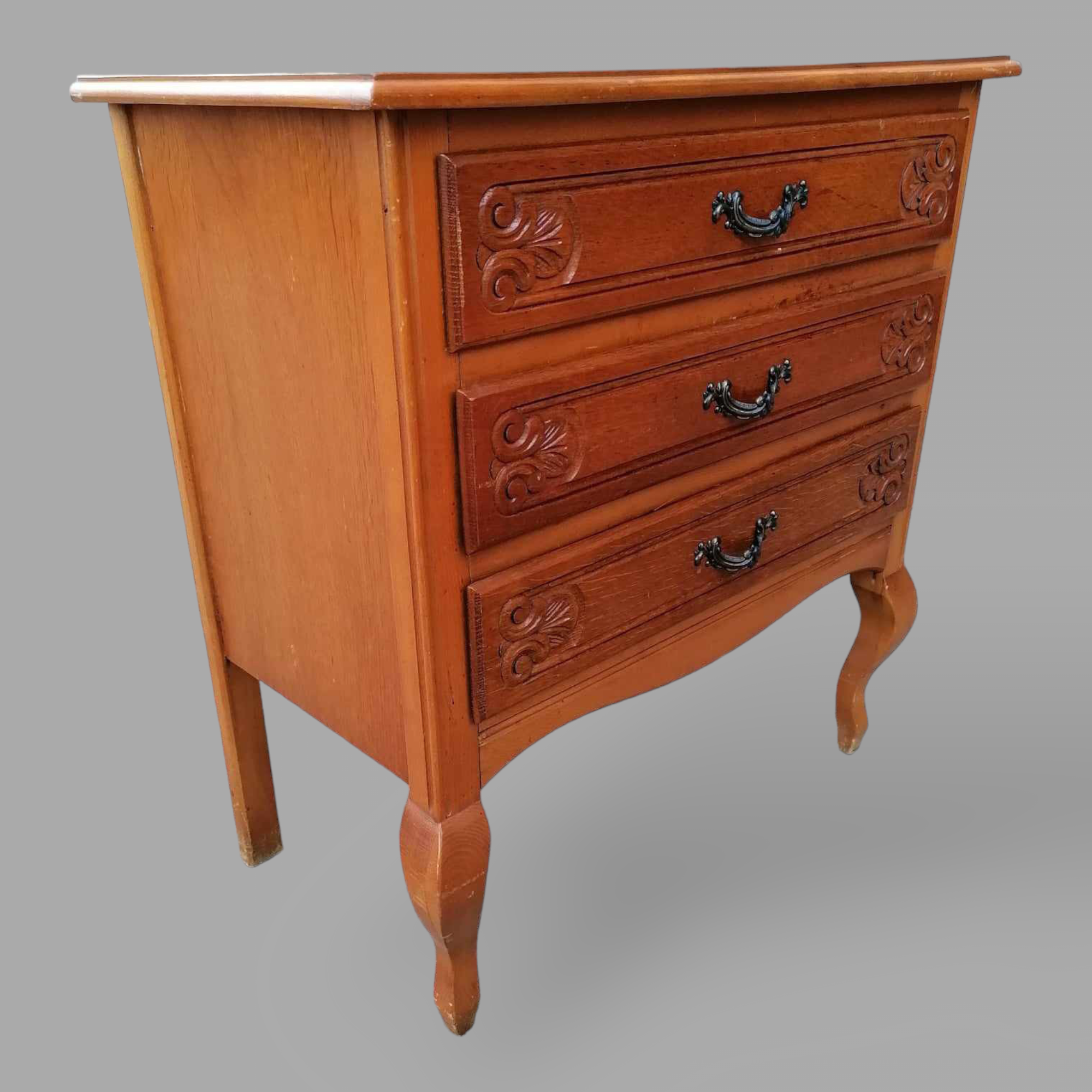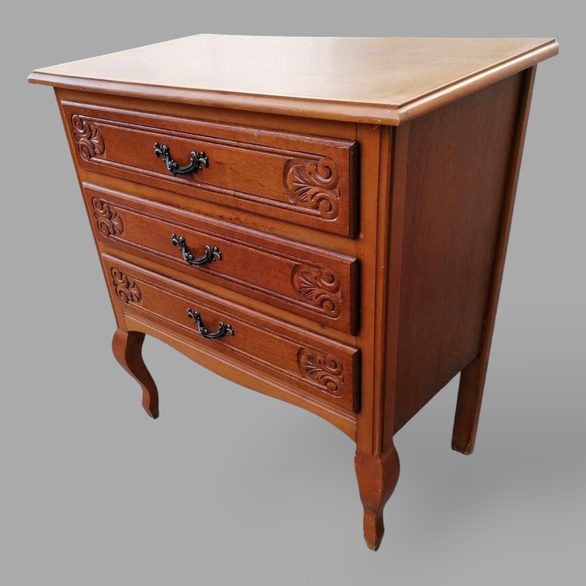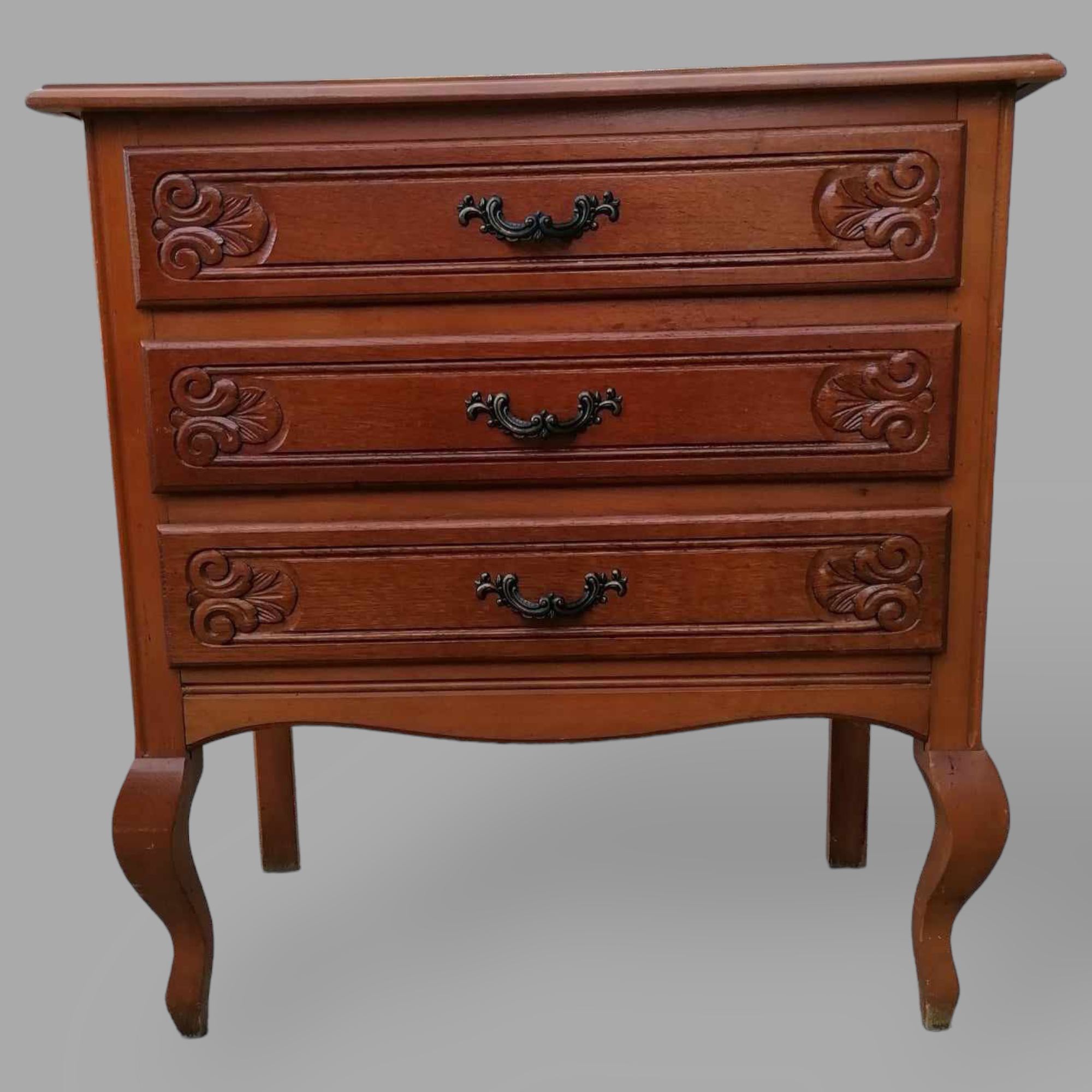 Eladó neobarokk komód szép állapotban. Három fiókos kivitel, kecses ívelt lábakkal. Fém, díszes fogantyúkkal közepén, lapja is esztétikus.