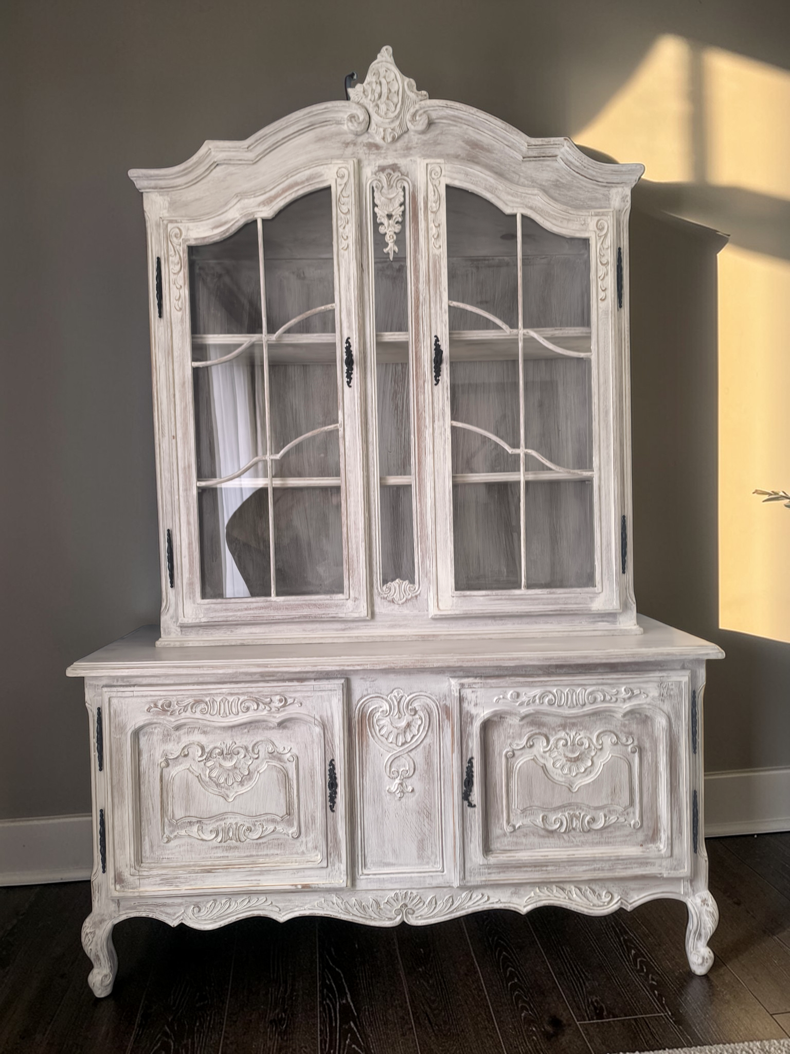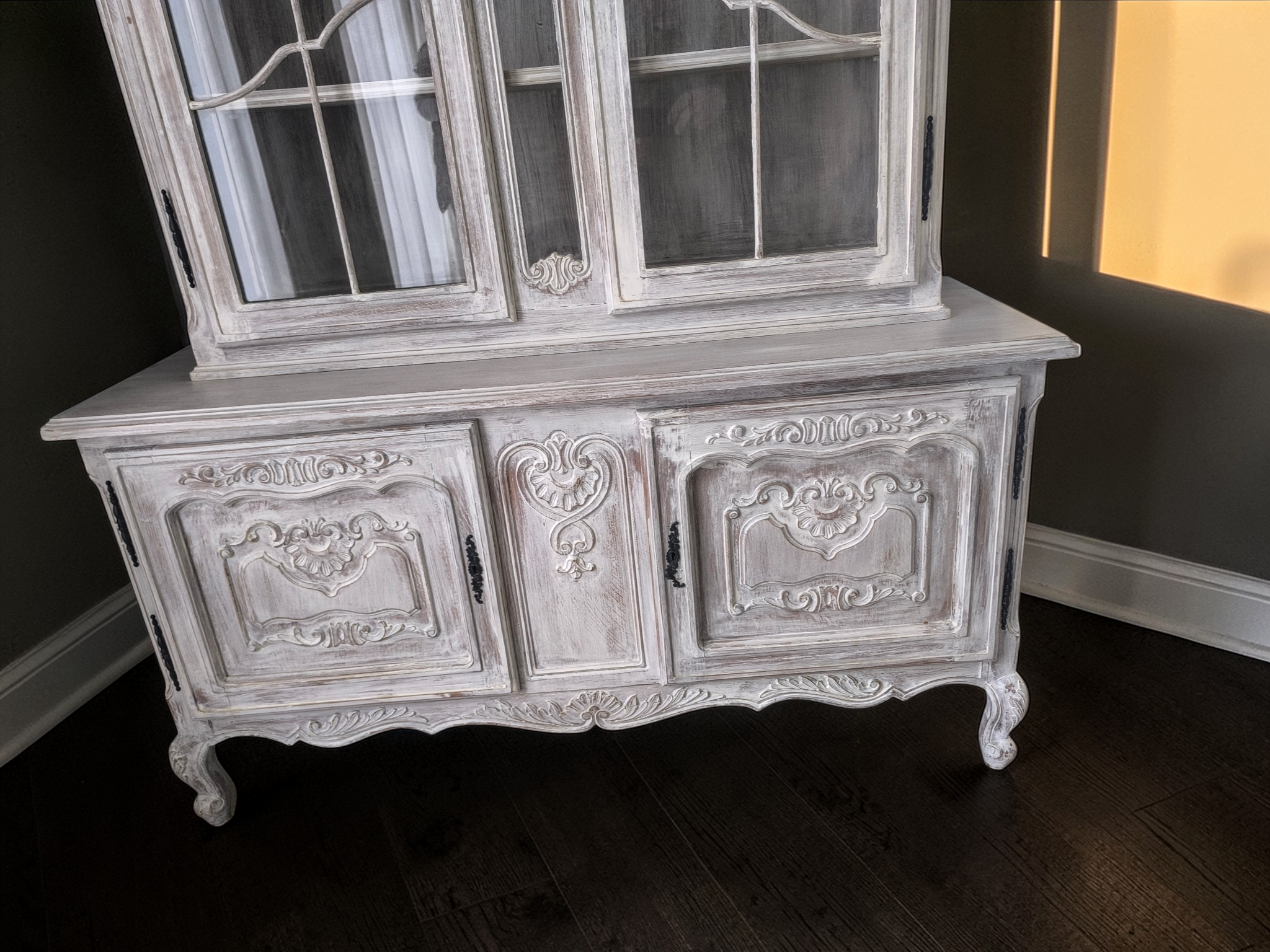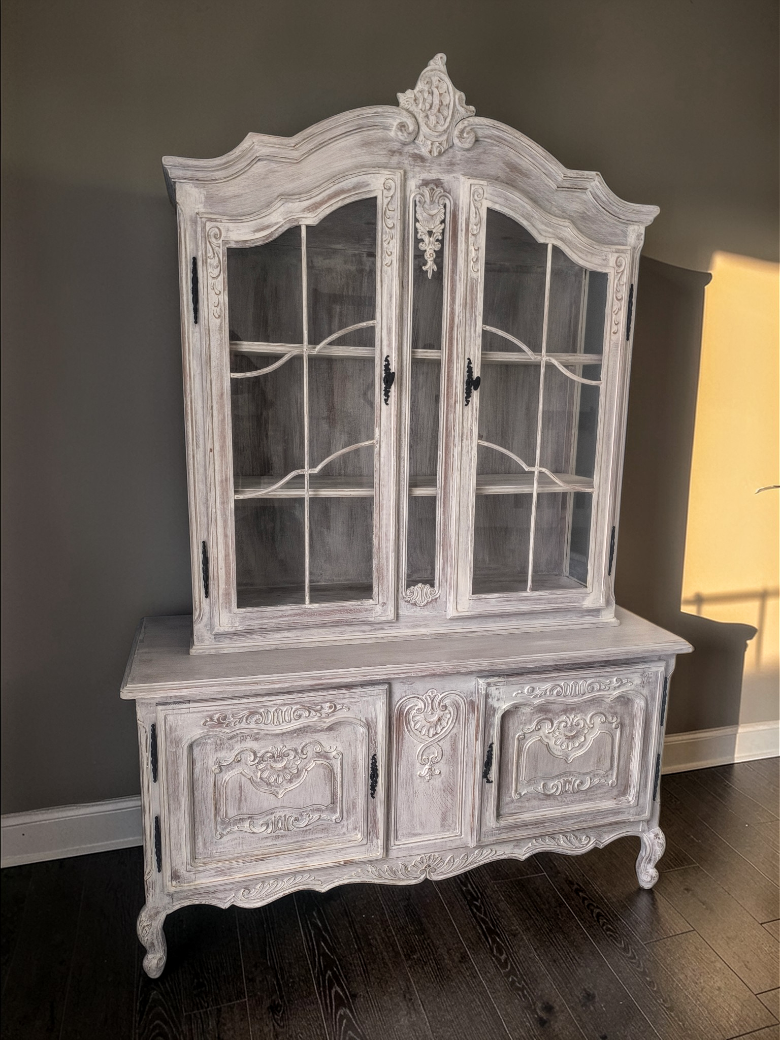 Alul ajtós, díszes faragásokkal, kecses lábakkal. Felül vitrinnel ami oldalt is üveges kivitelű.