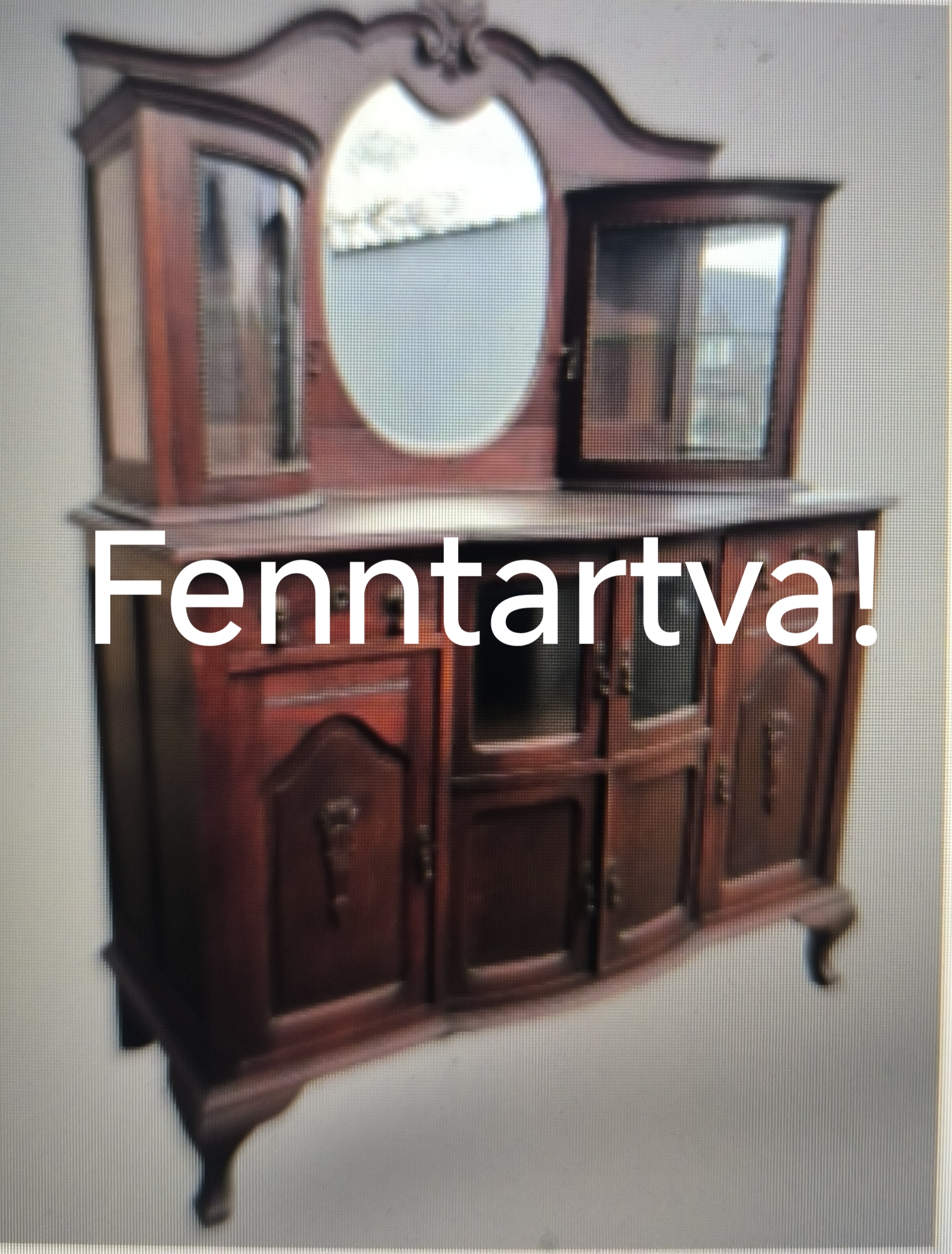 Eladó neobarokk tálaló-komód szép állapotban. Kecses, ívelt lábakon áll. Alul ajtós és fiókos részekkel, felül díszes hátfallal amiben egy tükör is található, valamint íves eléjű üveg vitrinnel két oldalt. Teljes egészében fából készült, minden üveg éle csiszolt. Szállításhoz a felső elem levehető.