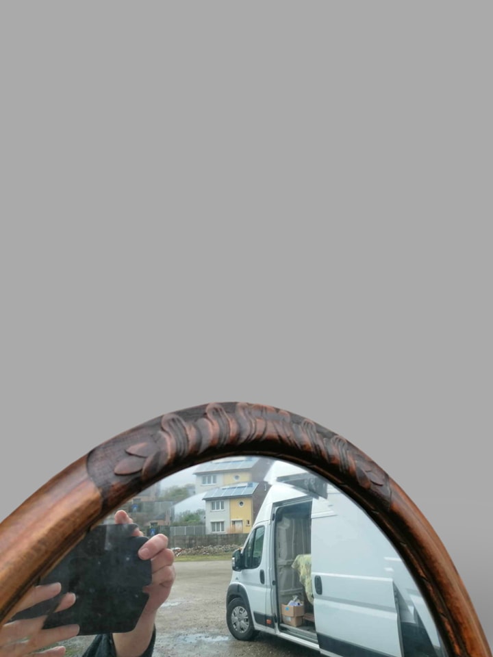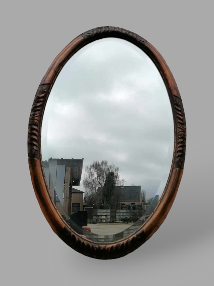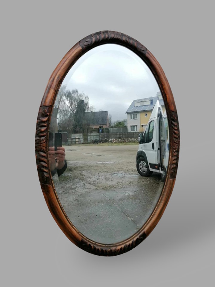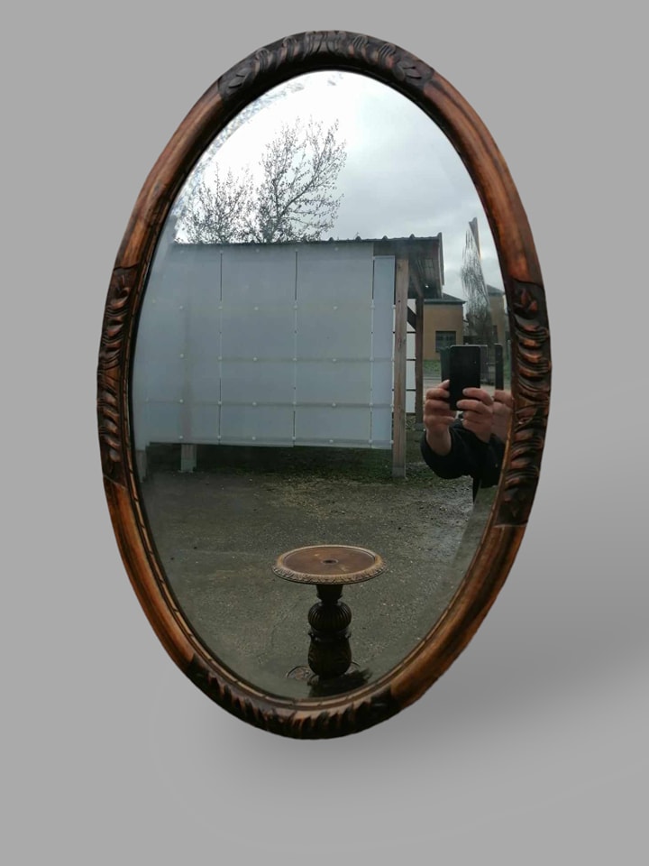 Eladó neobarokk tükör szép állapotban. Ovális fa kerettel, négy oldalán plusz apróbb virág díszítéssel. Hibátlan a tükör lap, amelynek az éle körben csiszolt. Ideális lehet előtérbe vagy fürdőszobába is akár.