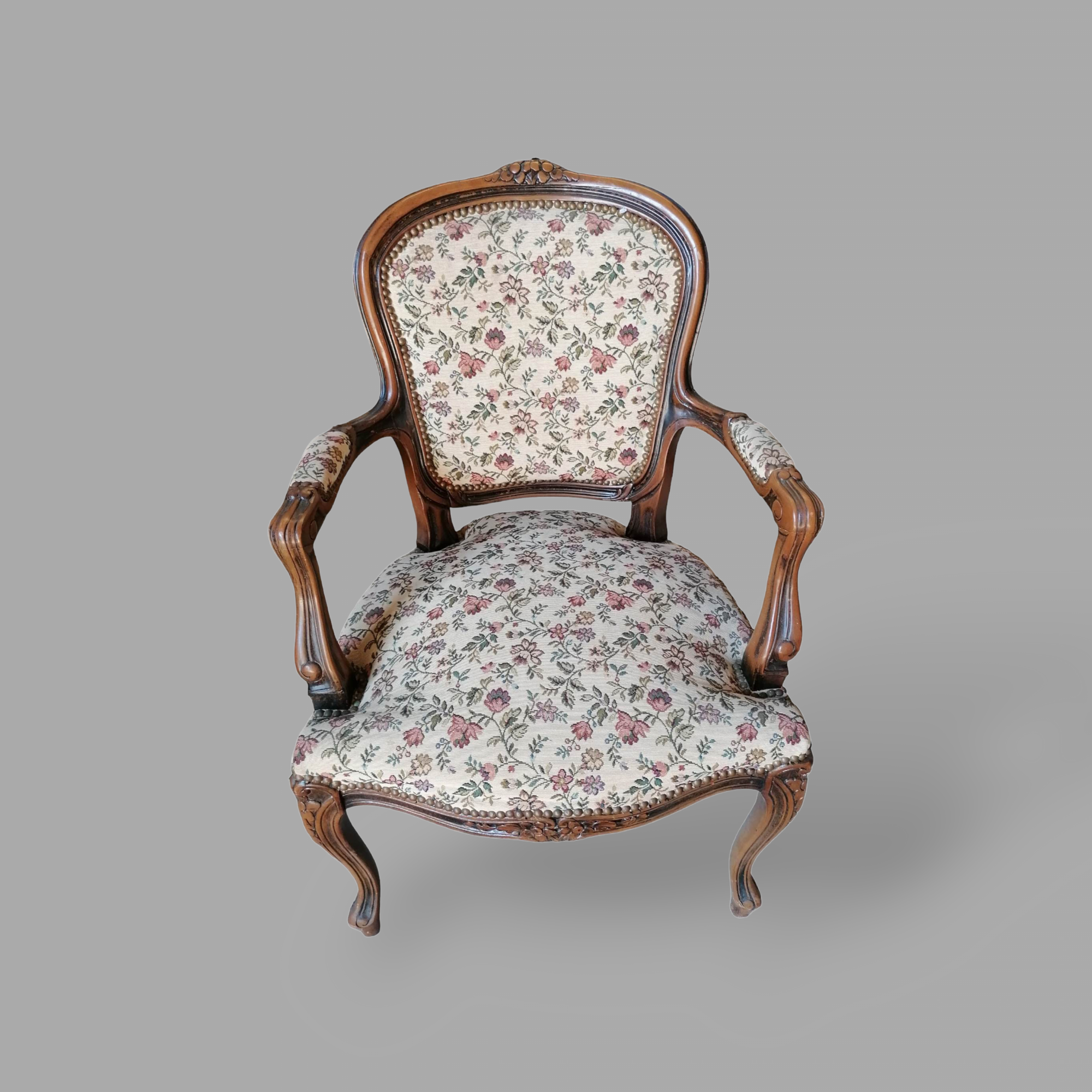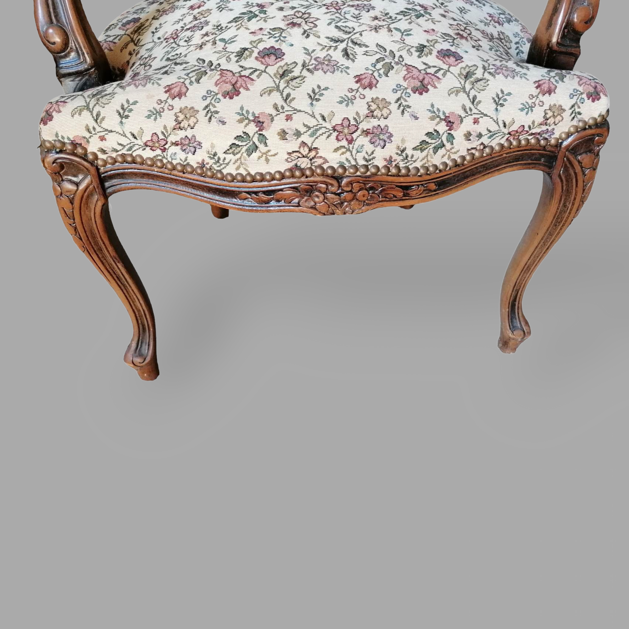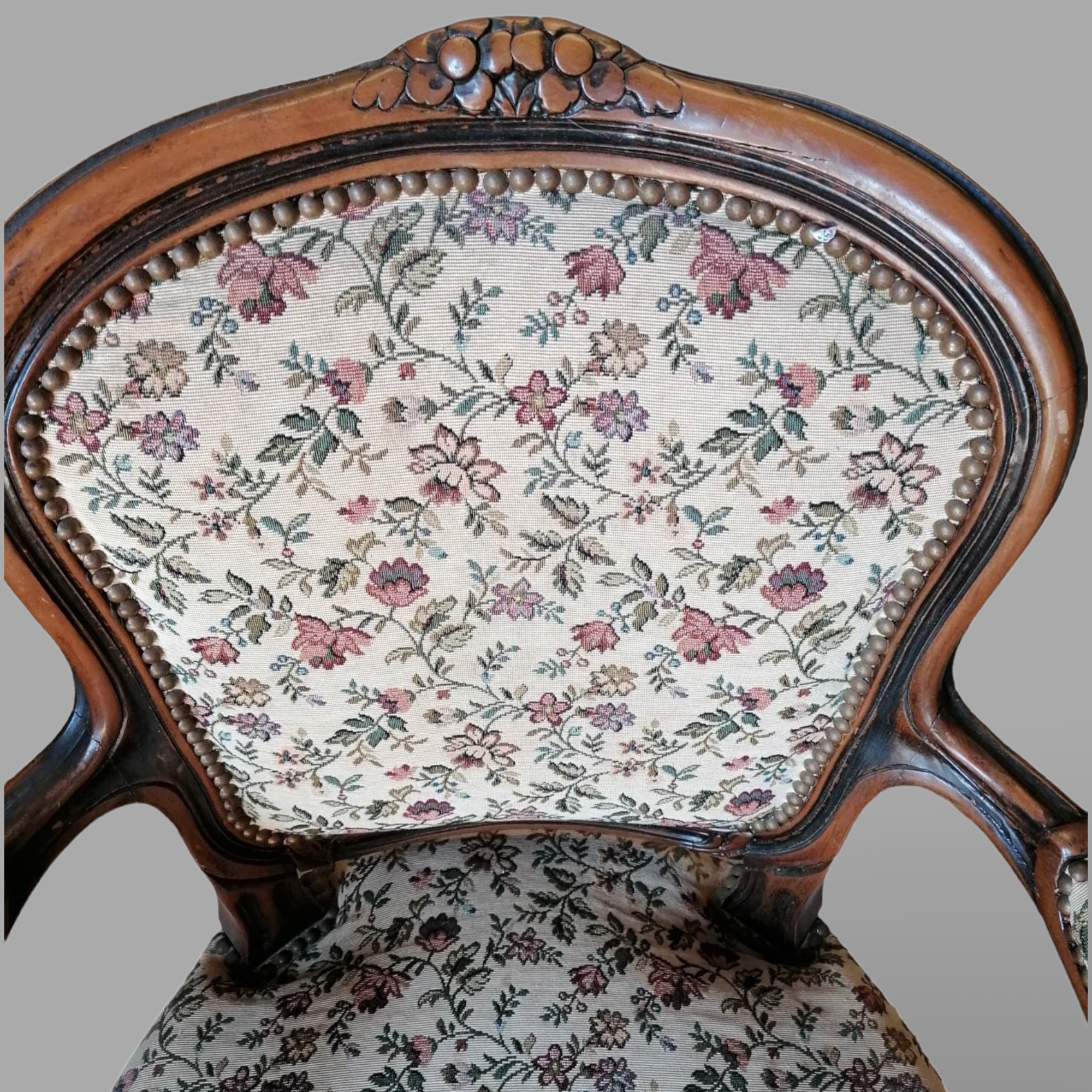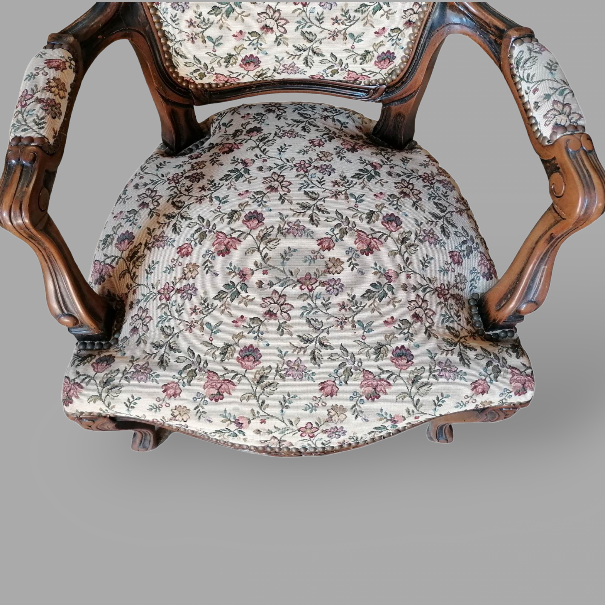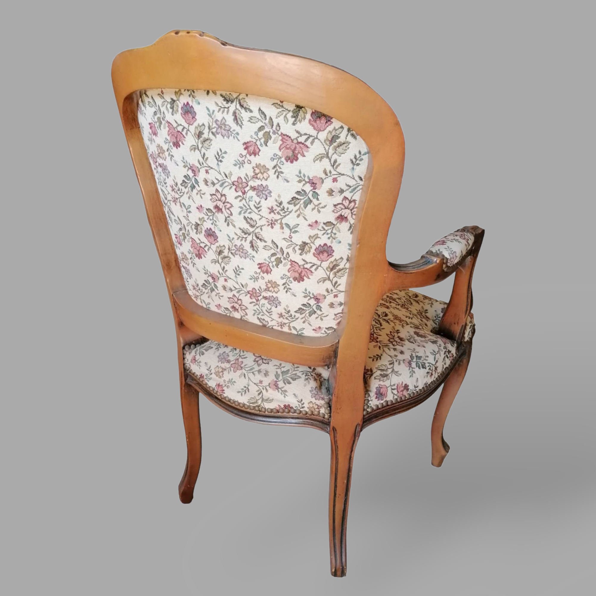 Eladó neobarokk virágos karos szék szép állapotban. Elől, hátul kárpitozott, provence jellegű anyaggal. Karfák is szép állapotban vannak.