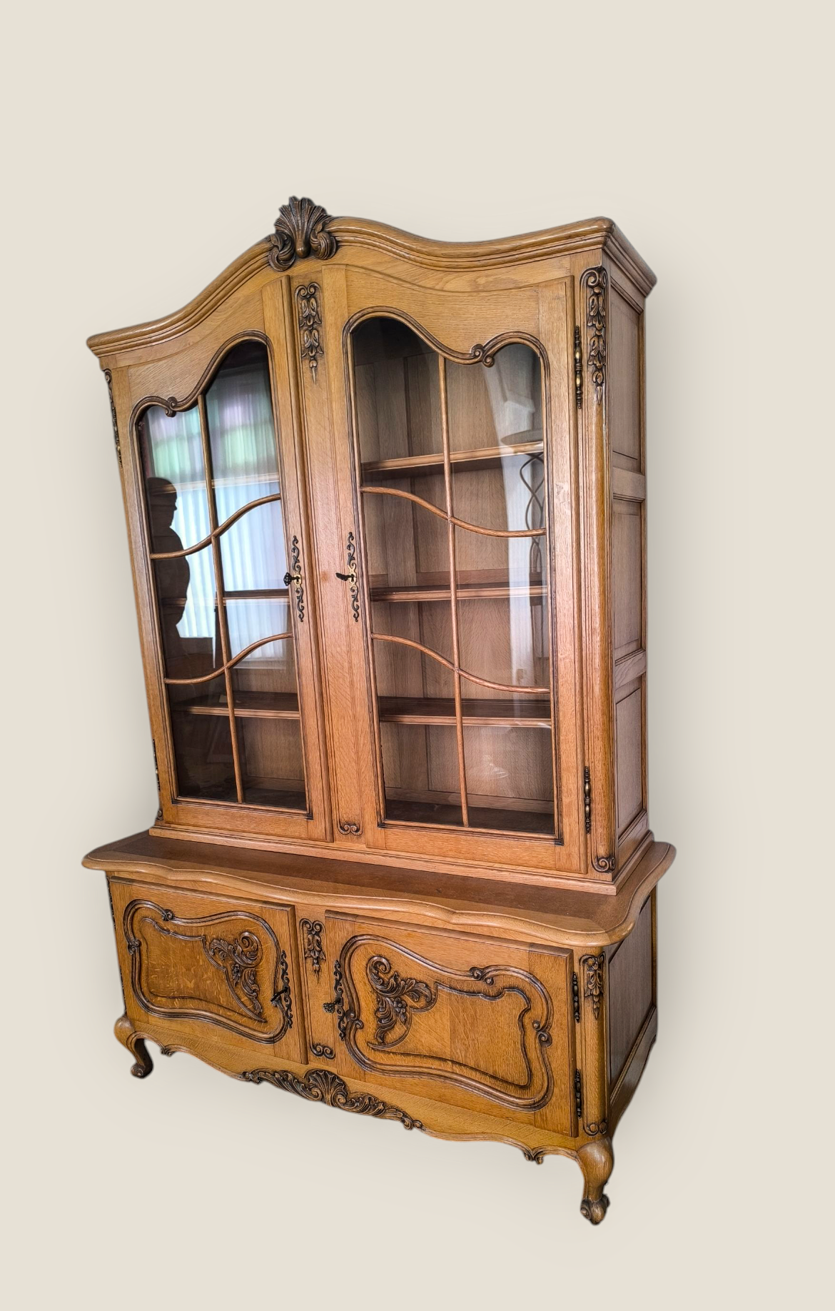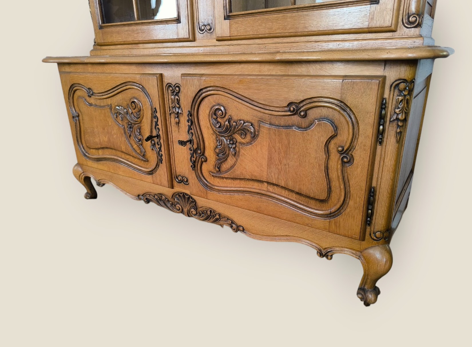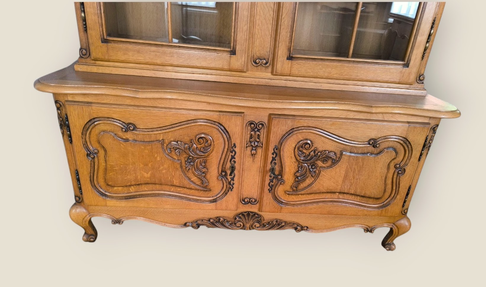 Eladó neobarokk vitrin szép állapotban. Alul 2 ajtós, díszes faragásokkal kecses lábakkal. Felül üveges vitrinnel. Igény esetén hozzá tartozó tálaló komódot vagy étkező garnitúrát is tudunk ajánlani.
