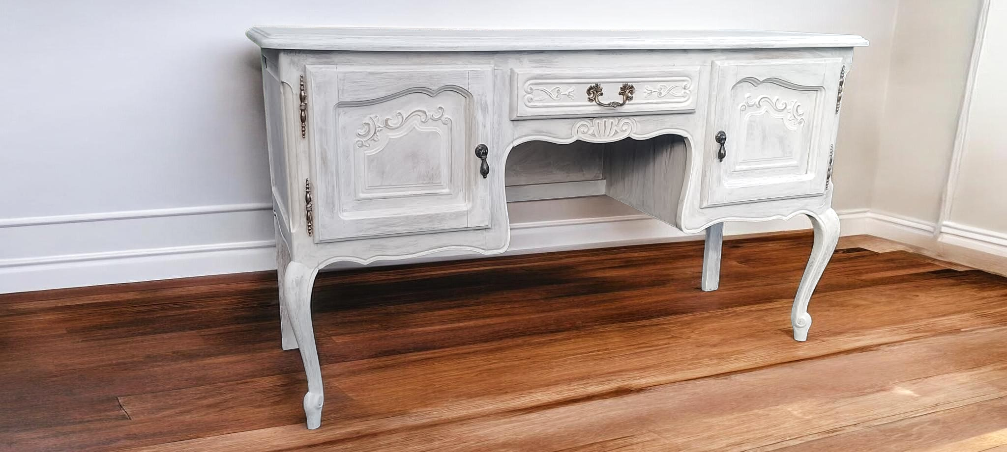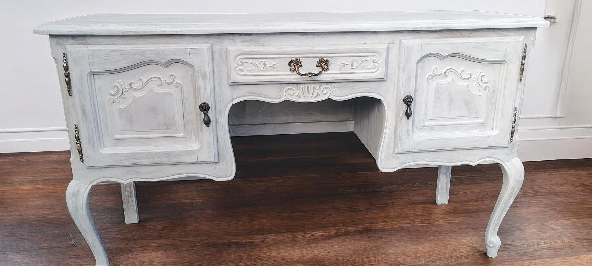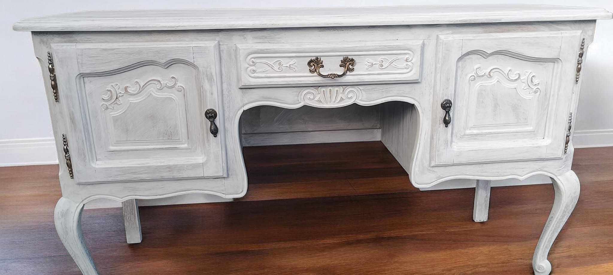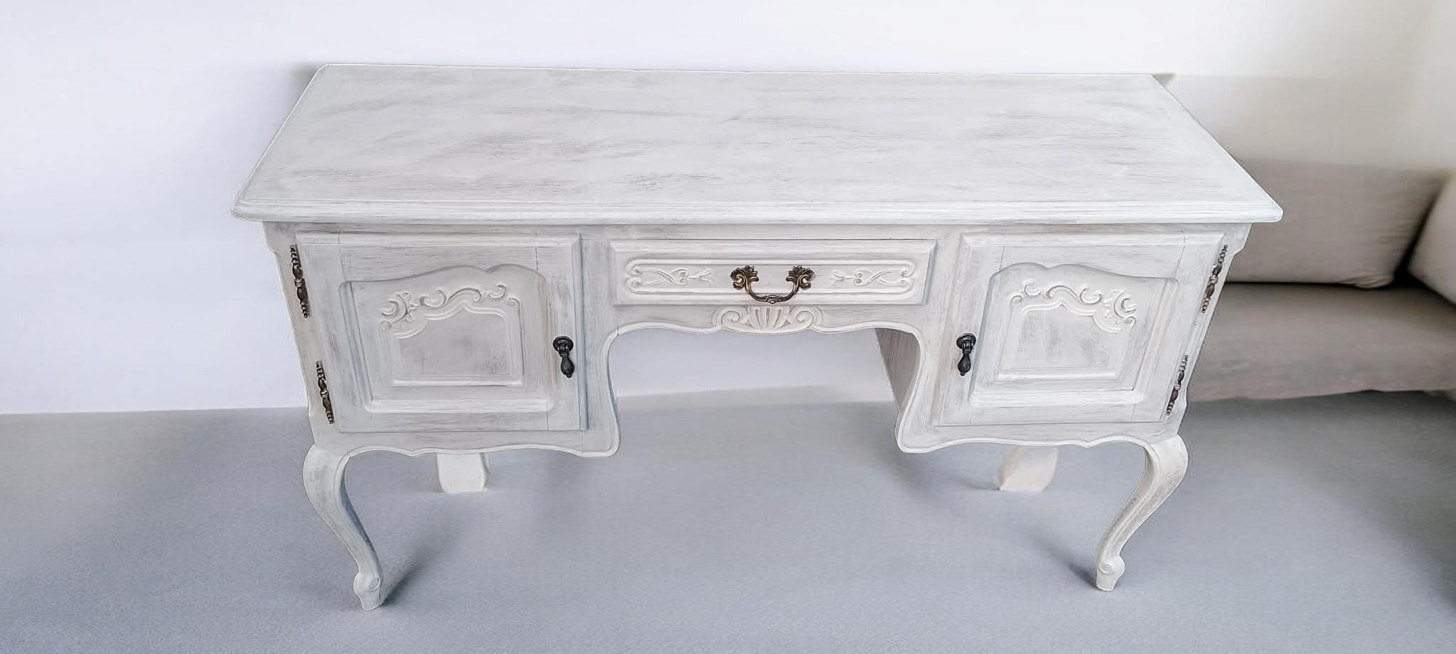 Eladásra kínálunk egy neobarokk provence stílusban felújított kis íróasztalt,fésülködő vagy tv alá helyezhető hosszú komódot.