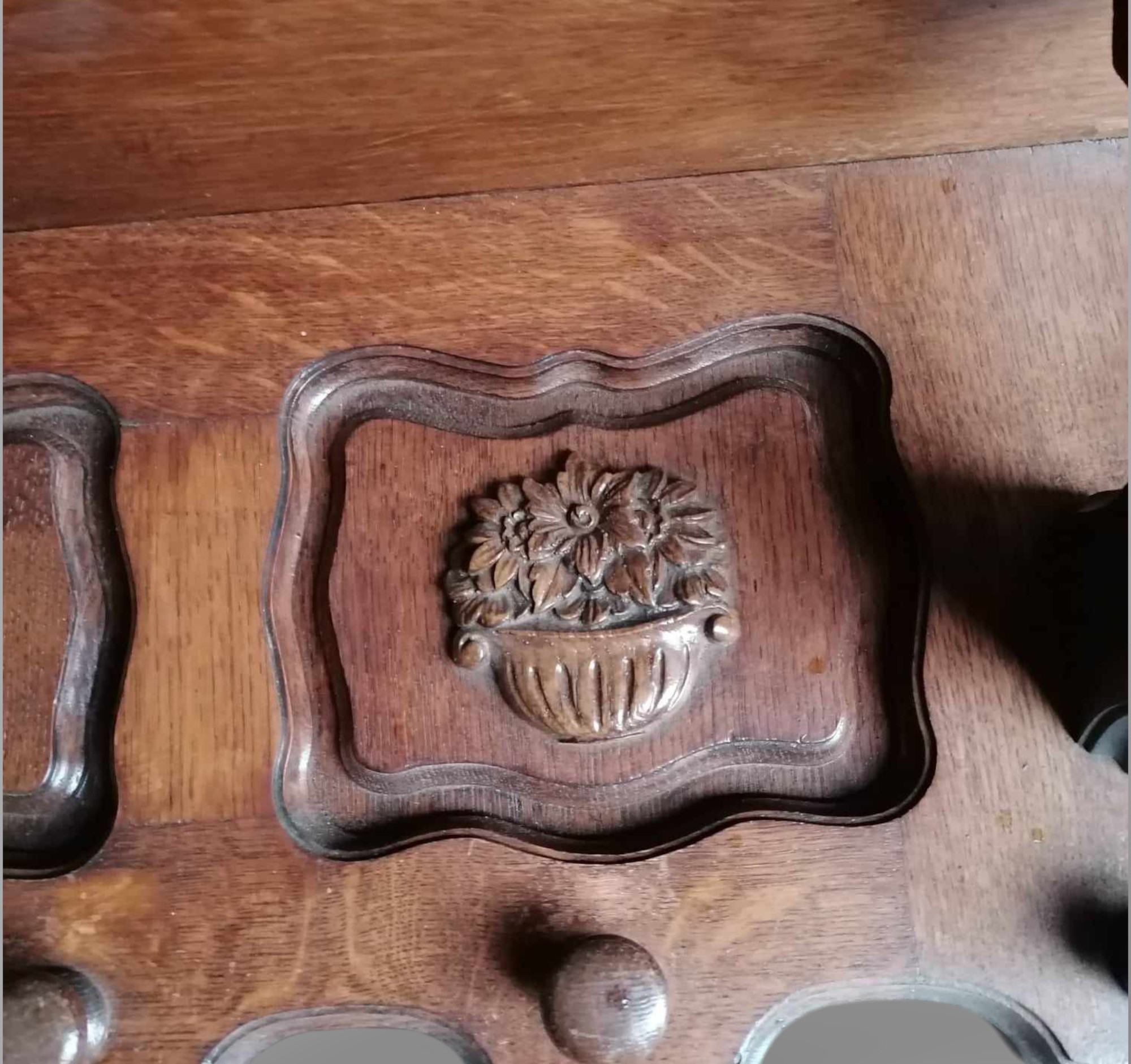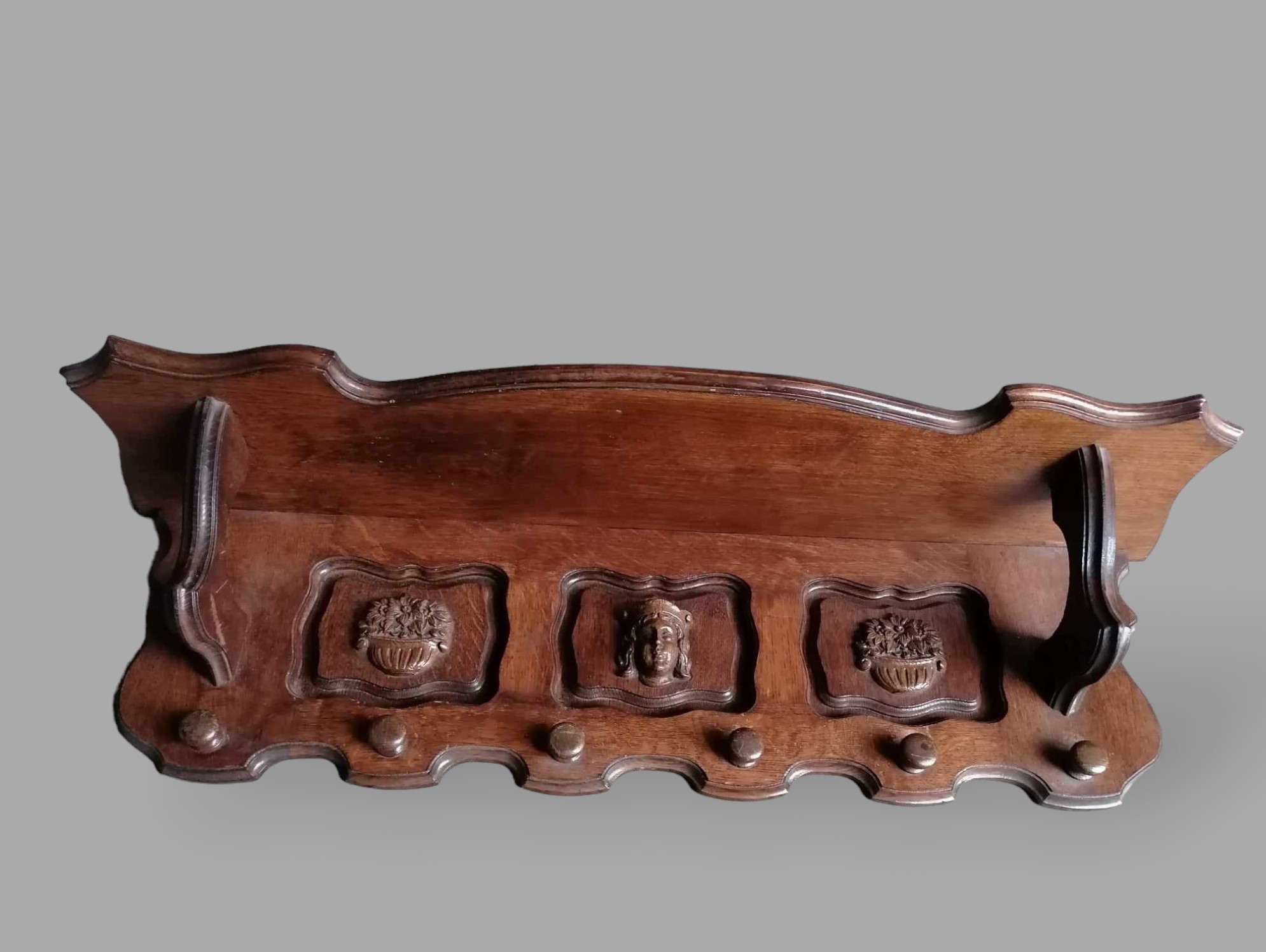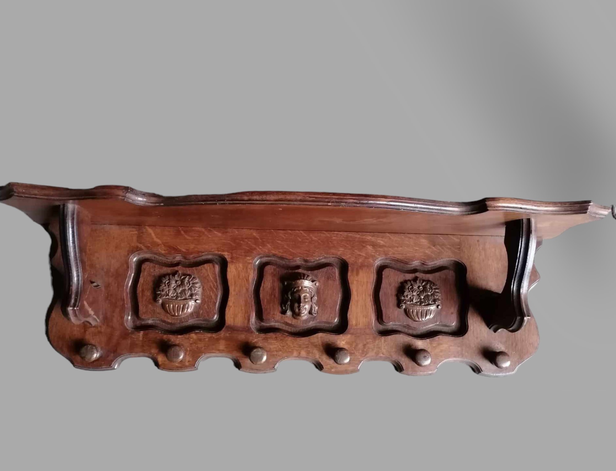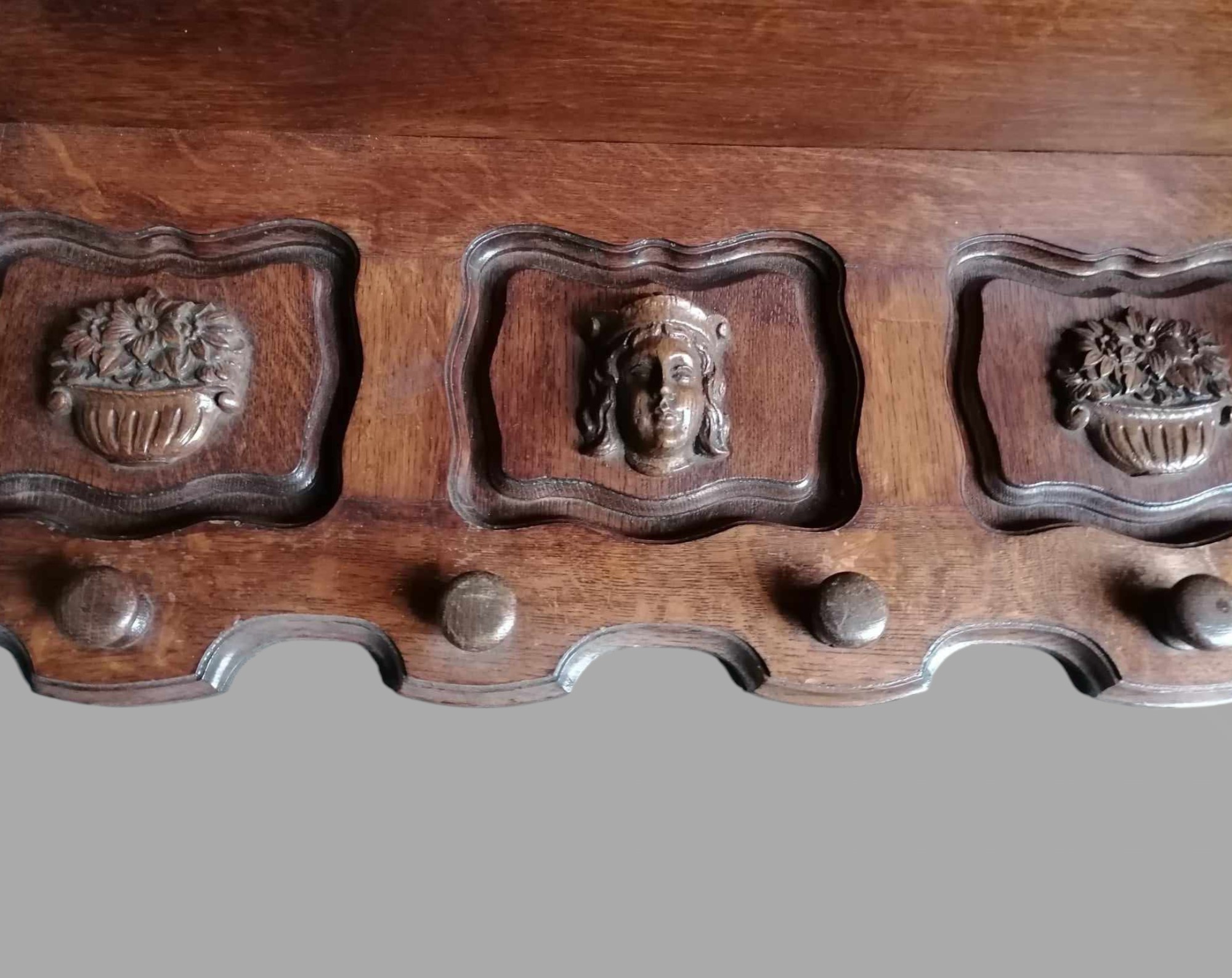Eladó neoreneszánsz fogas szép állapotban. Teljes egészében fából készült, három díszes betéttel, középen élethű ember fej faragással. Hat darab akasztási lehetőséggel, felül kalaptartóval. Teljes hossza 100 cm.