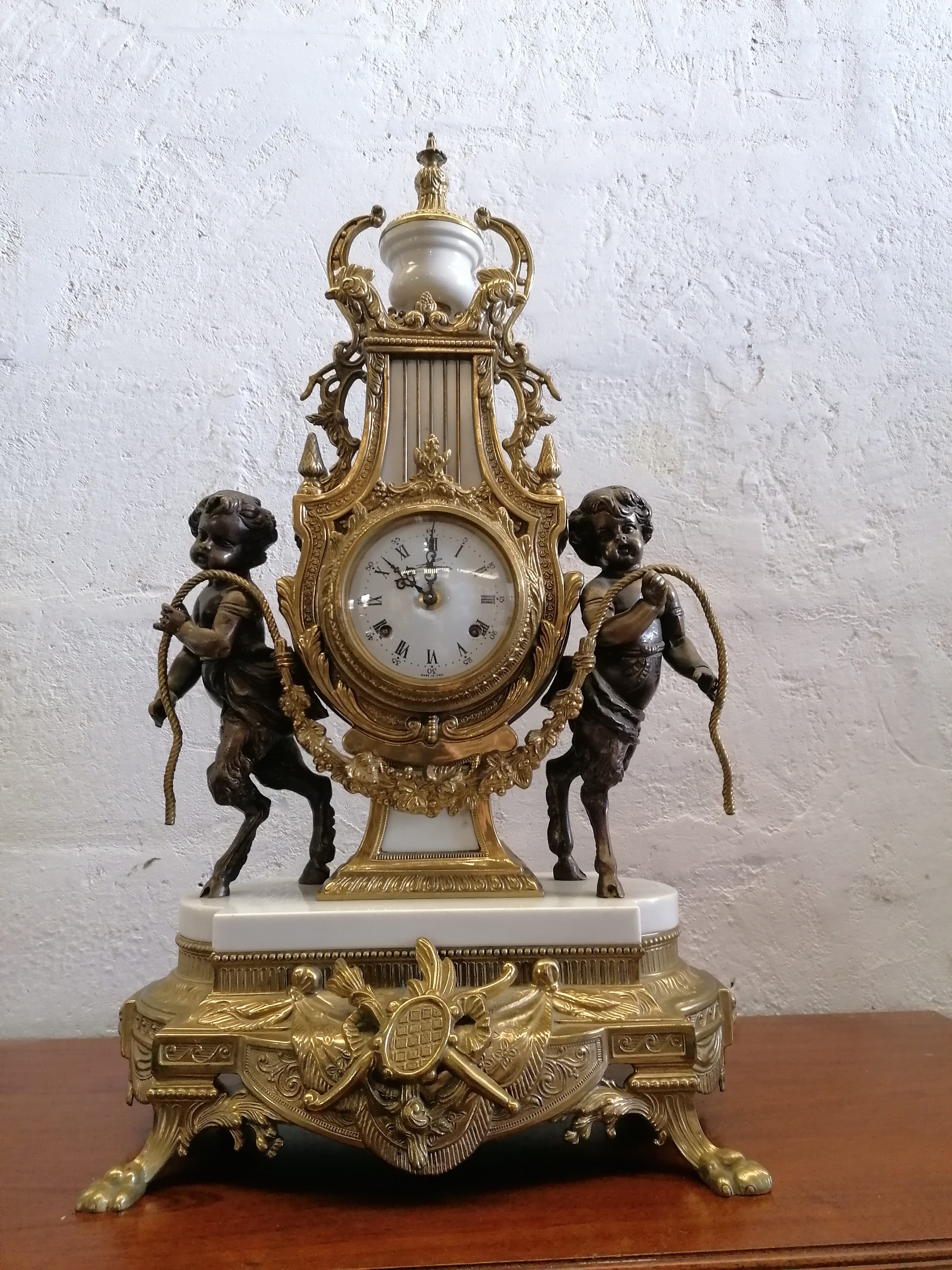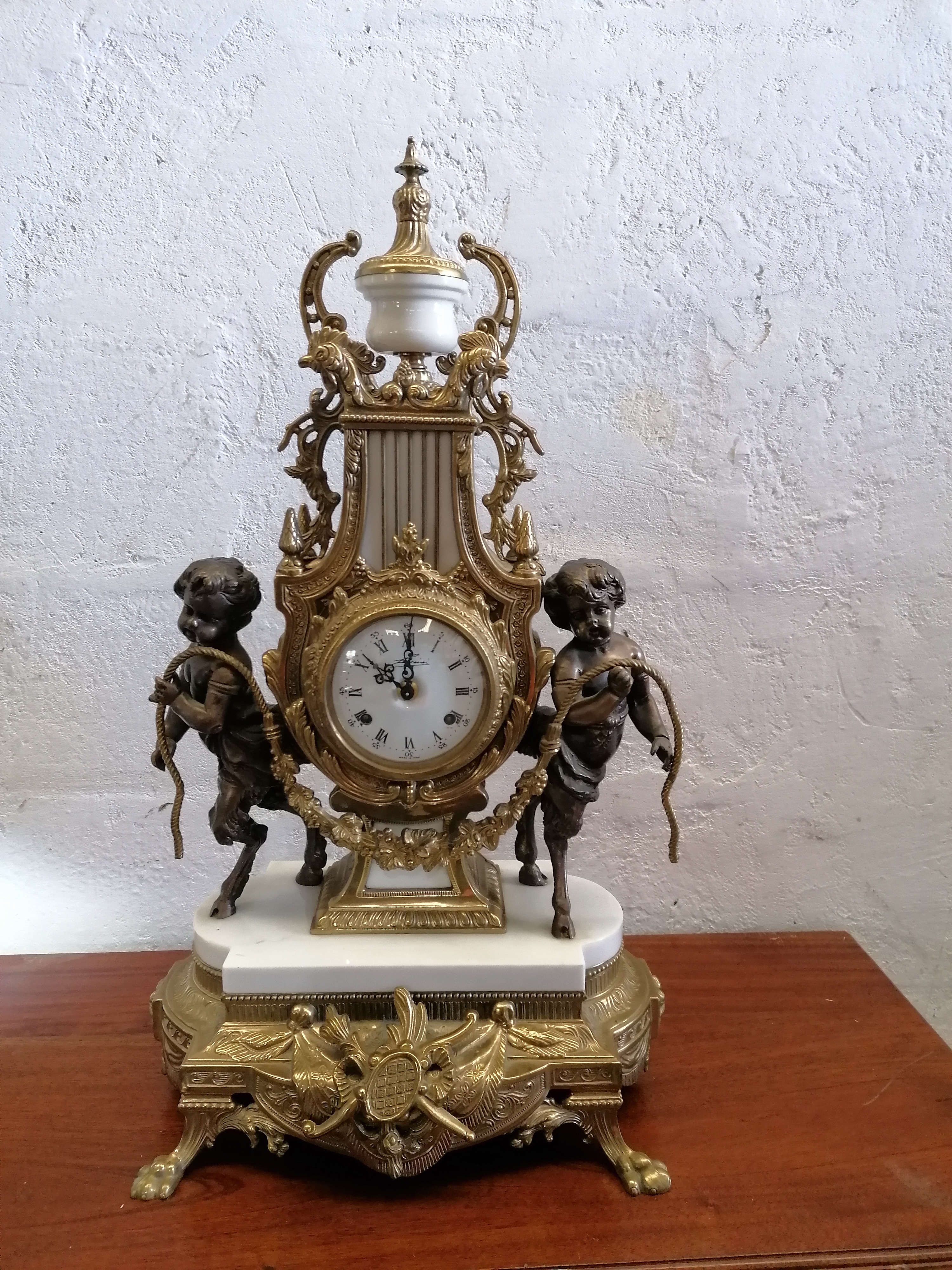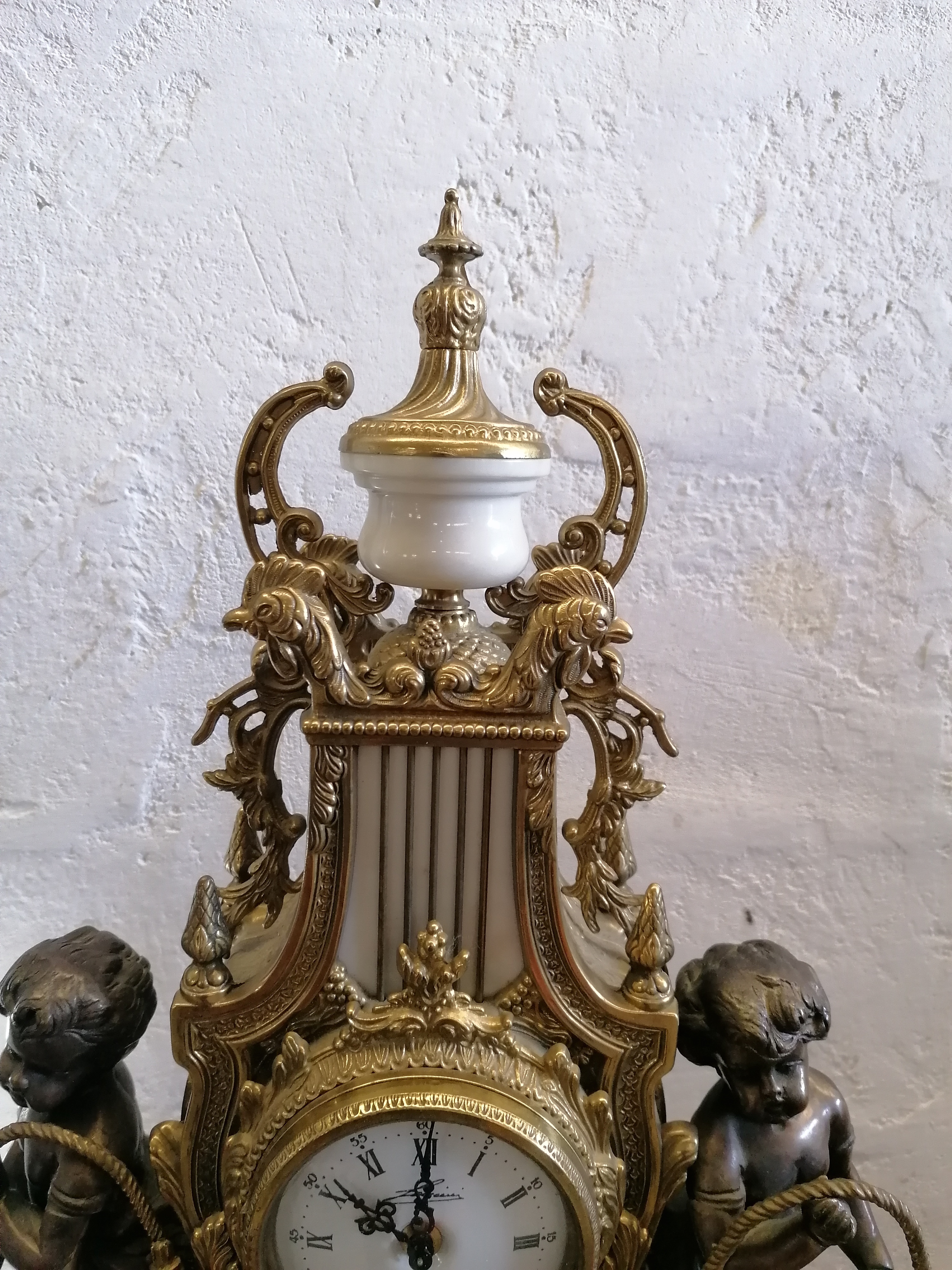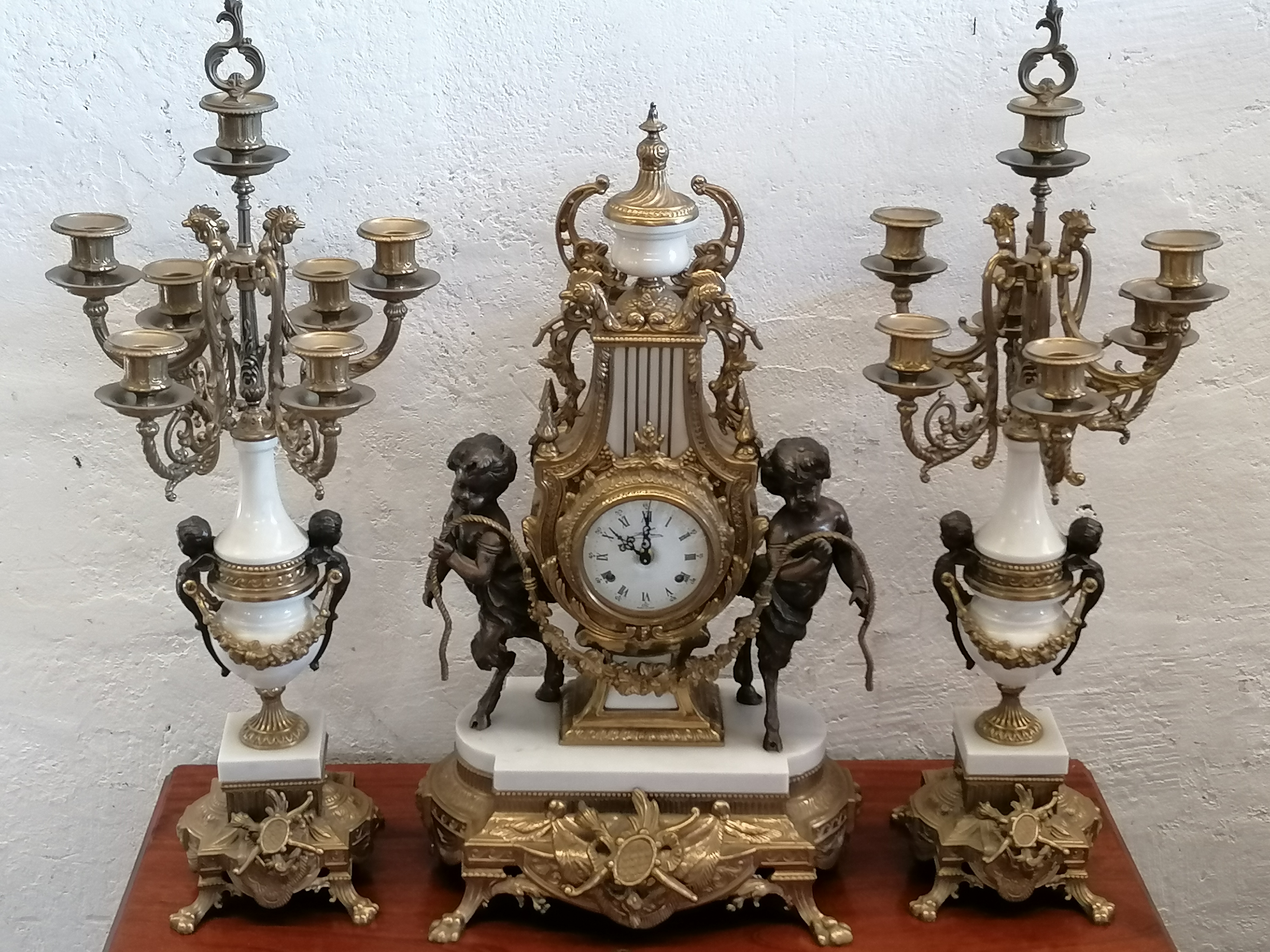 Eladó puttós kandalló óra gyönyörű állapotban. Ritka, tömör rézből készült darab, amit fehér márvány díszít mindenhol. Az óra két oldalán nagy méretű puttók jelennek meg patás lábakon, a gyertyatartók díszesek minden részükön. Egyedi szett, szervizelt állapotban, hozzá való órakulccsal.