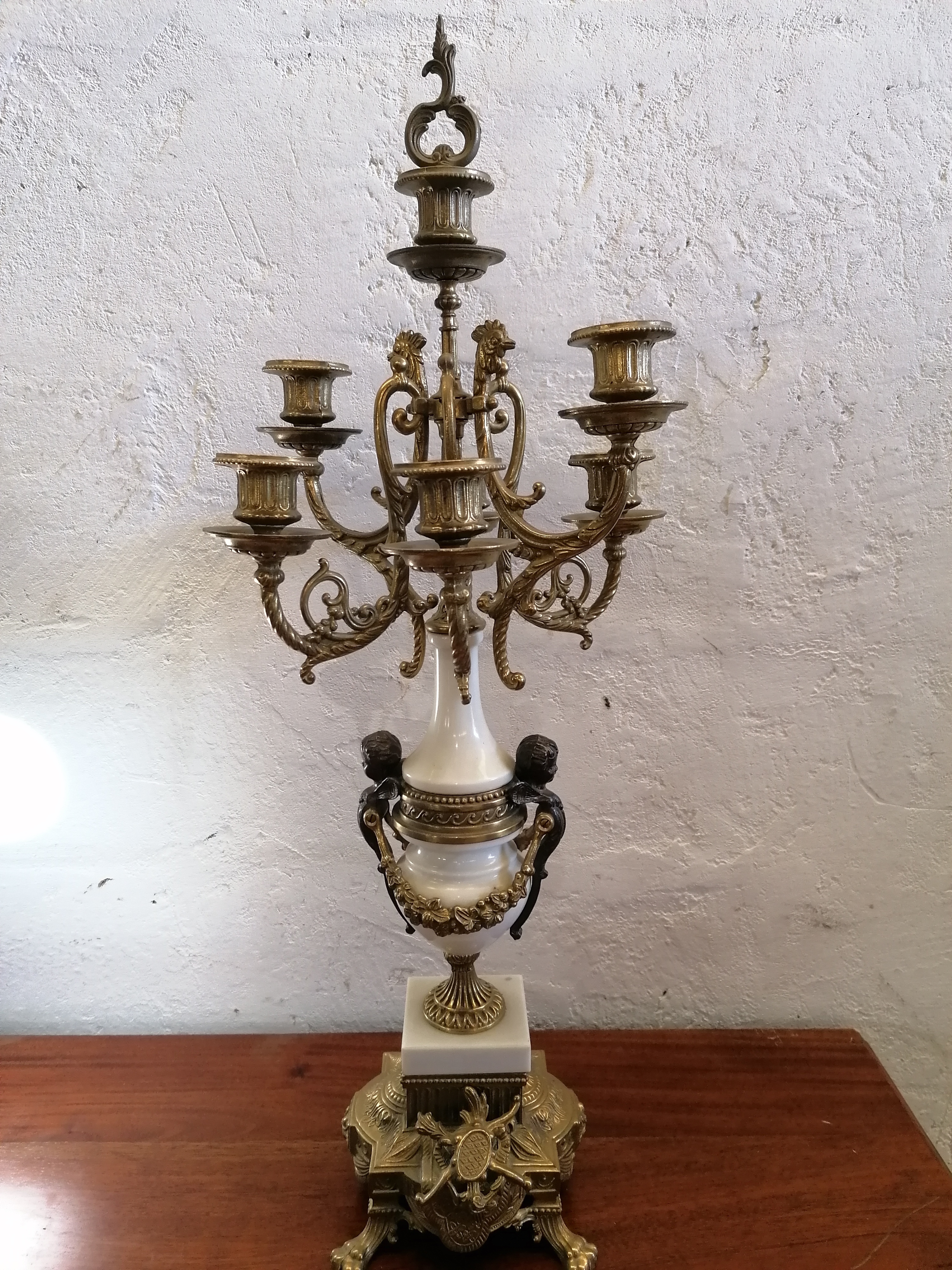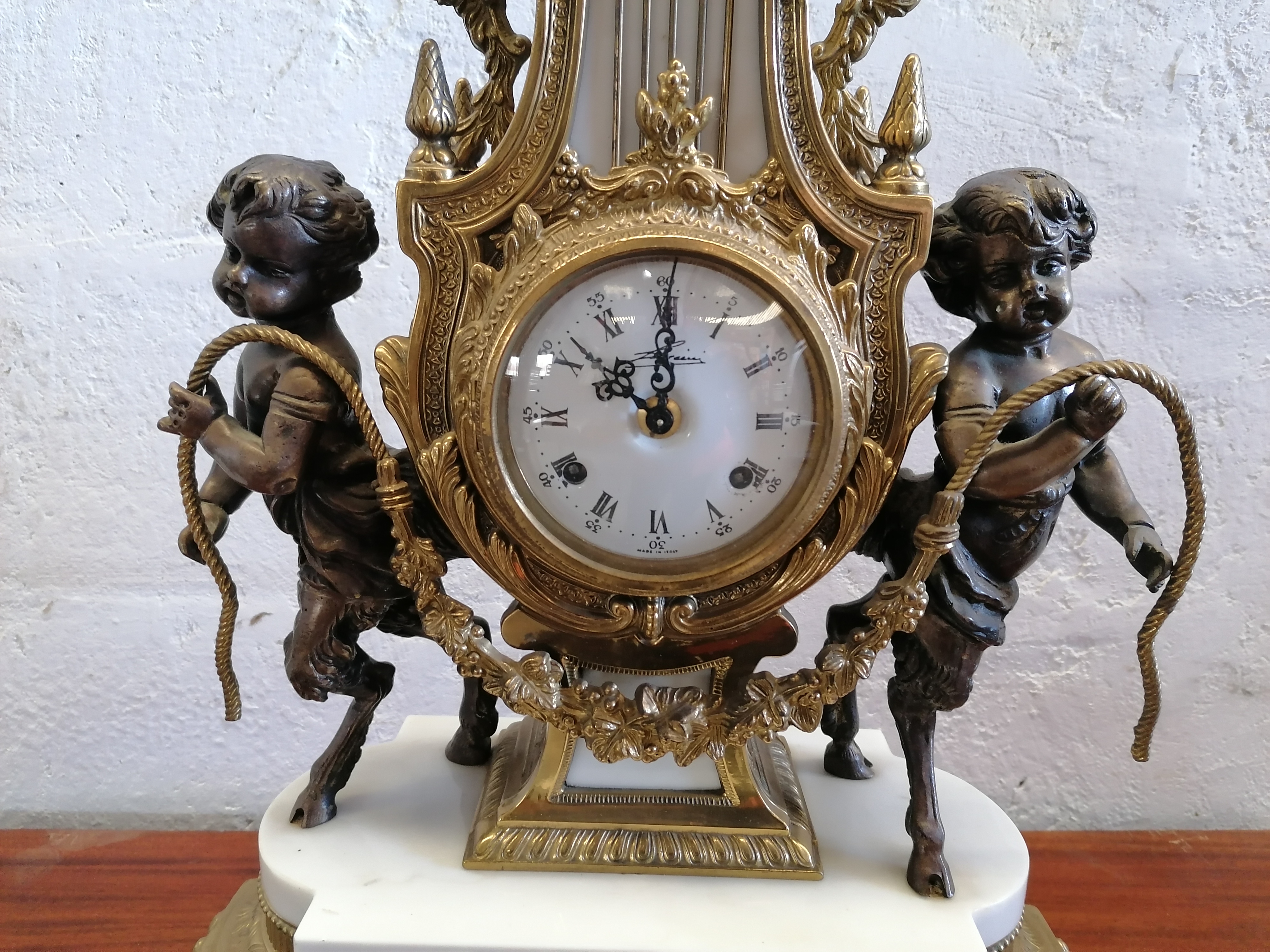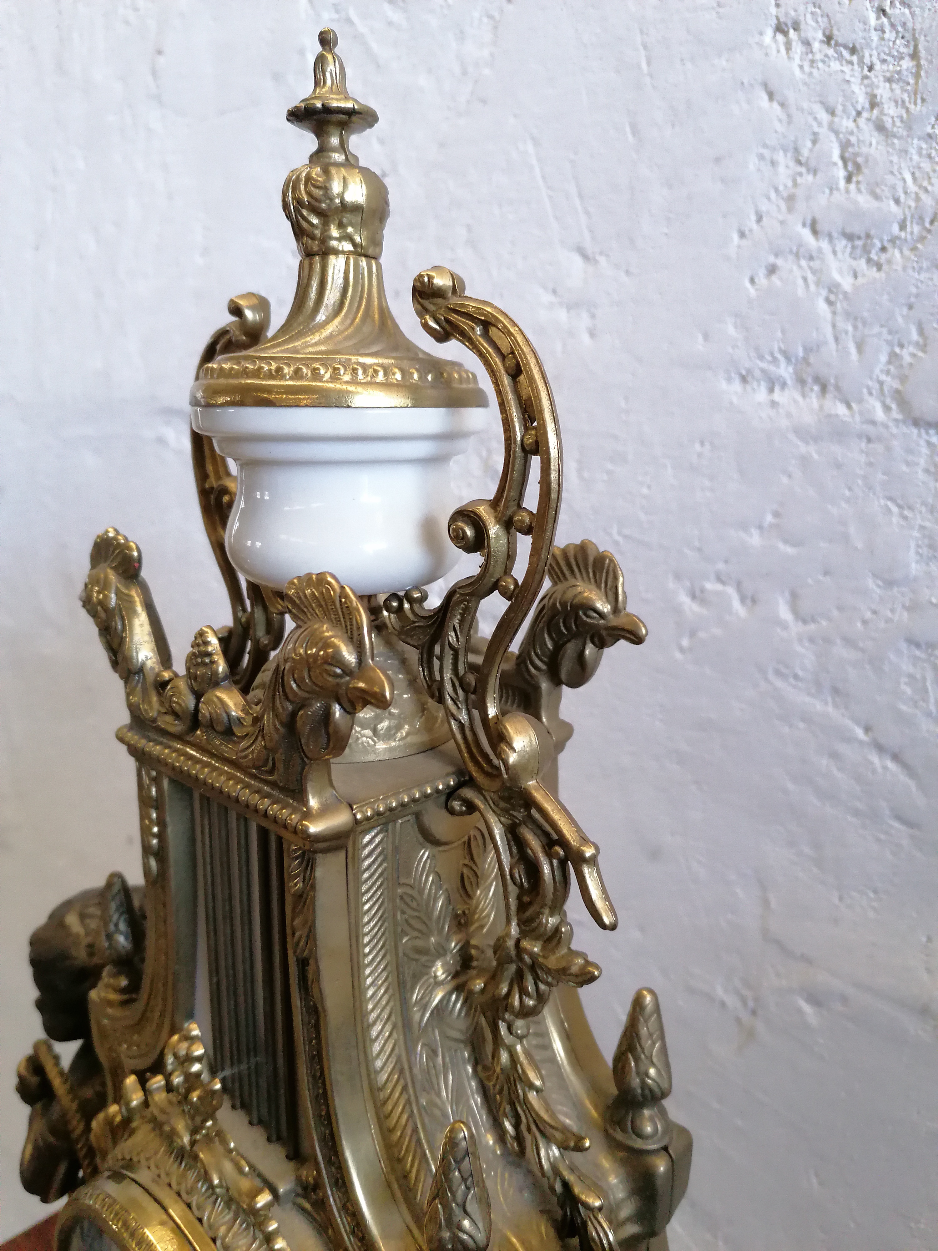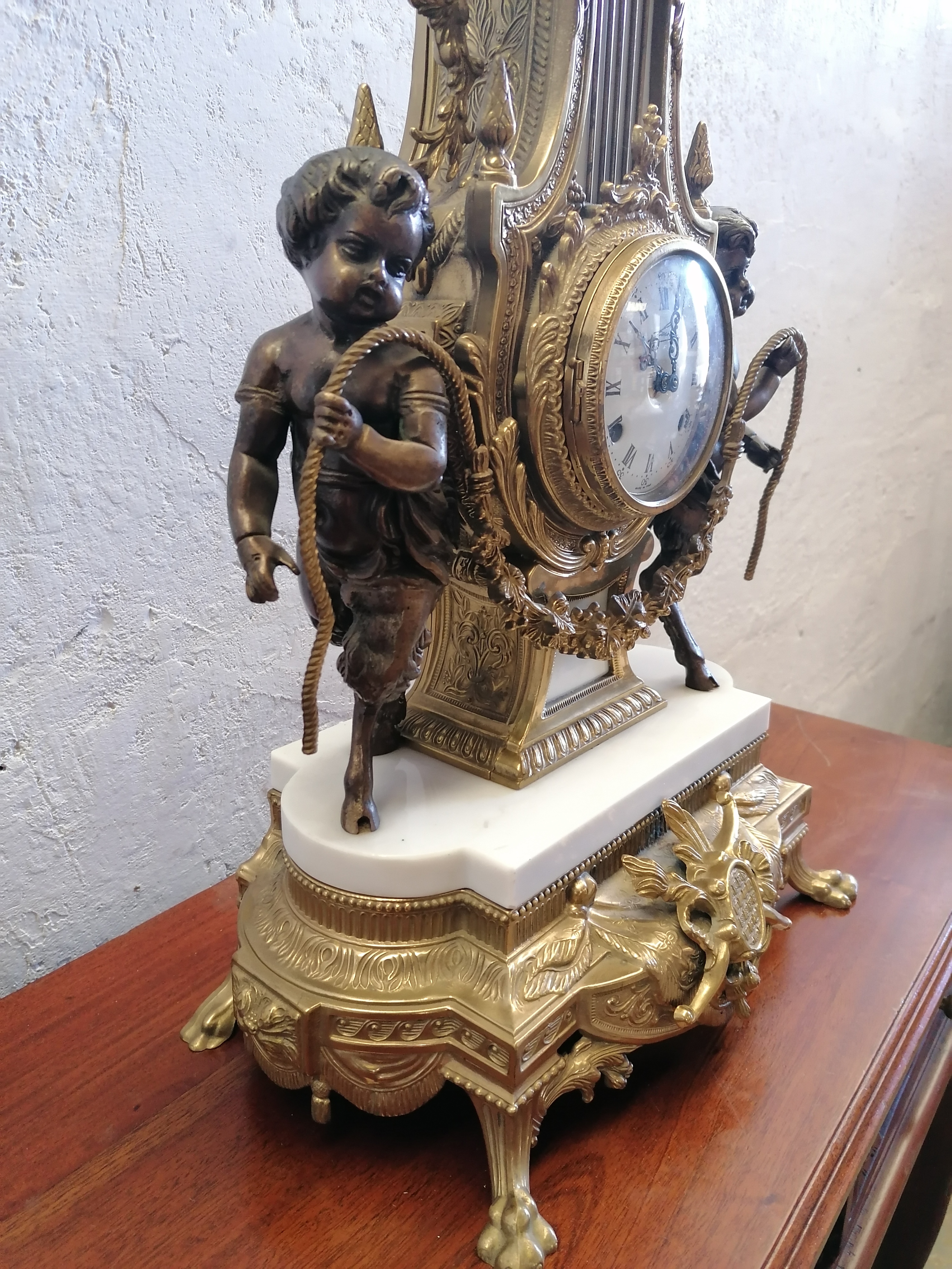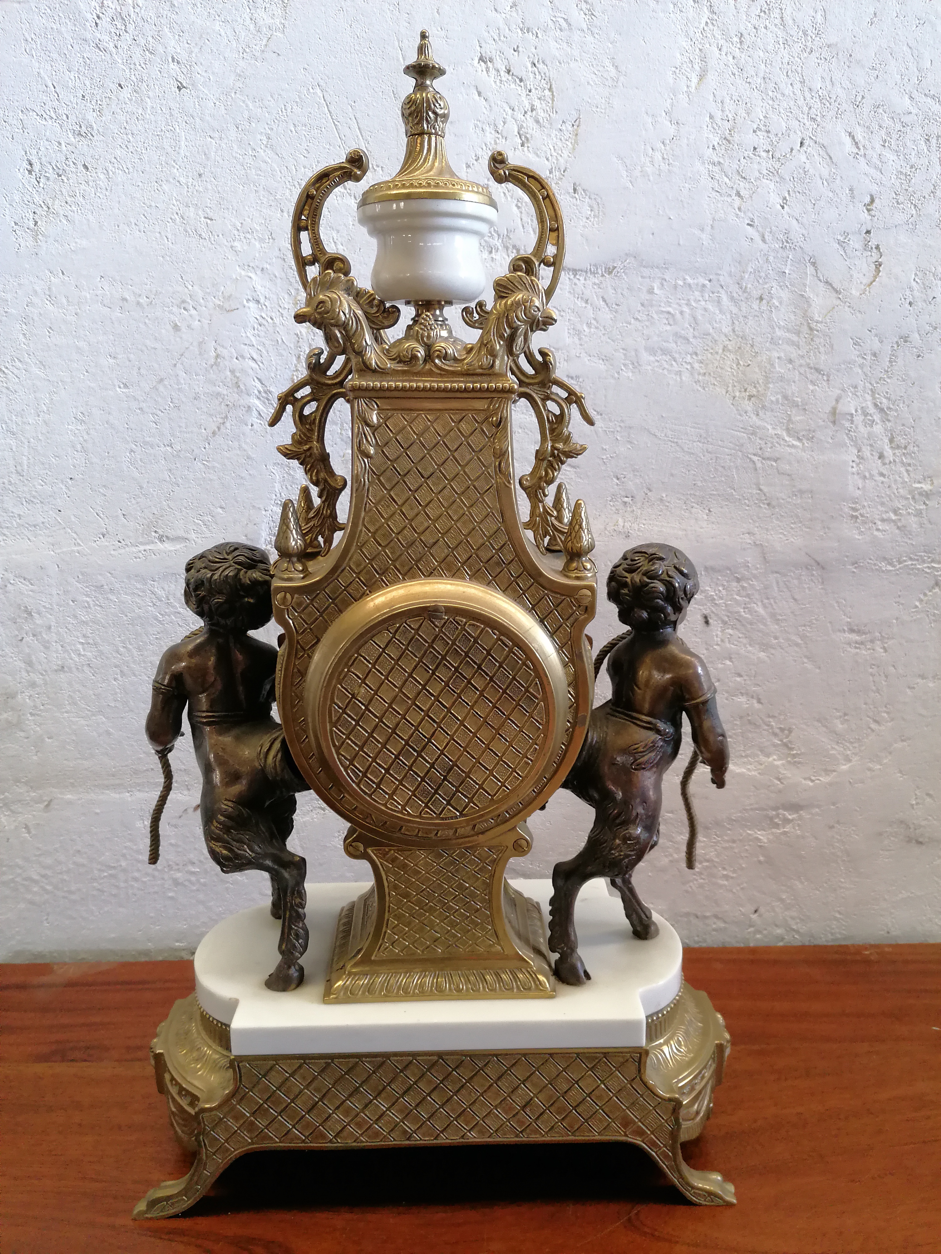 Eladó puttós kandalló óra gyönyörű állapotban. Ritka, tömör rézből készült darab, amit fehér márvány díszít mindenhol. Az óra két oldalán nagy méretű puttók jelennek meg patás lábakon, a gyertyatartók díszesek minden részükön. Egyedi szett, szervizelt állapotban, hozzá való órakulccsal.