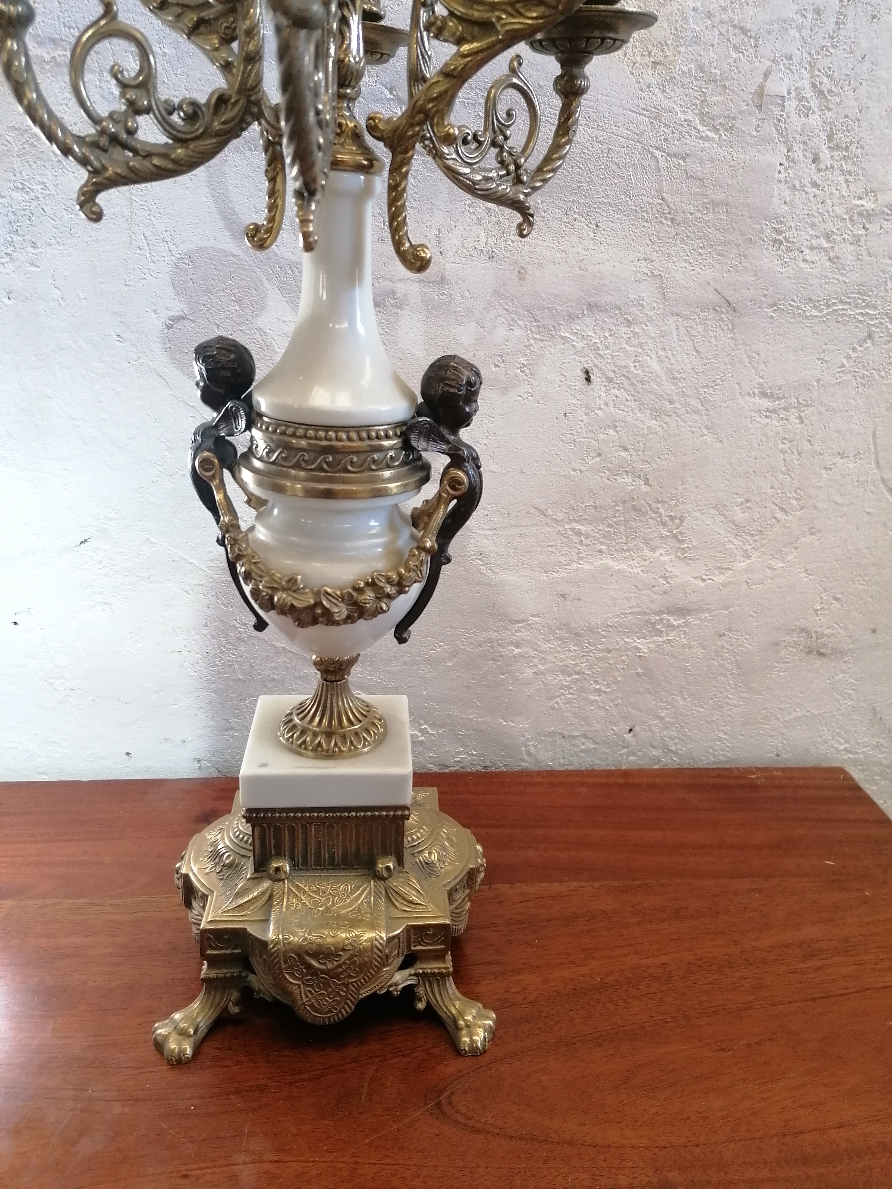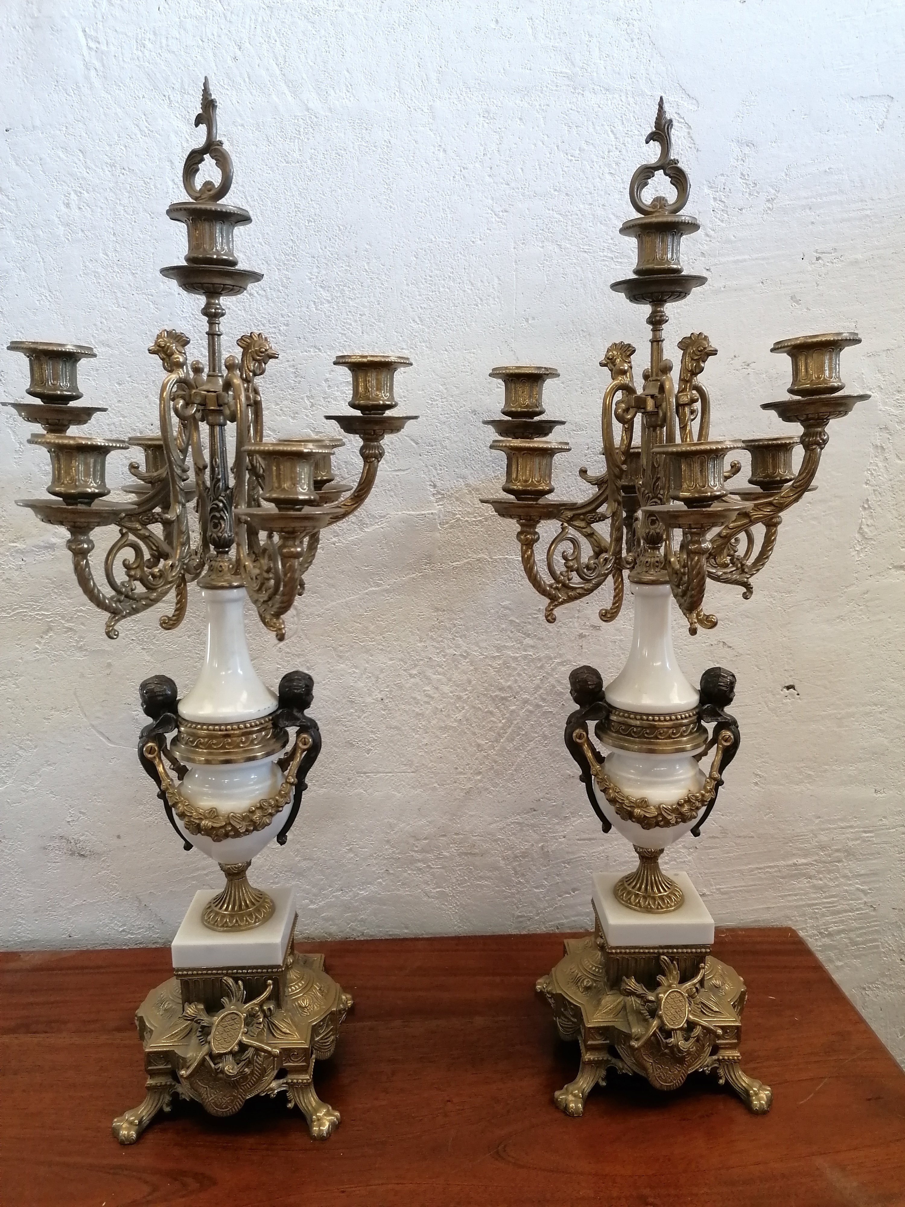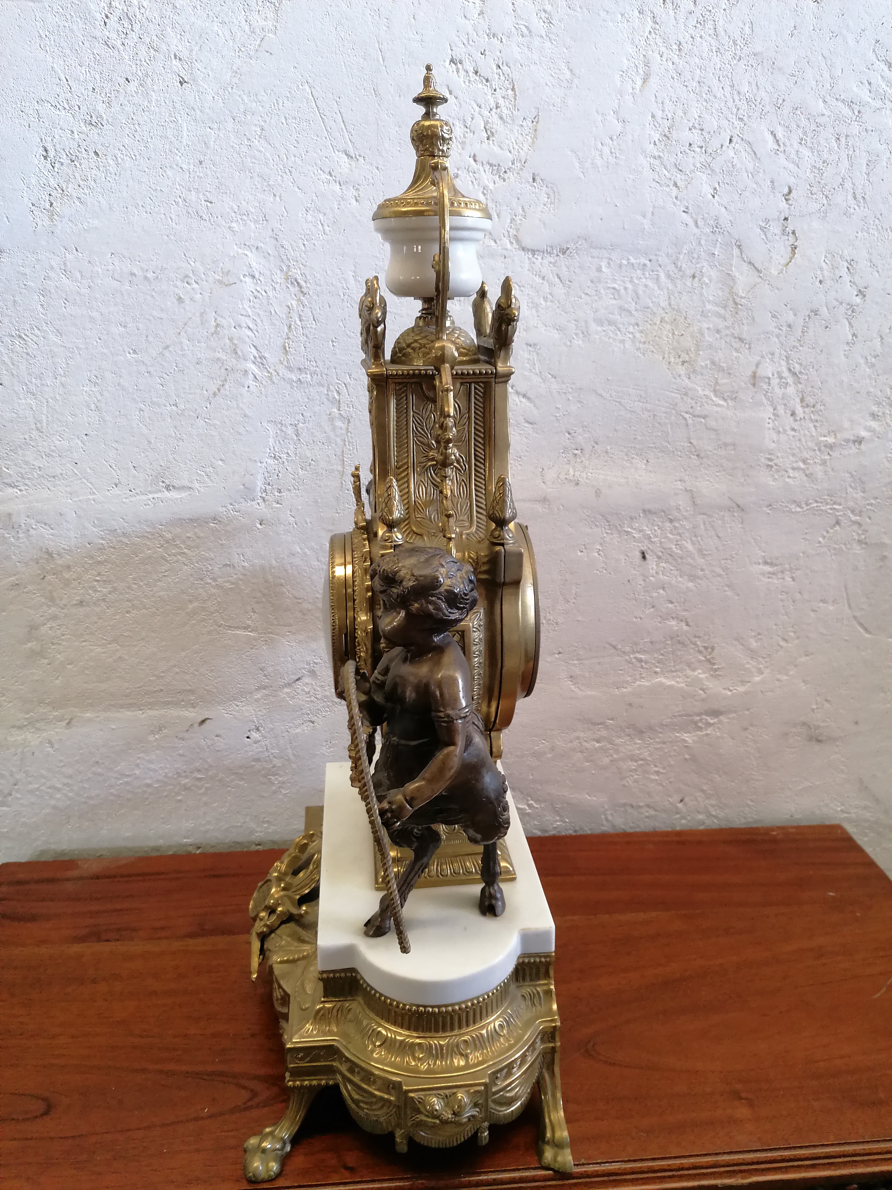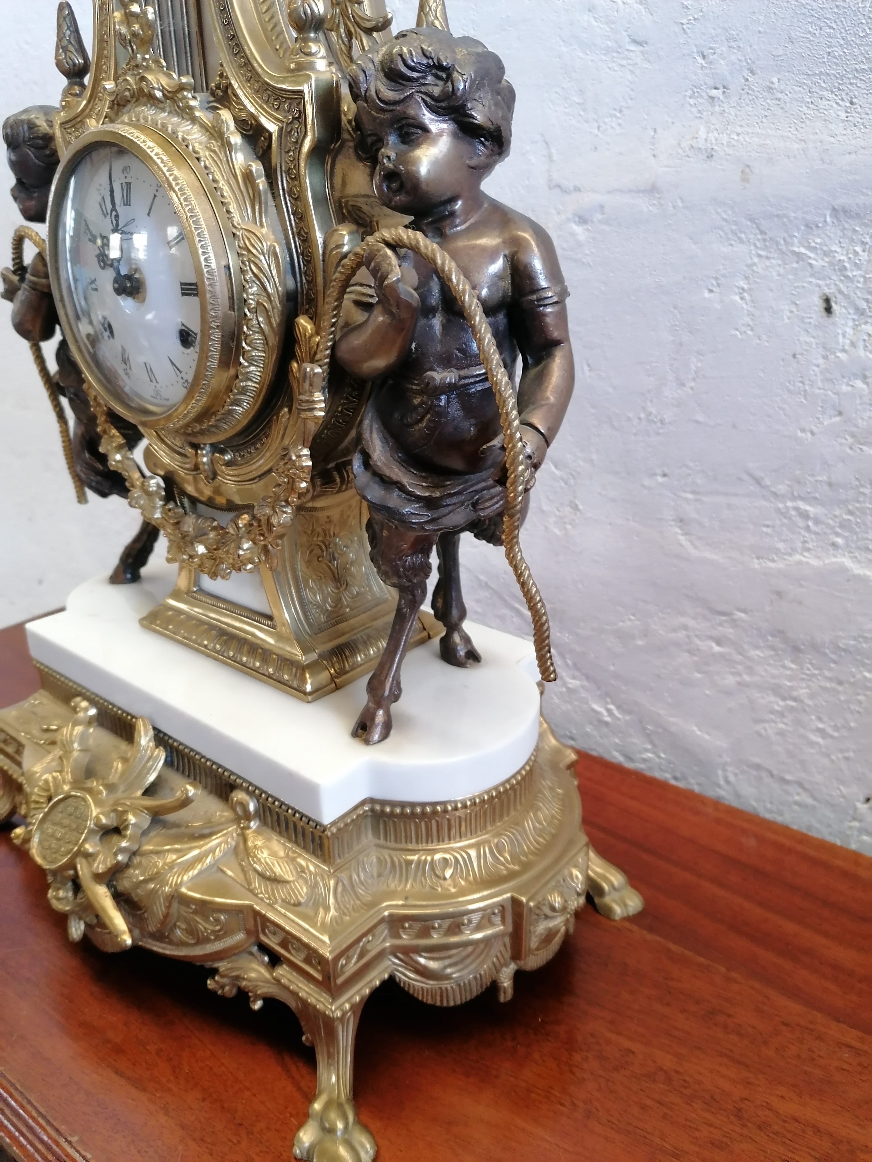 Eladó puttós kandalló óra gyönyörű állapotban. Ritka, tömör rézből készült darab, amit fehér márvány díszít mindenhol. Az óra két oldalán nagy méretű puttók jelennek meg patás lábakon, a gyertyatartók díszesek minden részükön. Egyedi szett, szervizelt állapotban, hozzá való órakulccsal.