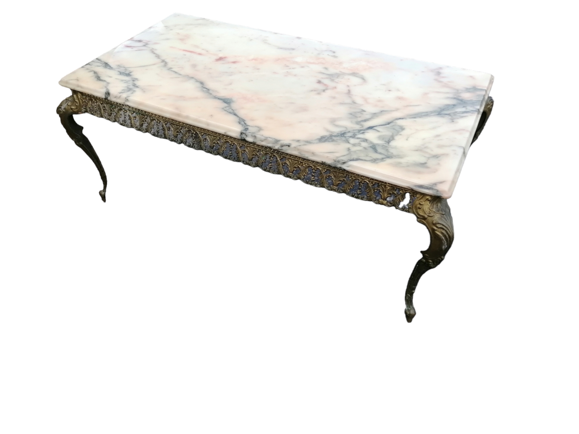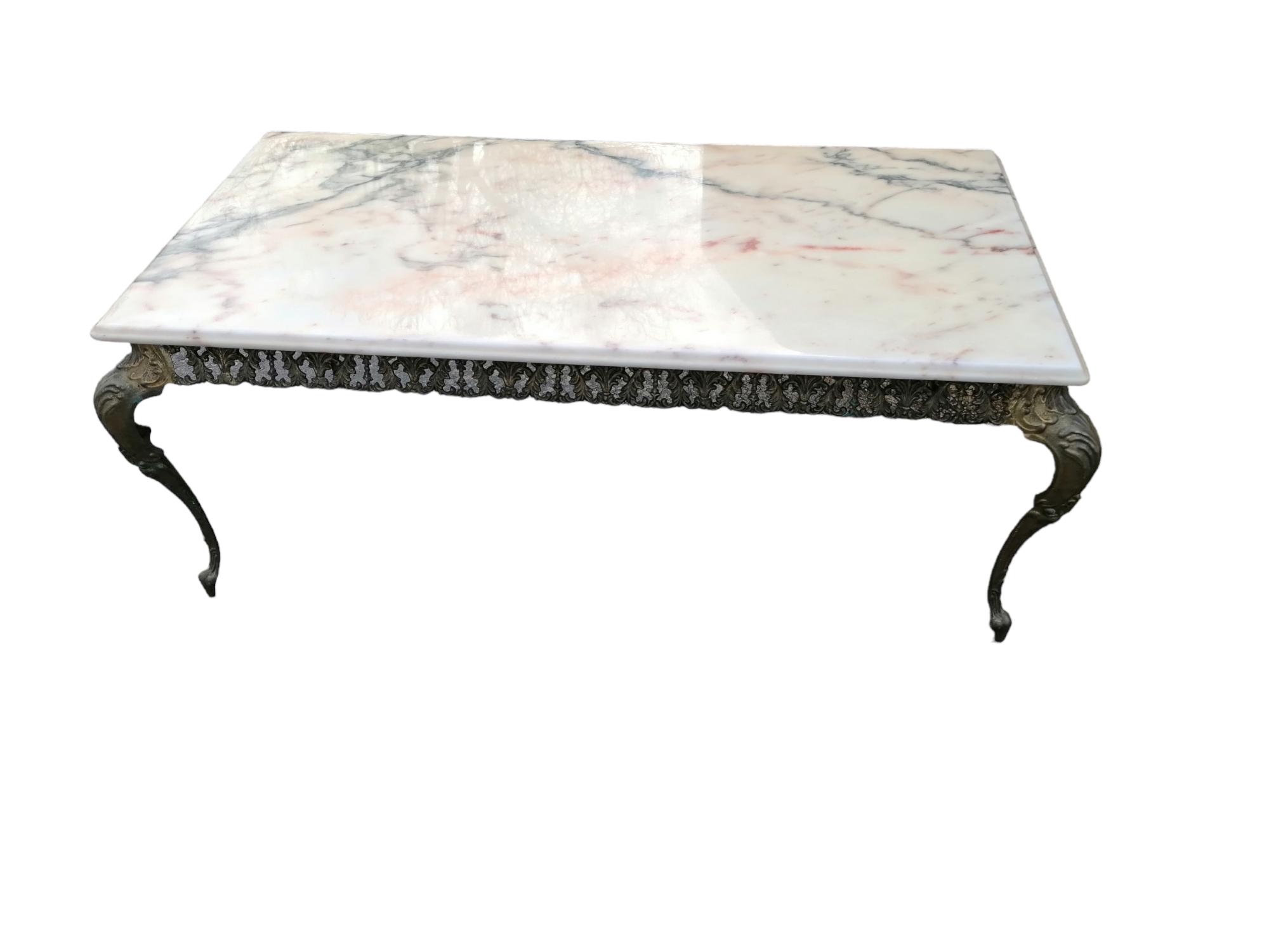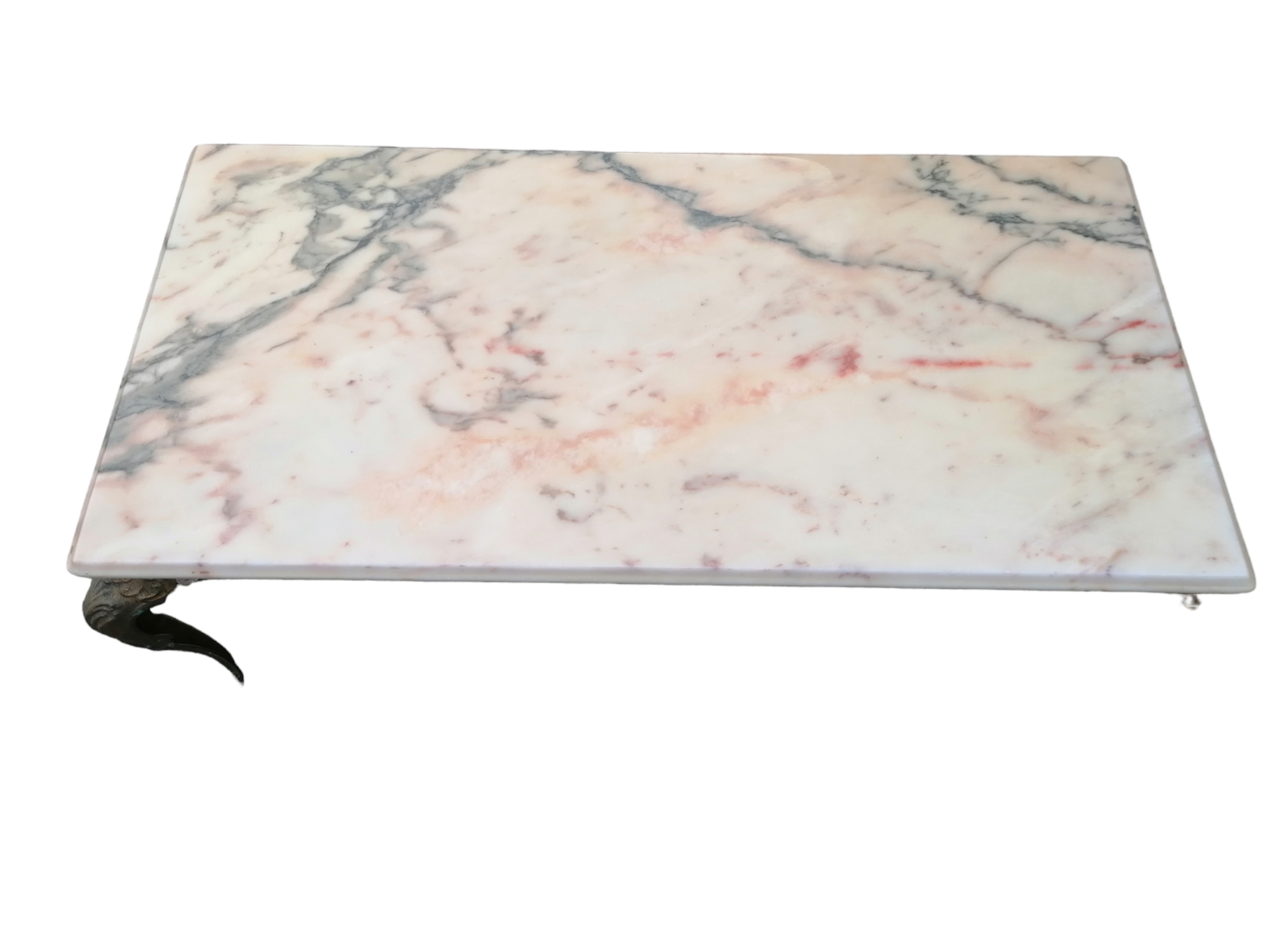 Eladó réz dohányzóasztal márványlap fedéssel. Szerkezete teljes egészében rézből készült, kecses ívelt lábakkal, díszes szoknyával. Márványlap épp és sértetlen mindenhol.