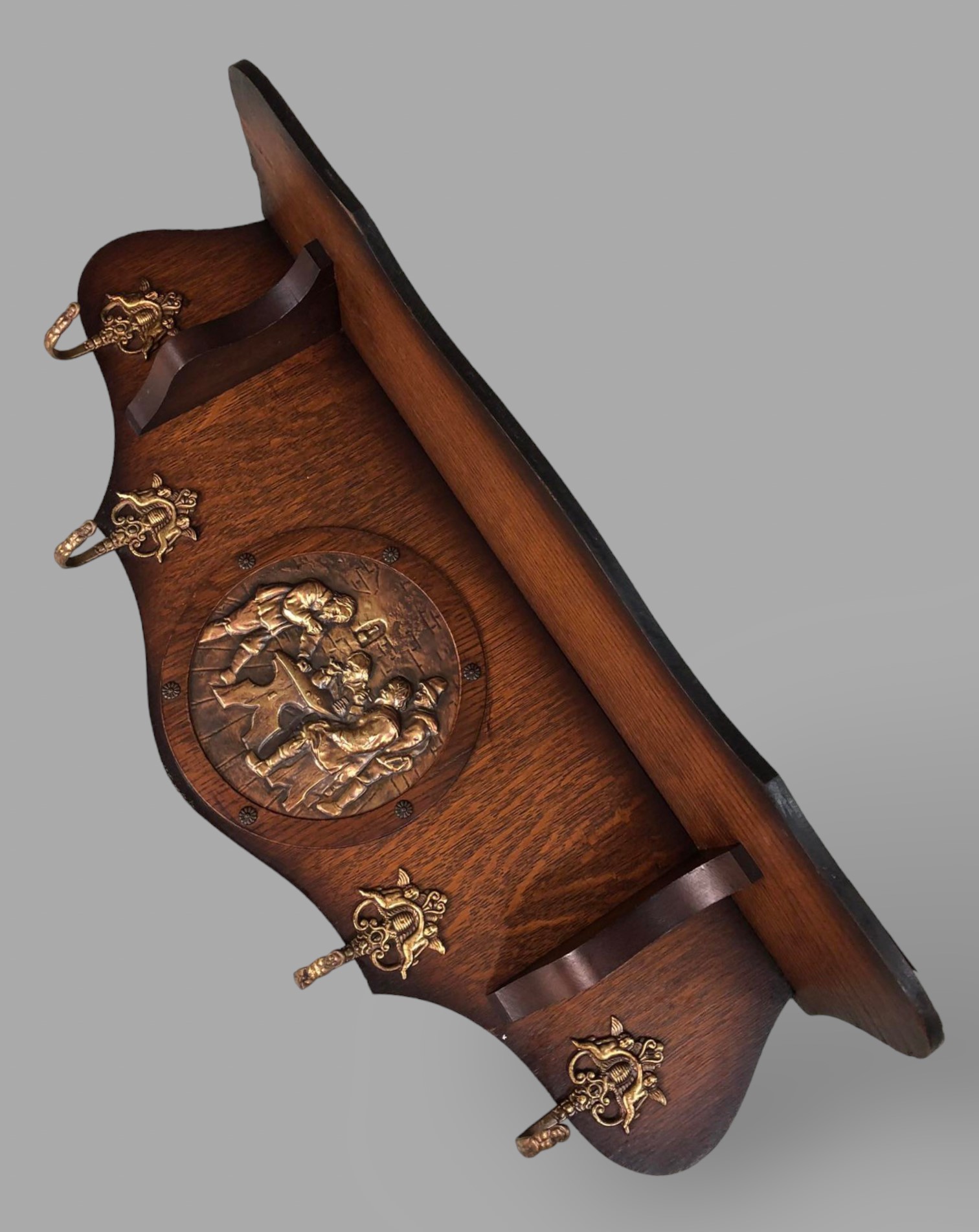 Eladó fali akasztó, fogas szép állapotban. Minden oldala ívelt, kecses, középen jelenetes fém betéttel. Négy darab díszes fém akasztóval, teljes hosszúsága 70 cm.