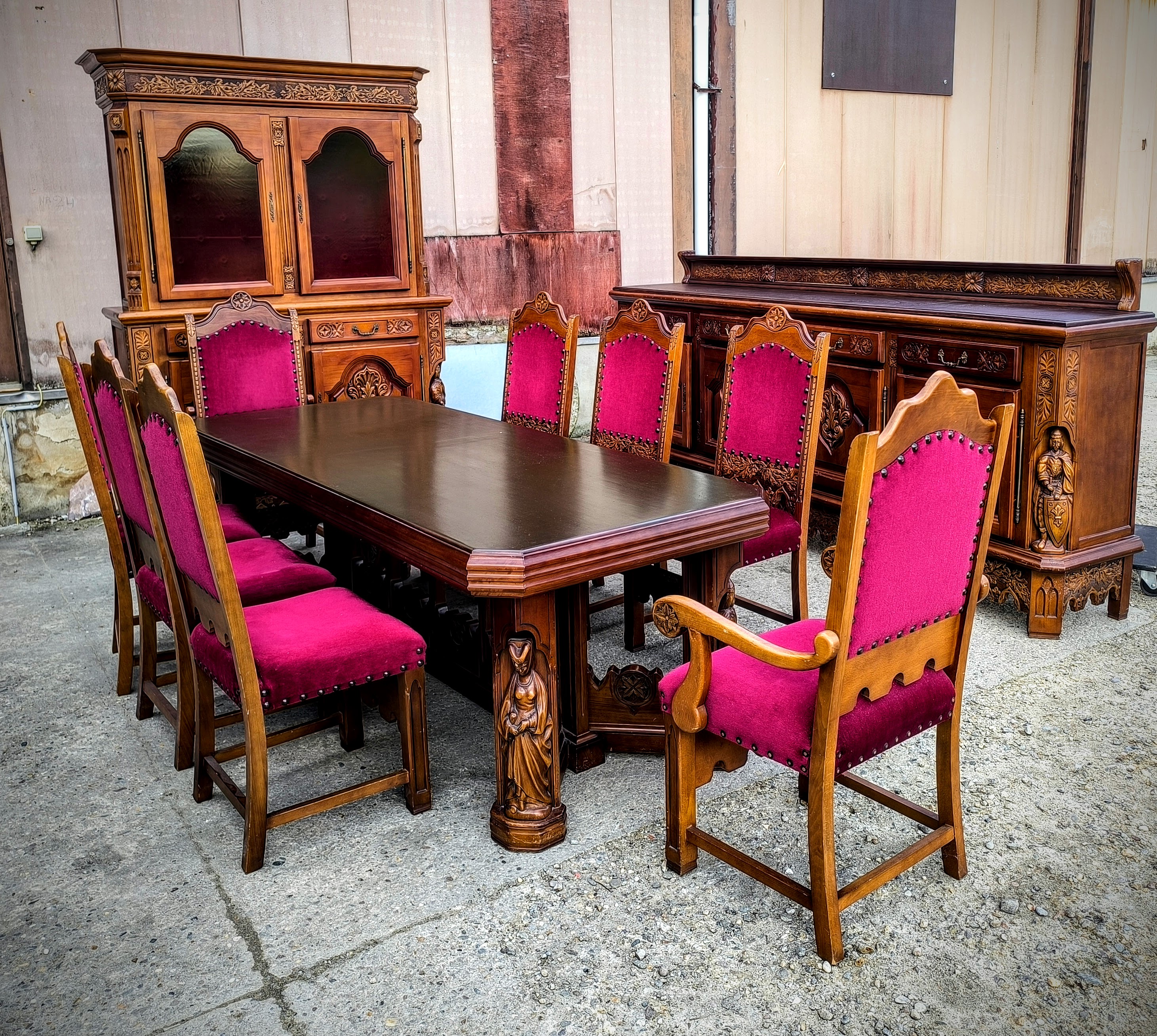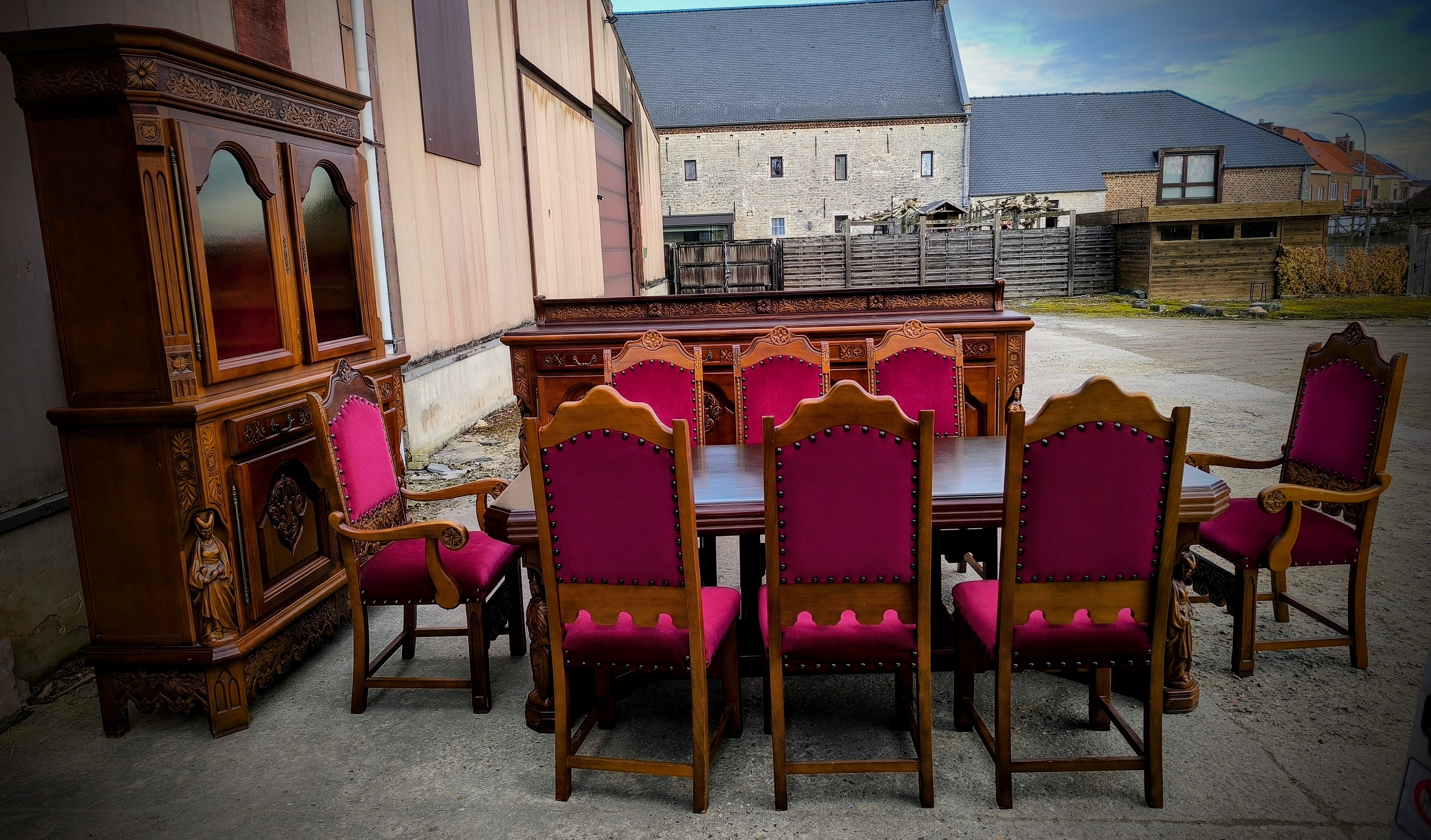 Hosszú tálaló,vitrin ,asztal + 6 db normál szék + 2 db karosszék összeállítású.