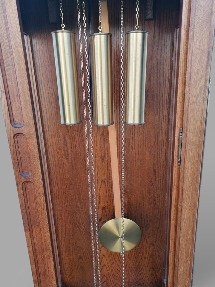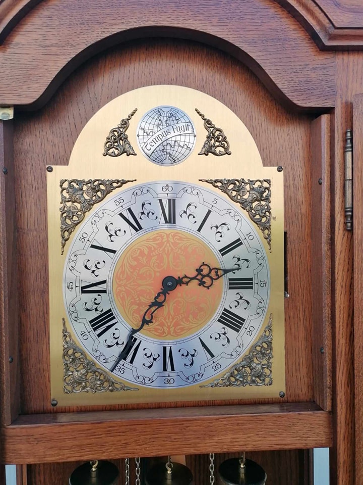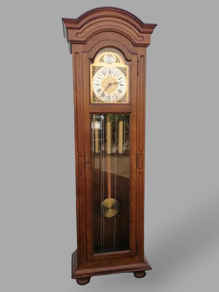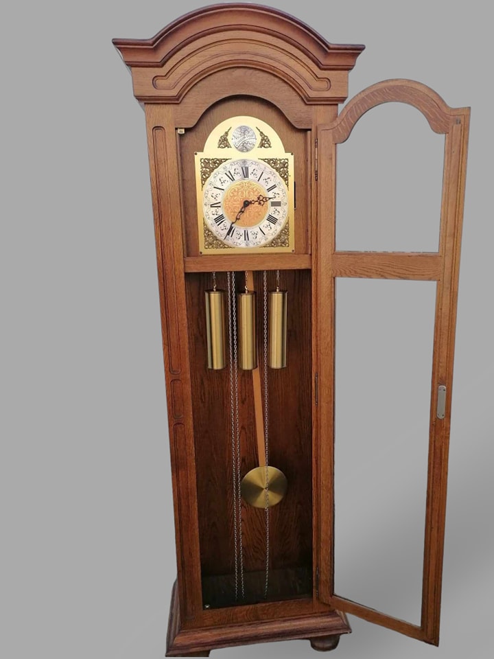 Eladó állóra szép állapotban. Három súlyos fém szerkezettel szerelt, amely negyed óránként dallamot játszik, illetve egészkor üti az órák számát (kikapcsolható). Letisztult tölgyfa tokban található a szerkezet, amelyben középen helyezkedbek el a súlyok, illetve az inga. Különlegessége, hogy oldalt is üveges a tok, igy minden oldalról bele látni. A szoba éke lehet az óra, amely leszervizelt állapotban kerül átadásra. Méret: 64x32x197 cm.