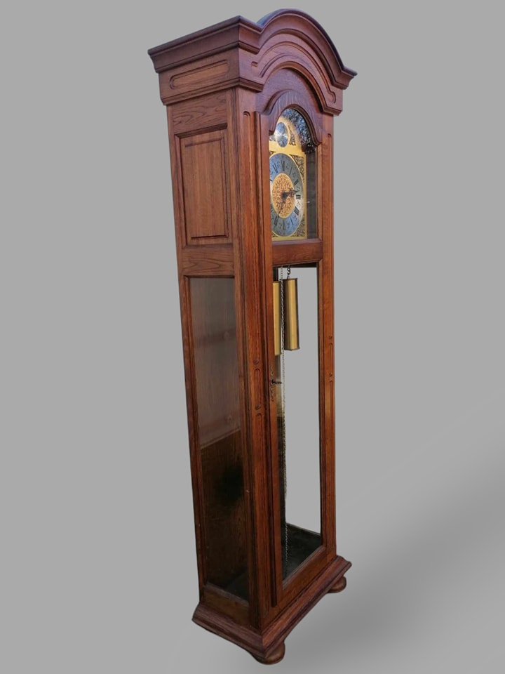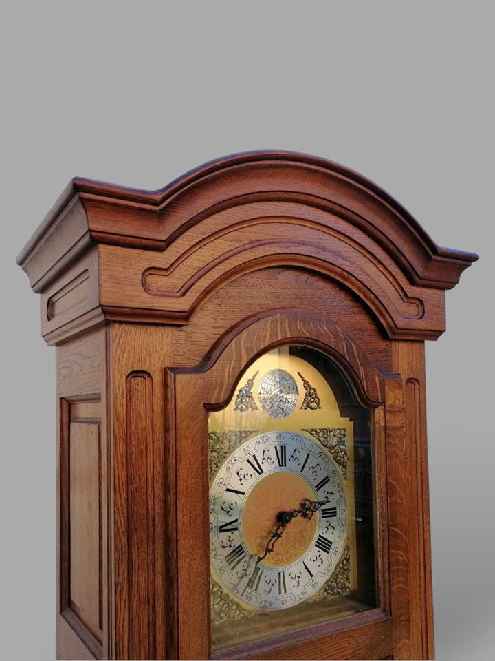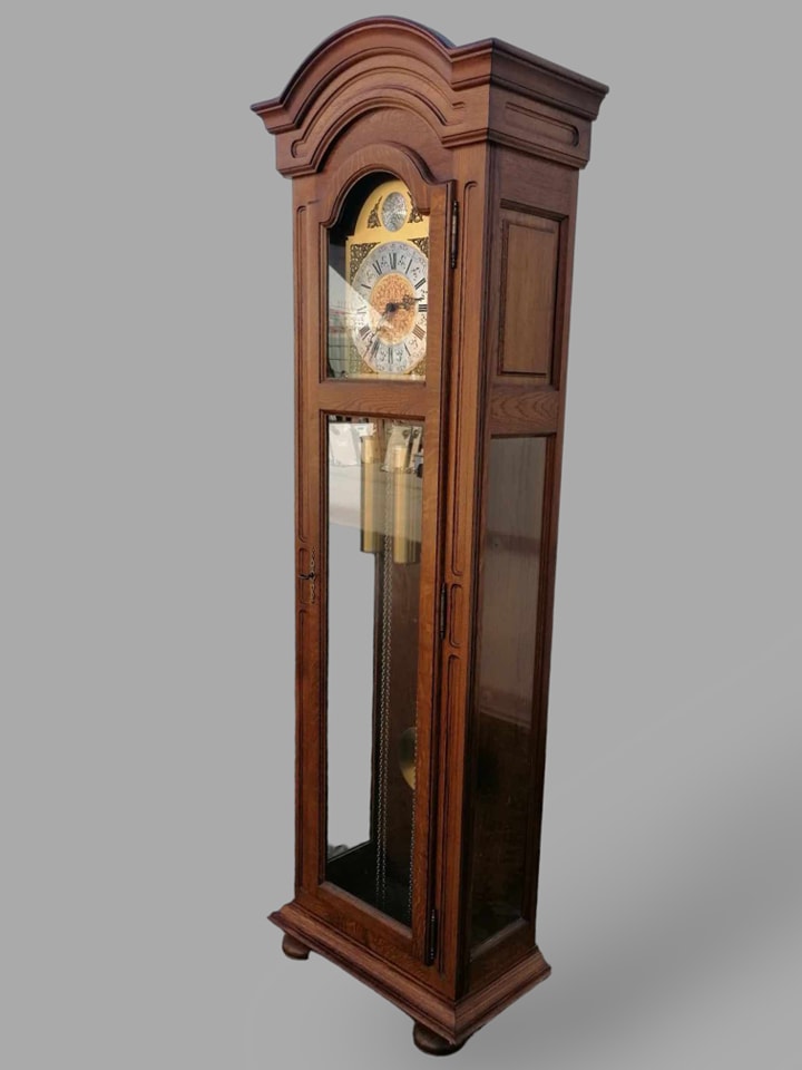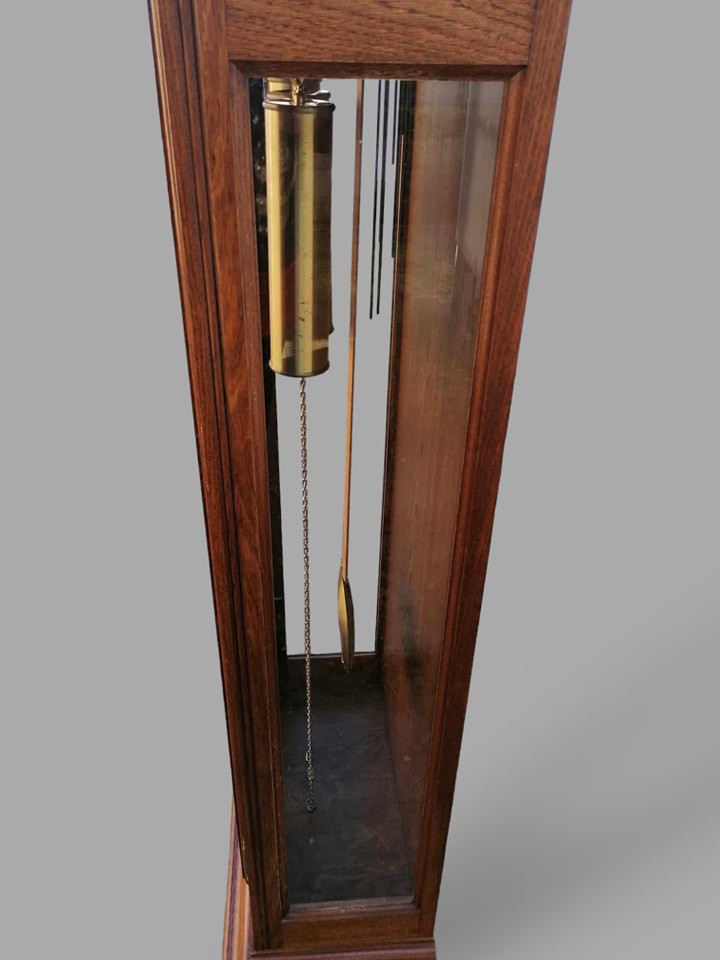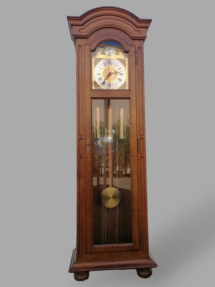 Eladó állóra szép állapotban. Három súlyos fém szerkezettel szerelt, amely negyed óránként dallamot játszik, illetve egészkor üti az órák számát (kikapcsolható). Letisztult tölgyfa tokban található a szerkezet, amelyben középen helyezkedbek el a súlyok, illetve az inga. Különlegessége, hogy oldalt is üveges a tok, igy minden oldalról bele látni. A szoba éke lehet az óra, amely leszervizelt állapotban kerül átadásra. Méret: 64x32x197 cm.
