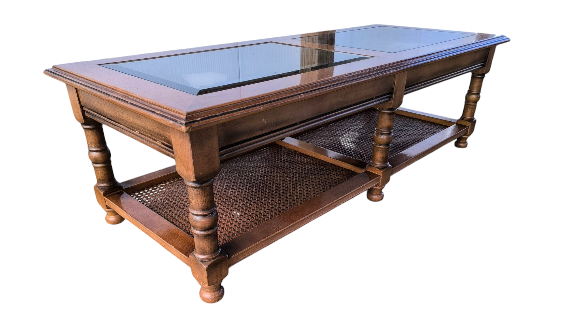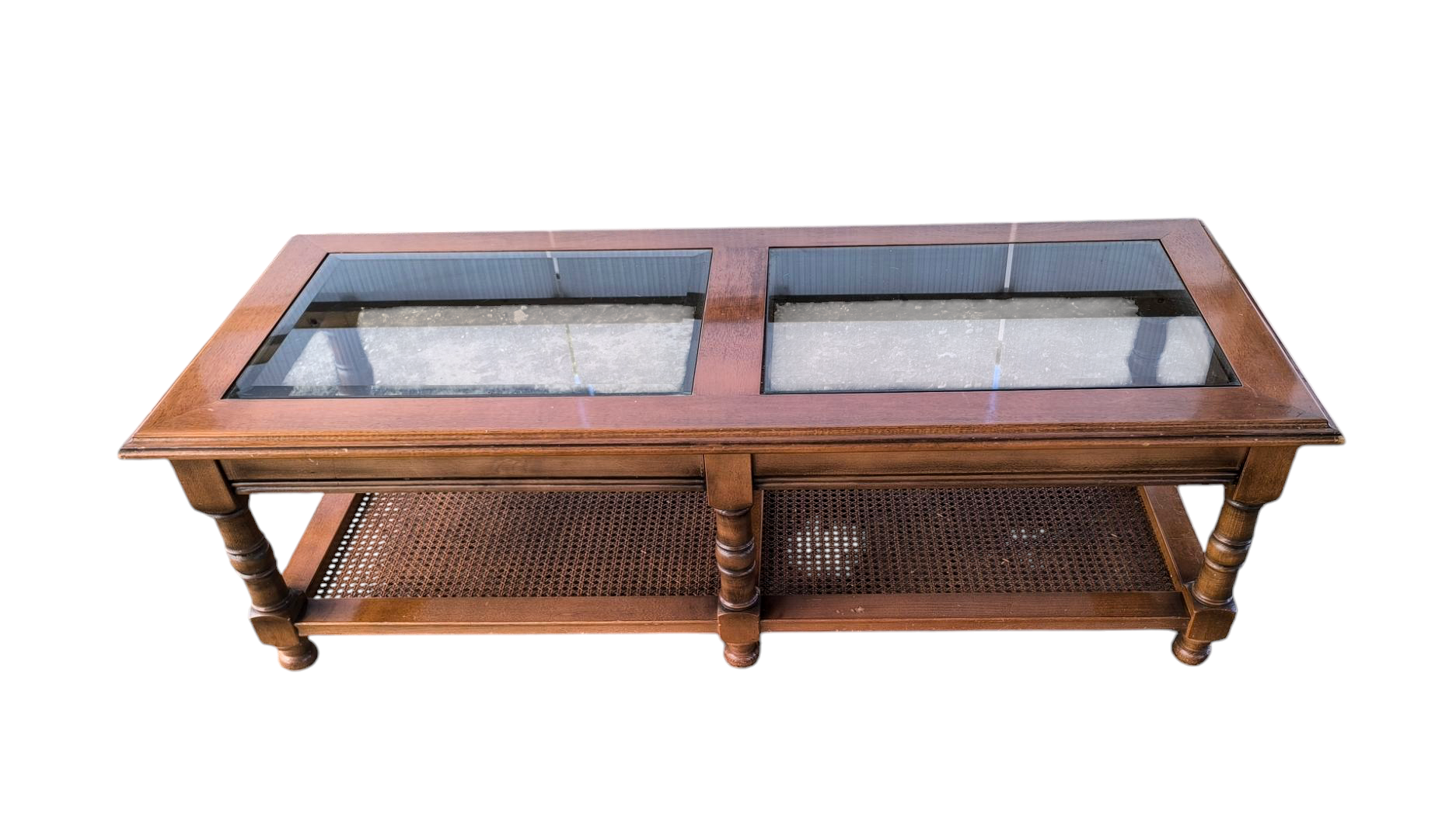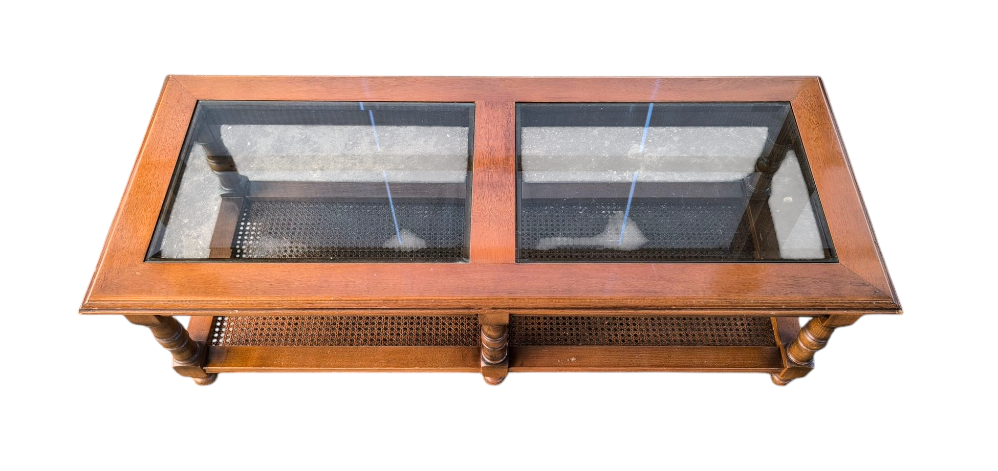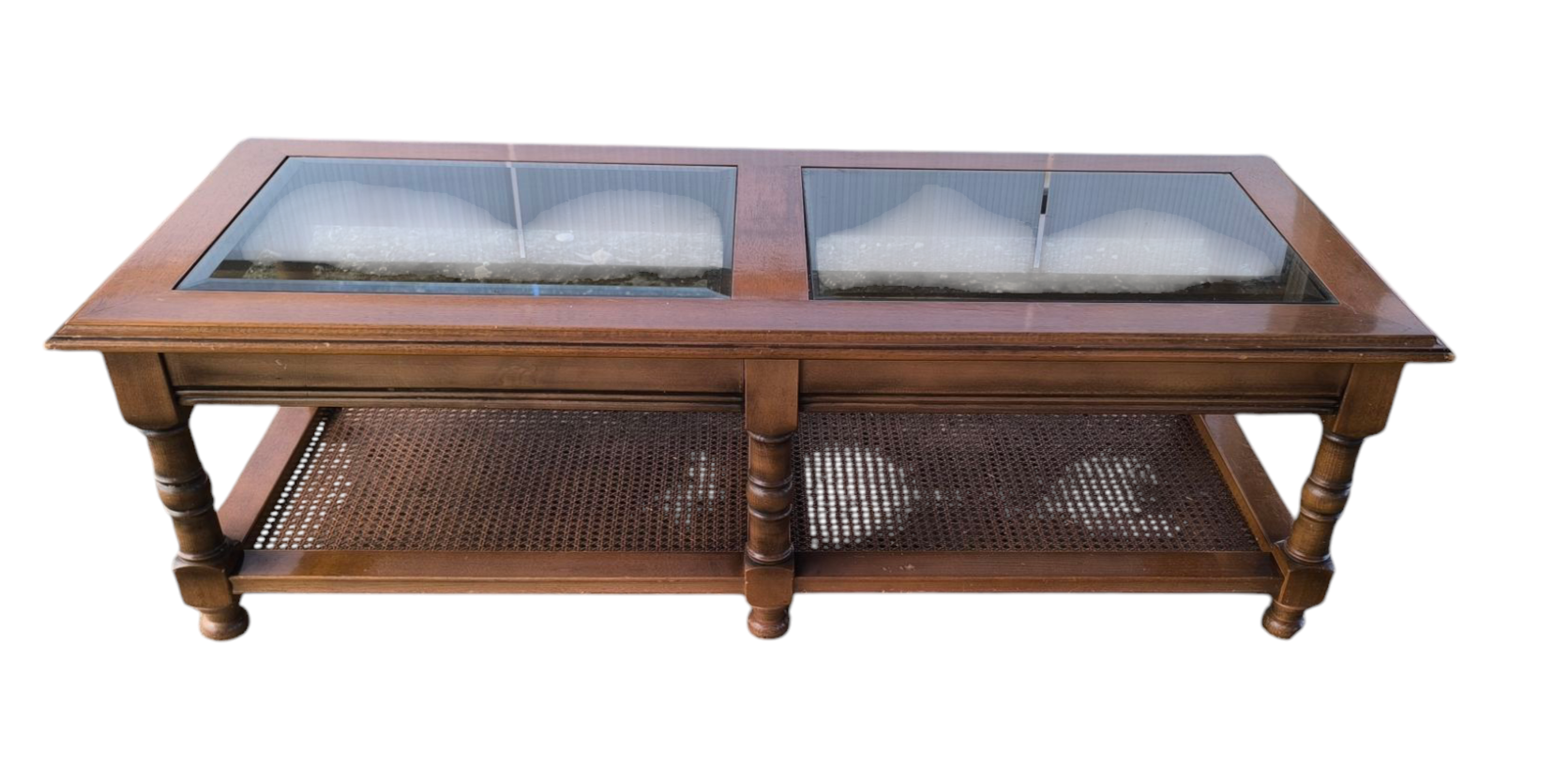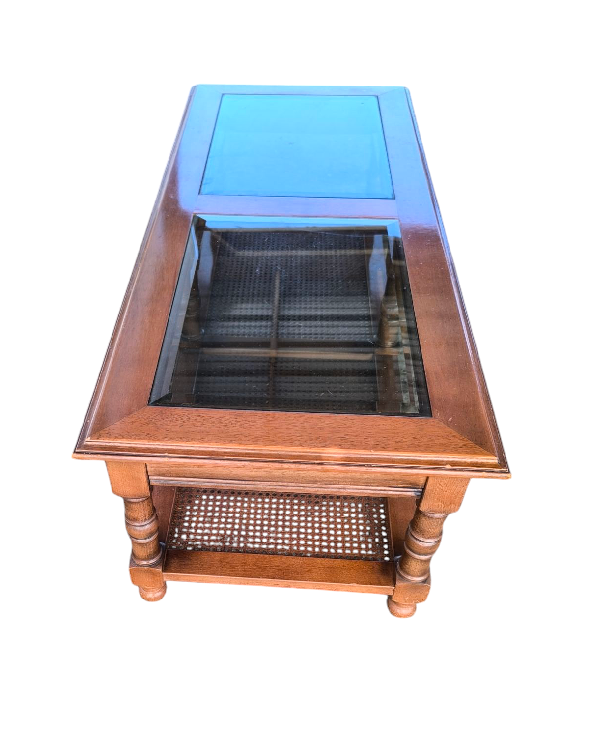 Eladó egy üveglapos dohányzóasztal . 2 db csiszolt szélű üveg lappal ,rattan betéttel.